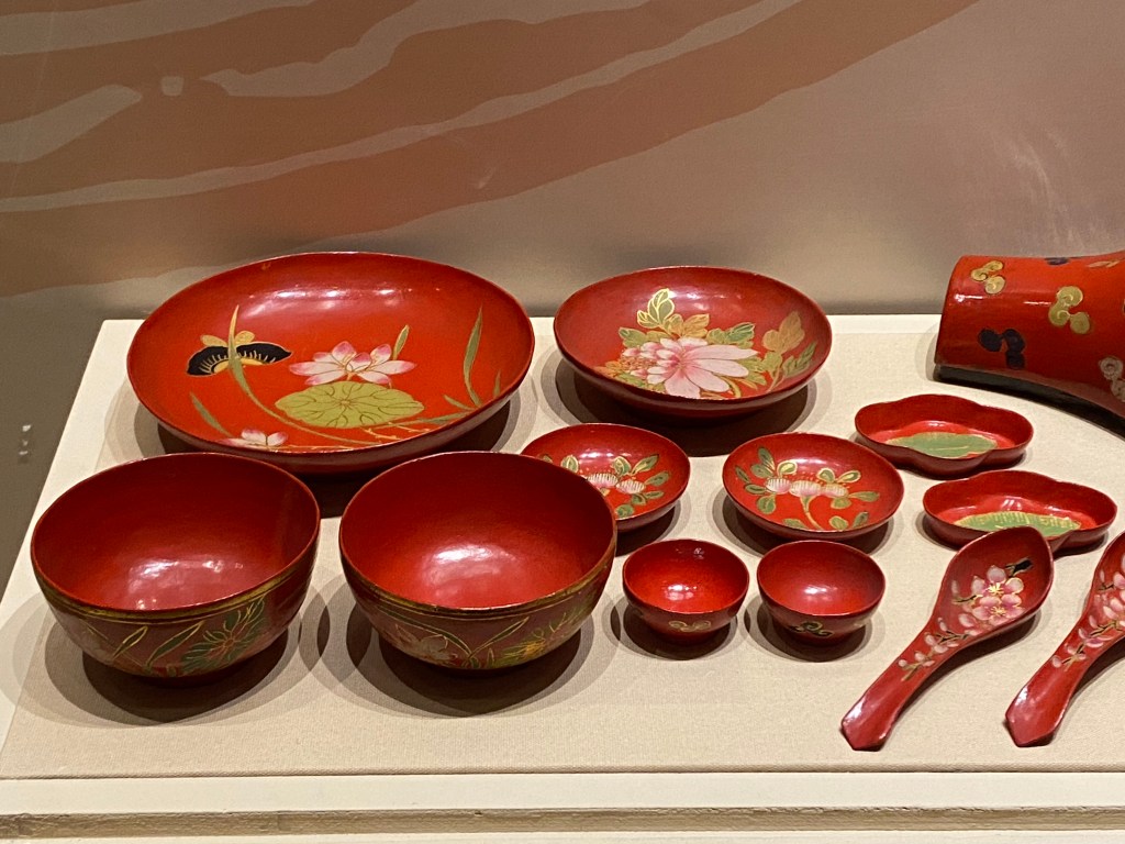Ou ce service de table, enfermé dans une boîte laquée qui vaut à elle seule le détour. De couleur rouge, celle des meilleurs auspices ici, elle montre des ustensiles raffinés qui donnent envie de finir les plats pour voir les motifs cachés !