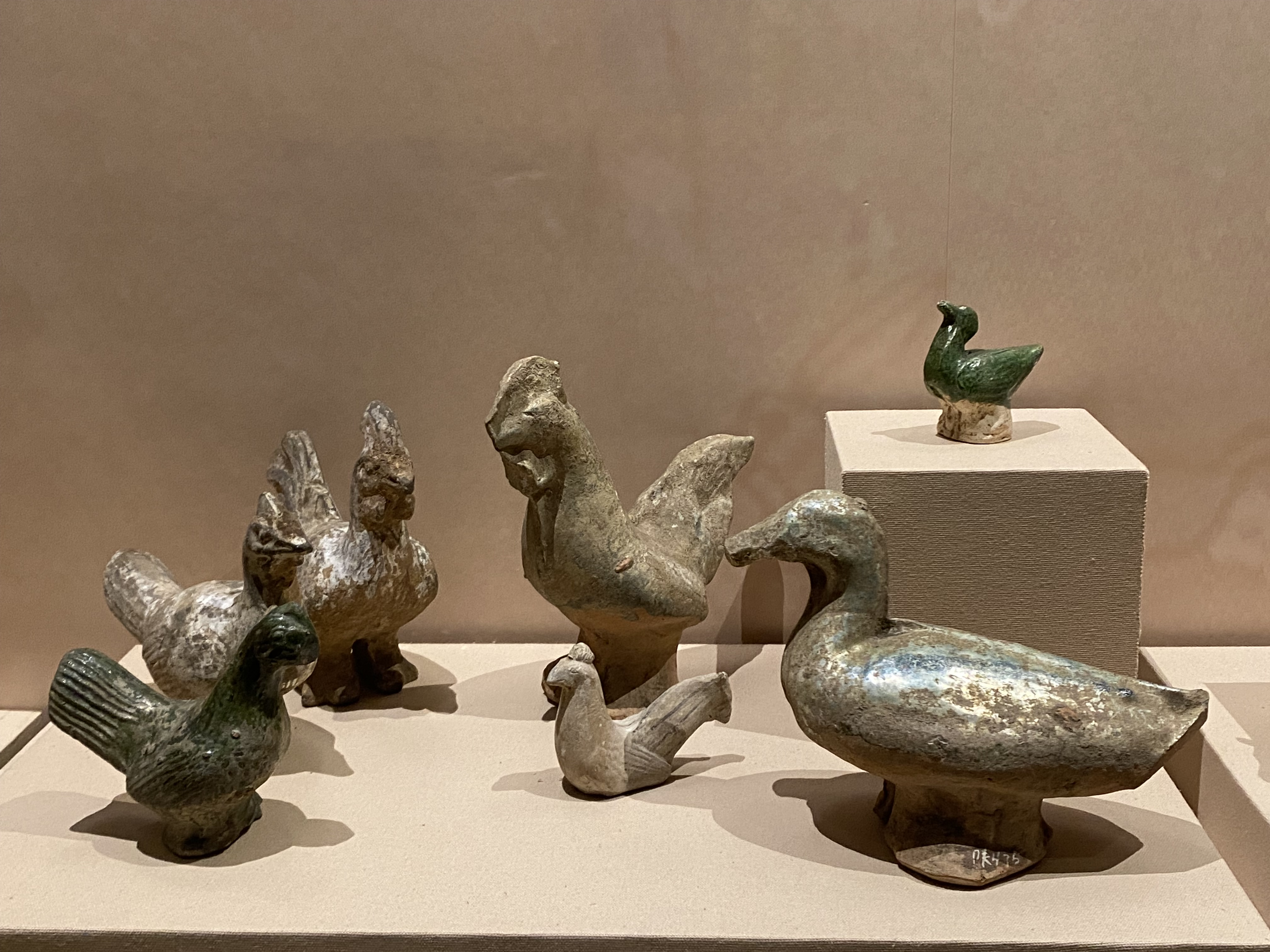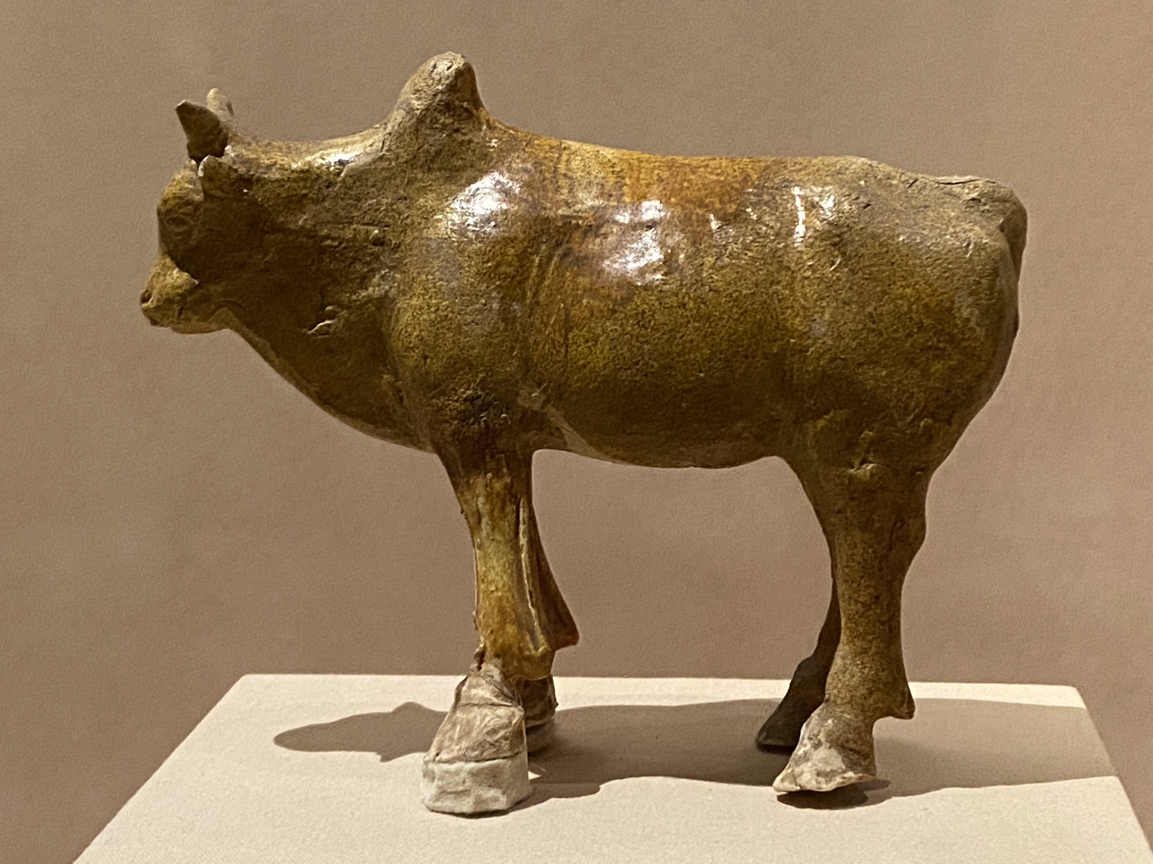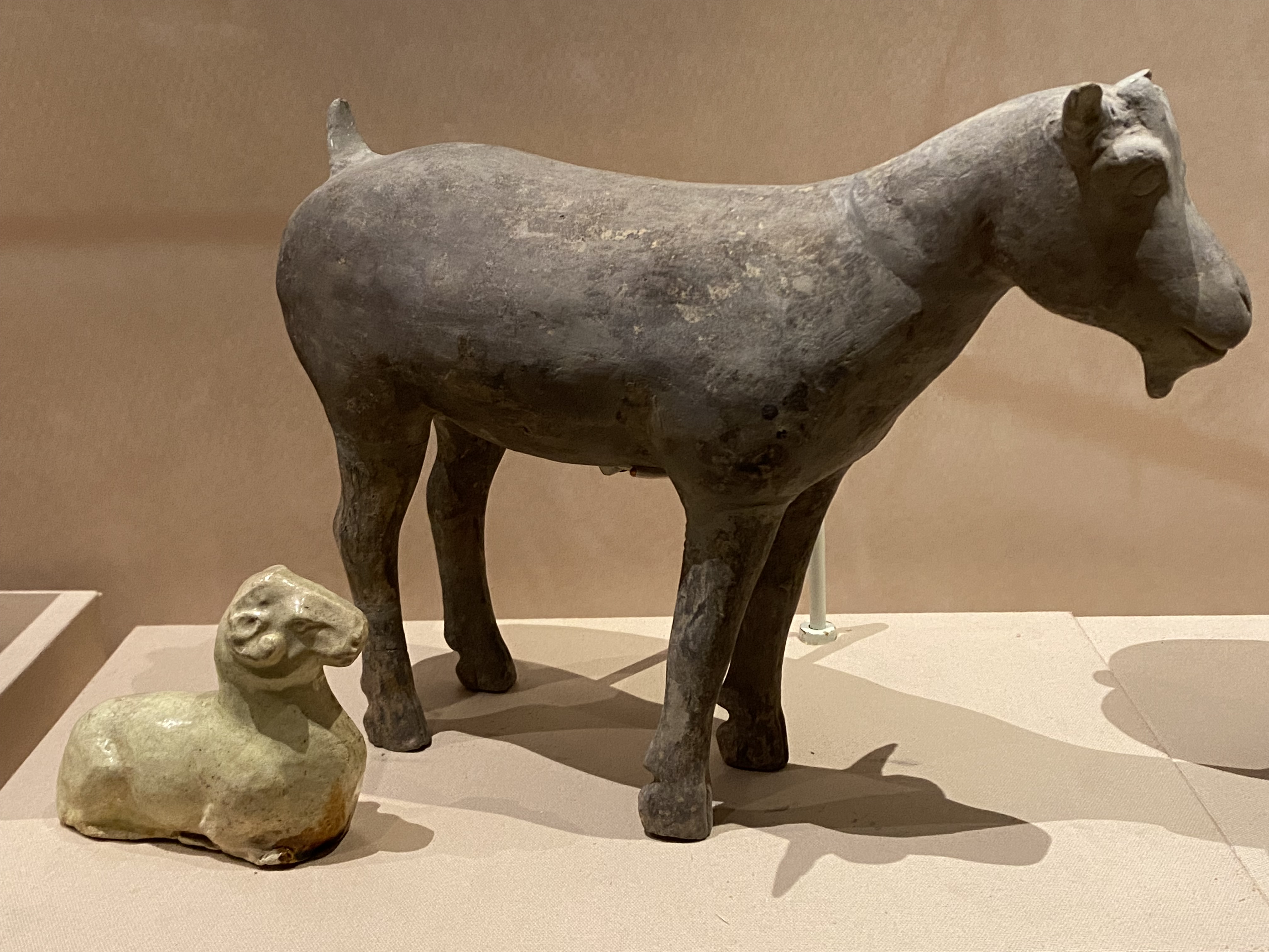 Vient ensuite la section consacrée aux animaux (ami vegan, passe ce paragraphe, qui peut te heurter…). Dans la Chine ancienne existaient six espèces d’animaux domestiques, destinées aux travaux des champs, mais aussi à la nourriture, les vaches et boeufs, les moutons, les volailles, les cochons, les chevaux (plutôt utilisés pour le transport) et les chiens. Boeufs, cochons et moutons étaient également utilisés lors de sacrifices. Je ponctuerai mes propos érudits (de fraîche date) de ces très beaux objets qui illustraient l’exposition.