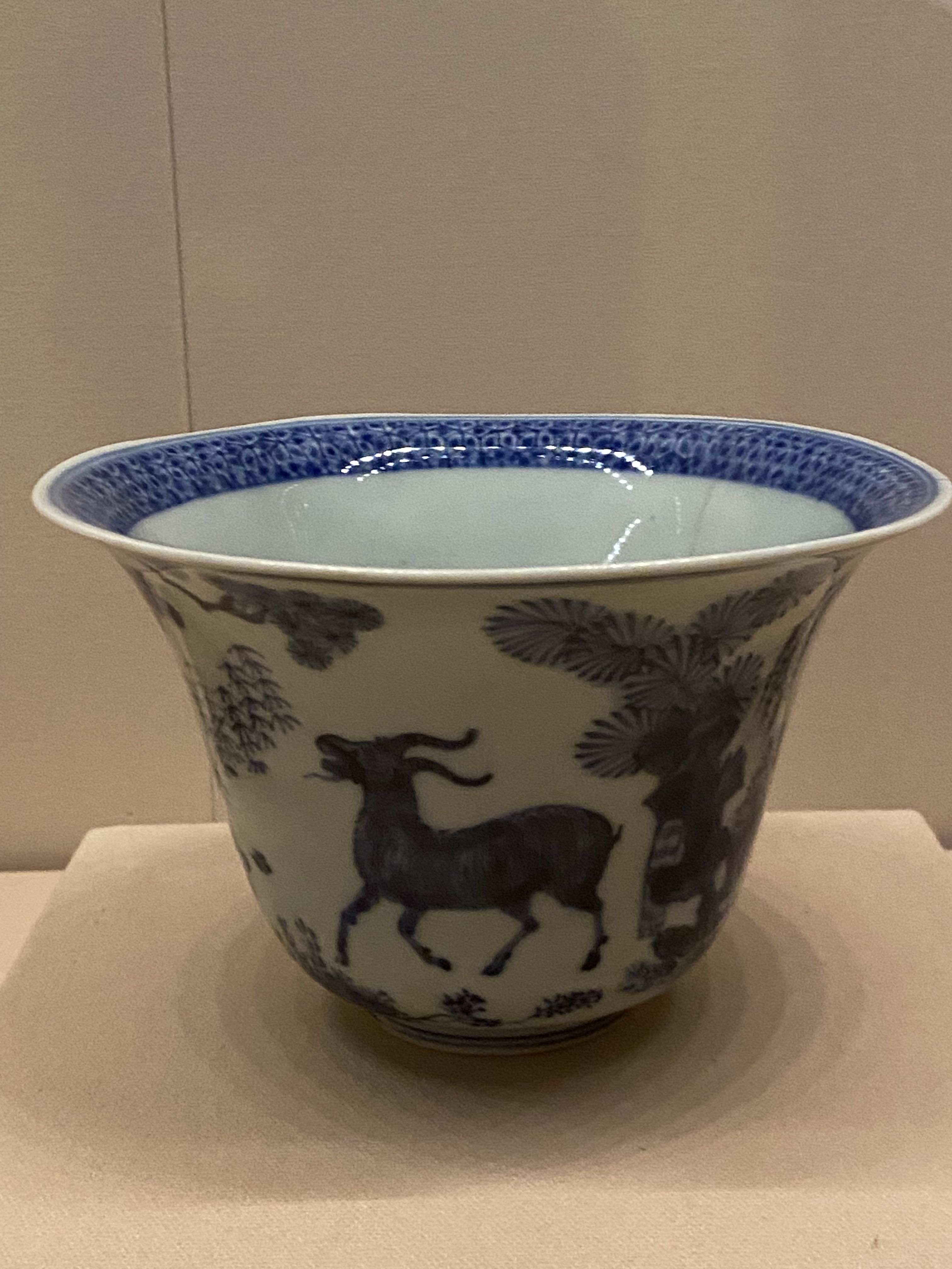 Beauté évidente d’une coupe ornée d’un bouc (dionysiaque ?), croisée au passage, tonalités de blanc et bleu que nous associons volontiers à l’époque Ming.