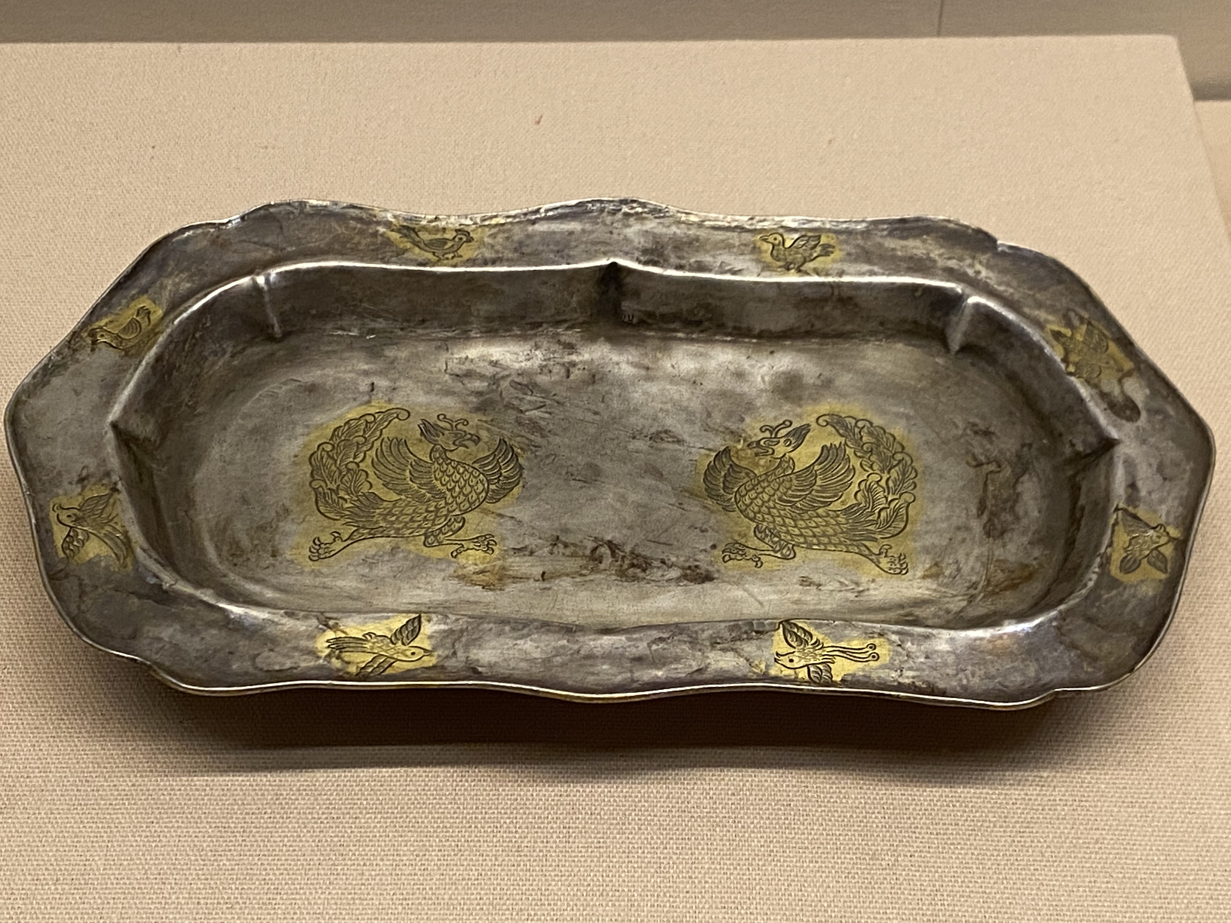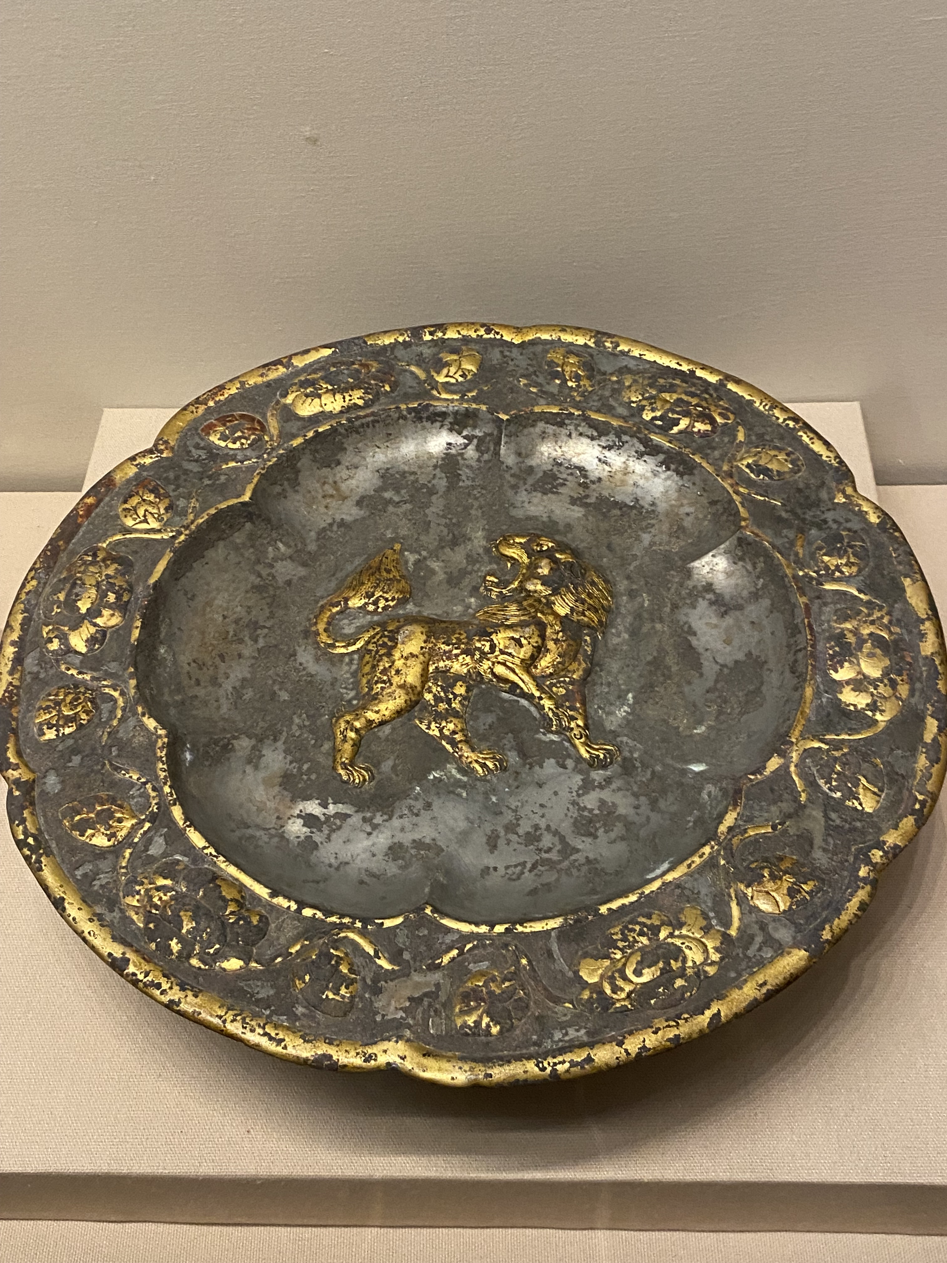 La dernière section de l’exposition nous montre de très beaux objets dédiés à la cuisine, dans ses différentes dimensions, préparation, cuisson et service. Dont les deux qui suivent, bronze et or et or et argent, de la vaisselle raffinée ornée d’animaux précieux, voire presque inconnus (le lion).