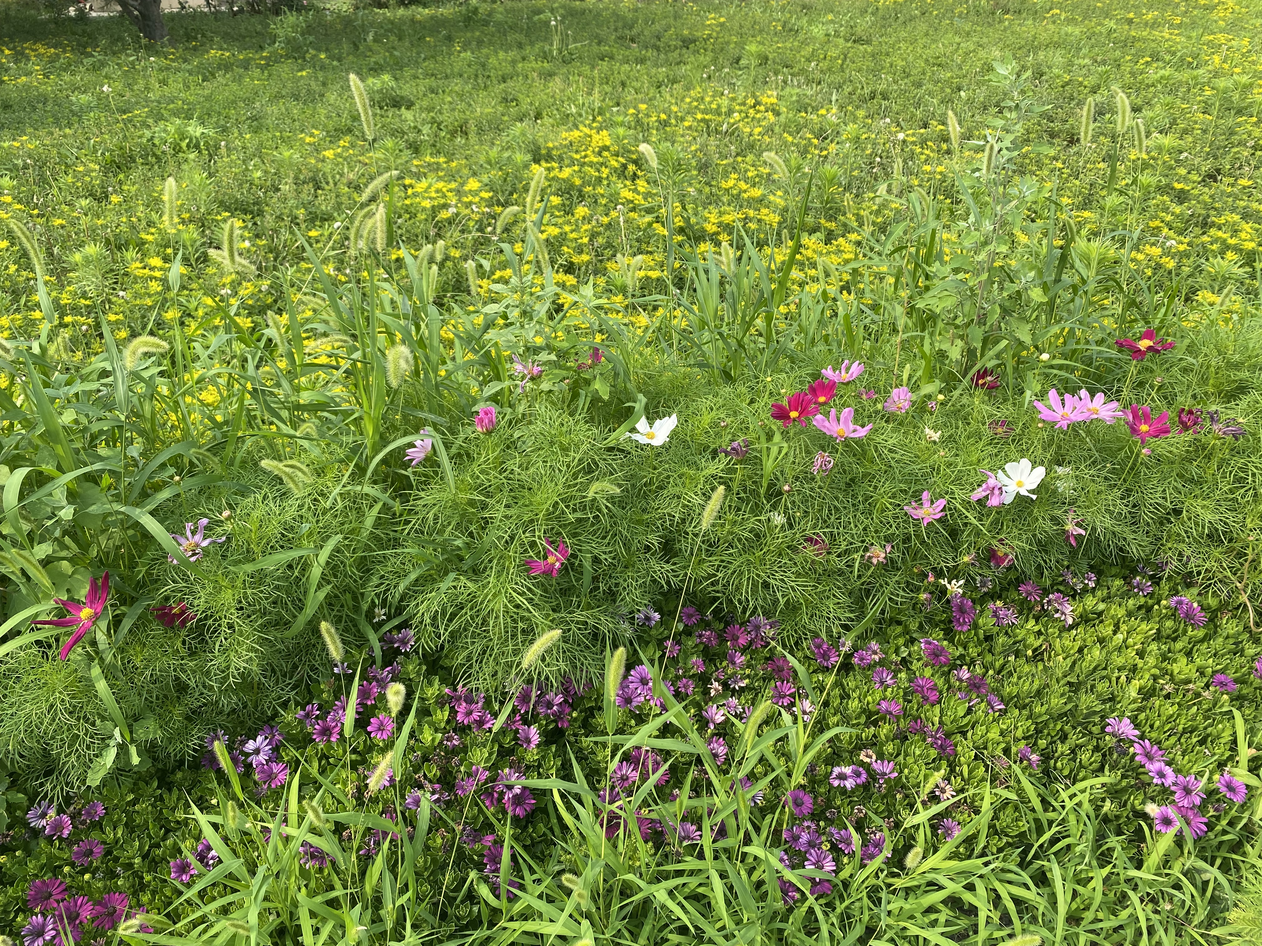 J’ai été étonnée, vu l’accablante chaleur, de trouver des fleurs qui respirent encore. Mais oui ! Les cosmos avec leurs nuances violettes et toutes ces autres fleurs que je saurais nommer, portaient haut les couleurs de la nature.