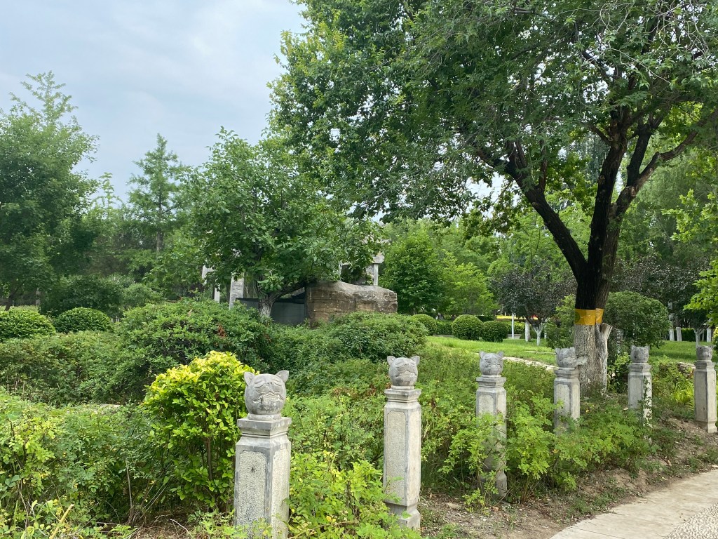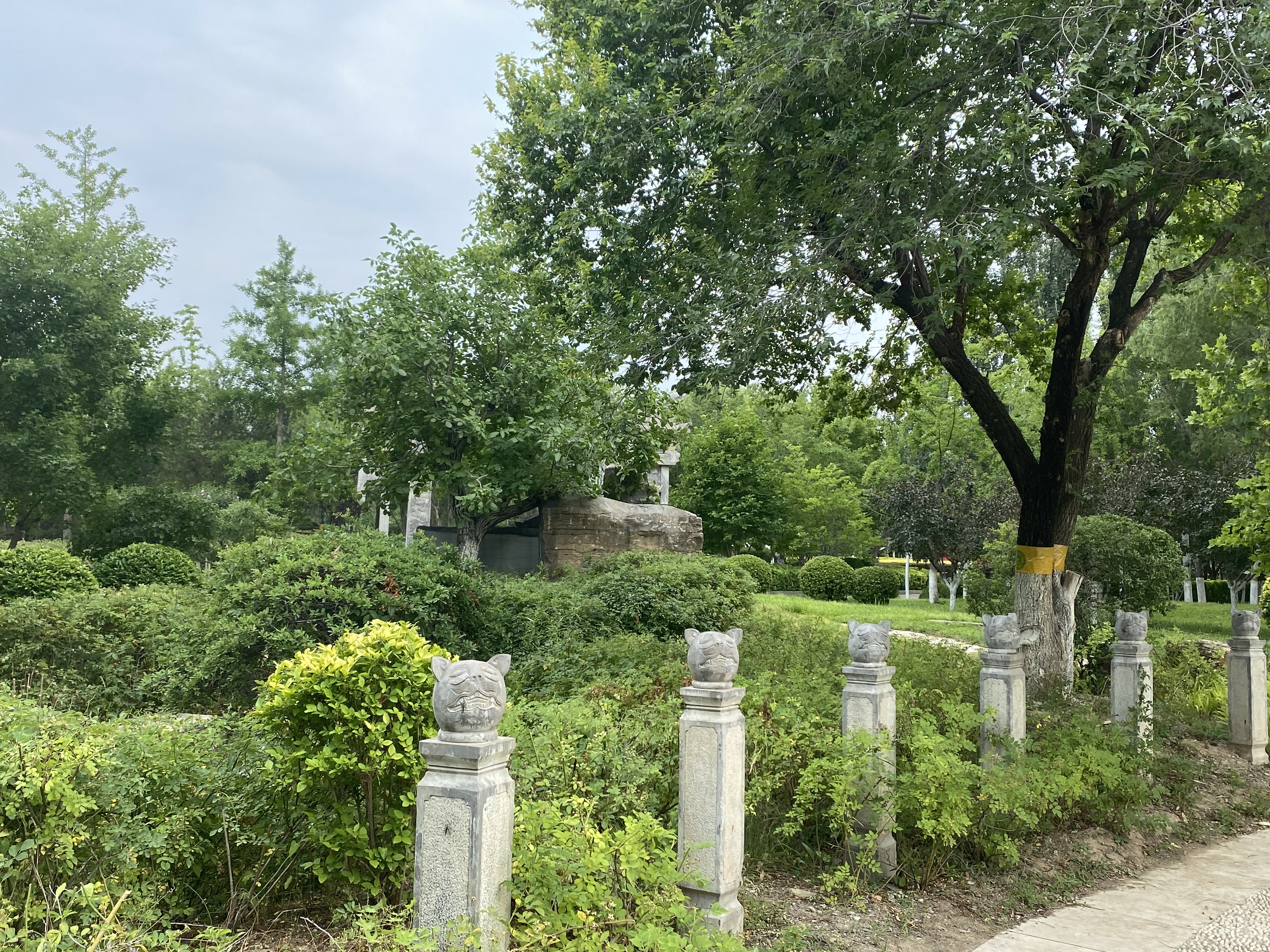 Le jardin de Guiyang, capitale du Guizhou, dévoile un portique et des statues de granit, bordées de fleurs roses. Et surtout ces curieux piliers à tête de félin, à l’expression immuable.