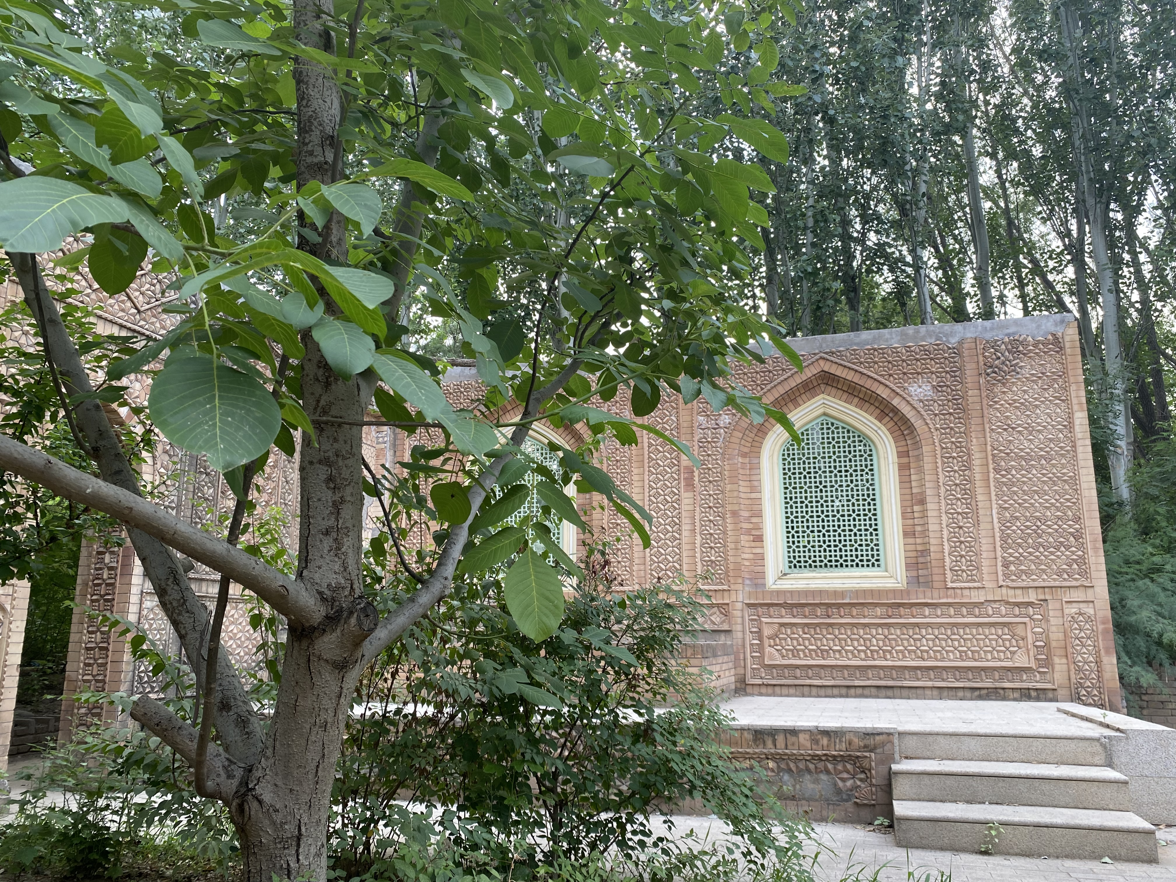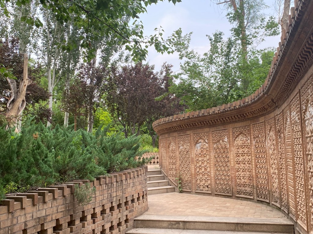 Le jardin d’Urumqi nous accueille en face du précédent. Nous sommes dans l’oeil du cyclone car c’est la préfecture du Xinjiang, province sur laquelle tous les projecteurs occidentaux sont braqués. Restons en à une promenade sans arrière-pensée, à cette architecture musulmane qui se révèle sous la belle nature. J’ai apprécié de cheminer dans ces sinuosités de pierre ocre, bordée de ces arbres rebelles…