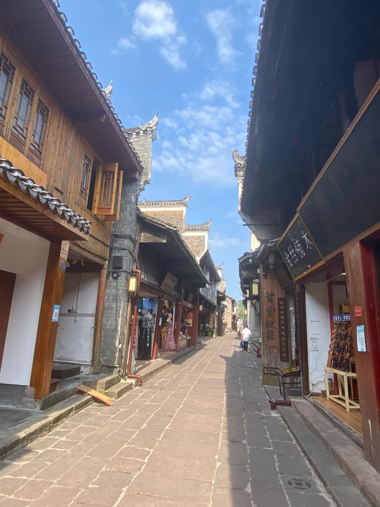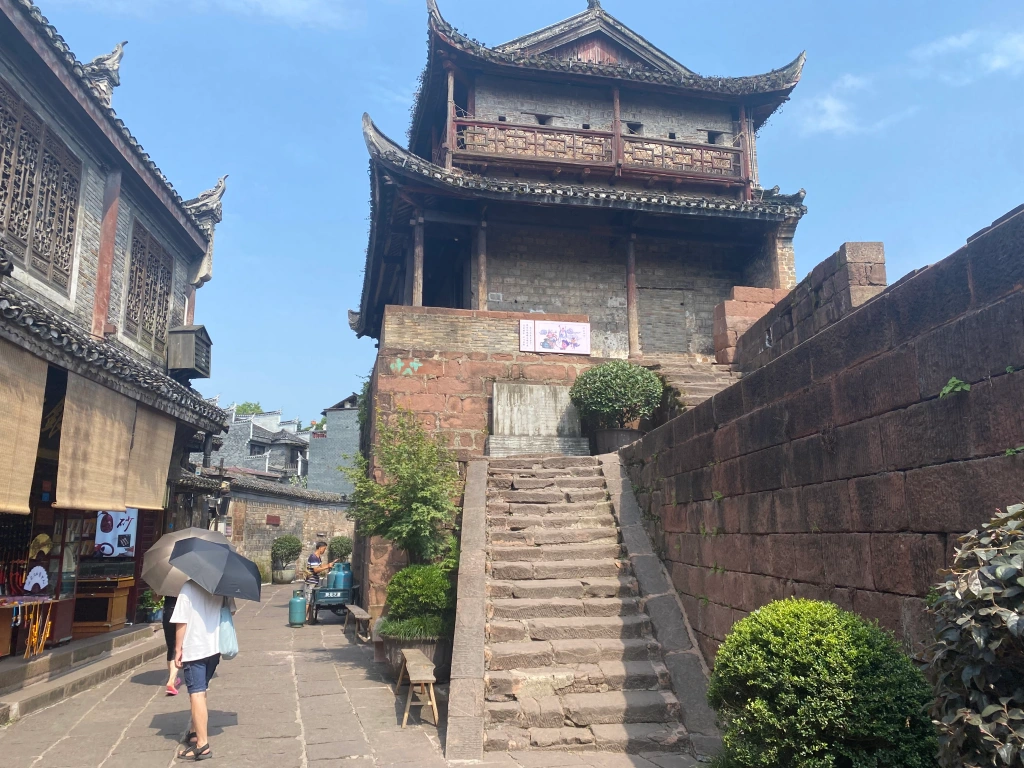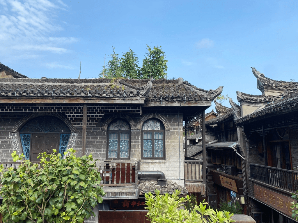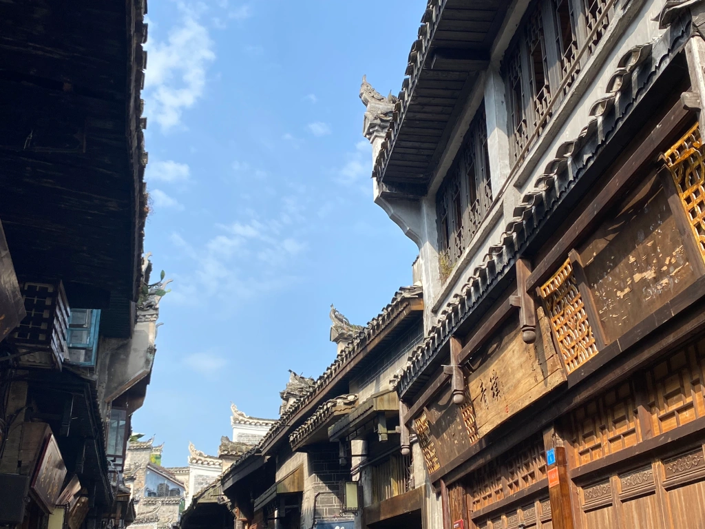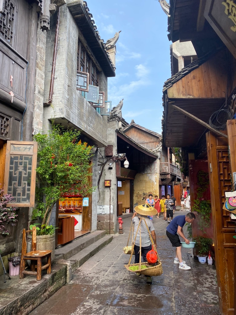 La ville s’organise autour de la rivière Tuojiang (沱江镇), qui coule sur plus de 650 kilomètres au travers de la province du Sichuan, avant de se jeter dans le fleuve Yangtze (l’ancien « Fleuve bleu »). Elle accompagne tous ces bâtiments de sa beauté fluviale, toutes ces maisons qui se sont nichées contre elle en échange de la fraîcheur de l’eau et de déplacements plus rapides sur son cours.