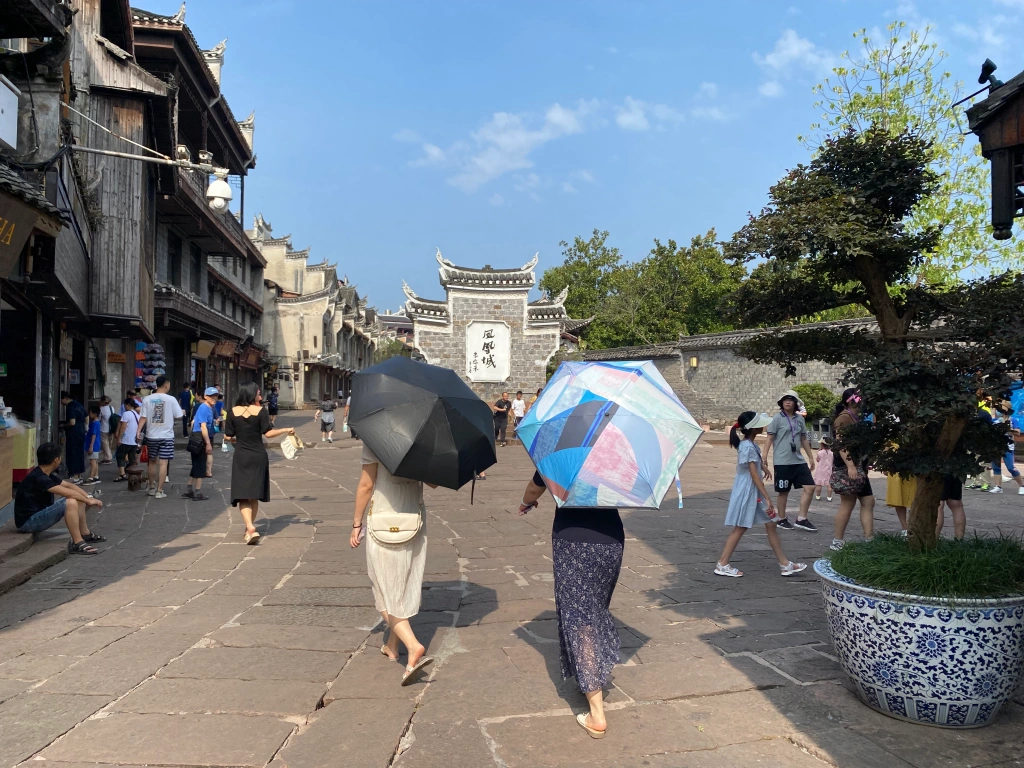 Revenons à notre découverte. La ville est entourée de remparts anciens aux tours imposantes, qui sont bien belles dans le bleu du ciel et ne font même presque plus peur. Nous croisons des gens aux parapluies transformés en parasoleil, tellement il est essentiel de garder une peau claire, la peau foncée renvoyant à ces travailleurs manuels dont je vous ai donné un aperçu juste avant. C’est donc un indice de classe, comme sous nos latitudes où jusqu’au milieu du XXe siècle, laisser sa peau devenir brune était impensable, comme une déchéance. Ici, nous sommes comme presque un siècle en arrière dans cette conception, alors que nous avons franchi cette limite sociale et que maintenant, bronzer ou ne pas bronzer est devenu une question de santé. Je n’irai pas plus loin sur le sujet, je vous renvoie à un autre article sur mon blog : https://rue2provence.com/2021/06/01/pekin-soleil-太阳-2021/.