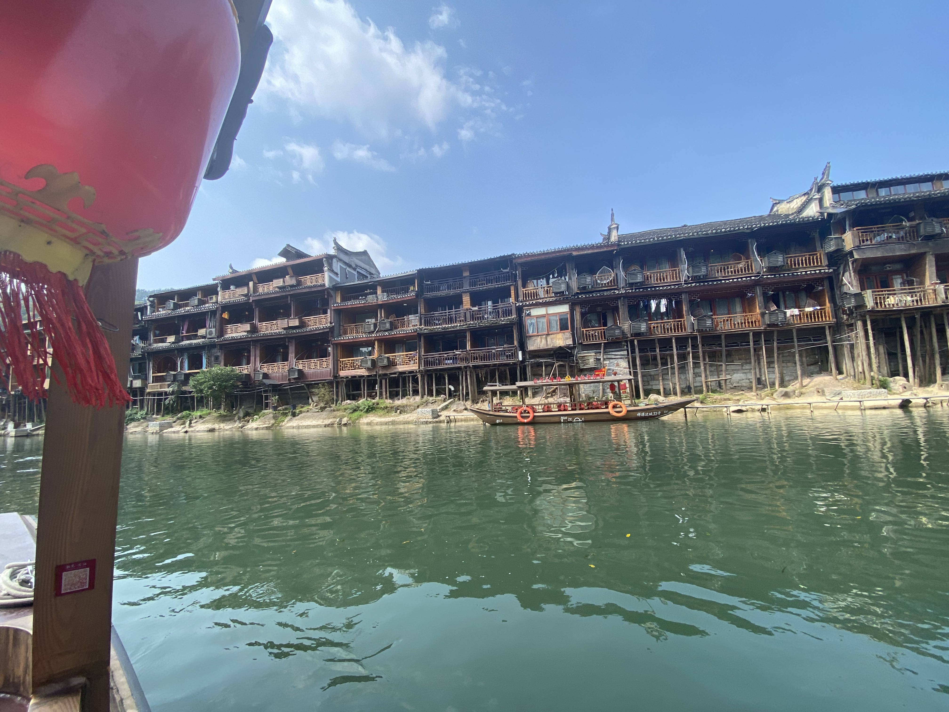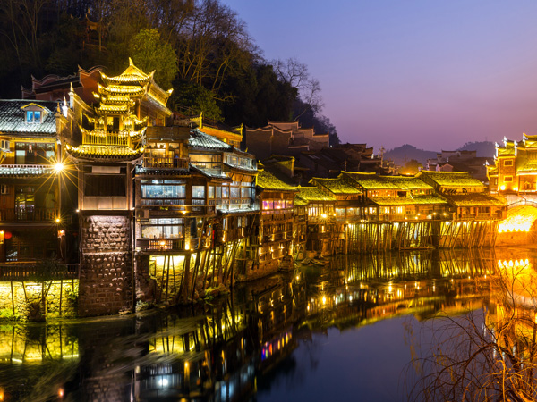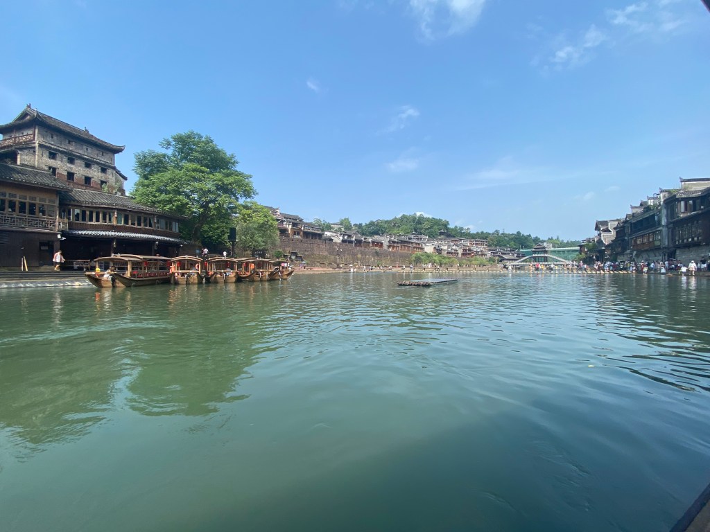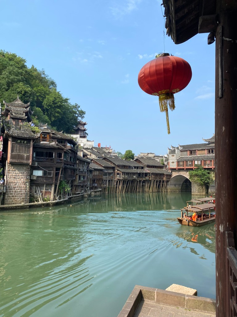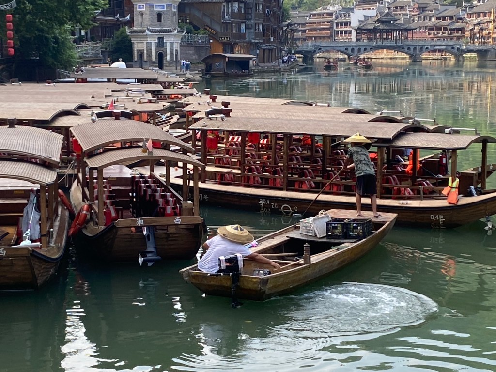 L’ancienne ville de Fenghuang (Phénix) est la dernière étape de notre voyage dans le Hunan, cette province du centre de la Chine. Bâtie en 1704, elle garde quelque chose de très authentique (dans ce pays qui modernise à tout va) et a d’ailleurs été proposée à l’UNESCO pour inscription au patrimoine en 2008. Ici les habitants se sont retirés de la partie ancienne pour aller habiter dans une nouvelle ville que nous ne verrons pas ; cela en fait une ville musée, nous le regretterions sous nos cieux, ici c’est une assurance de préservation du patrimoine appréciable, quand nous voyons comment les autochtones peuvent défigurer des villes entières pour les moderniser.