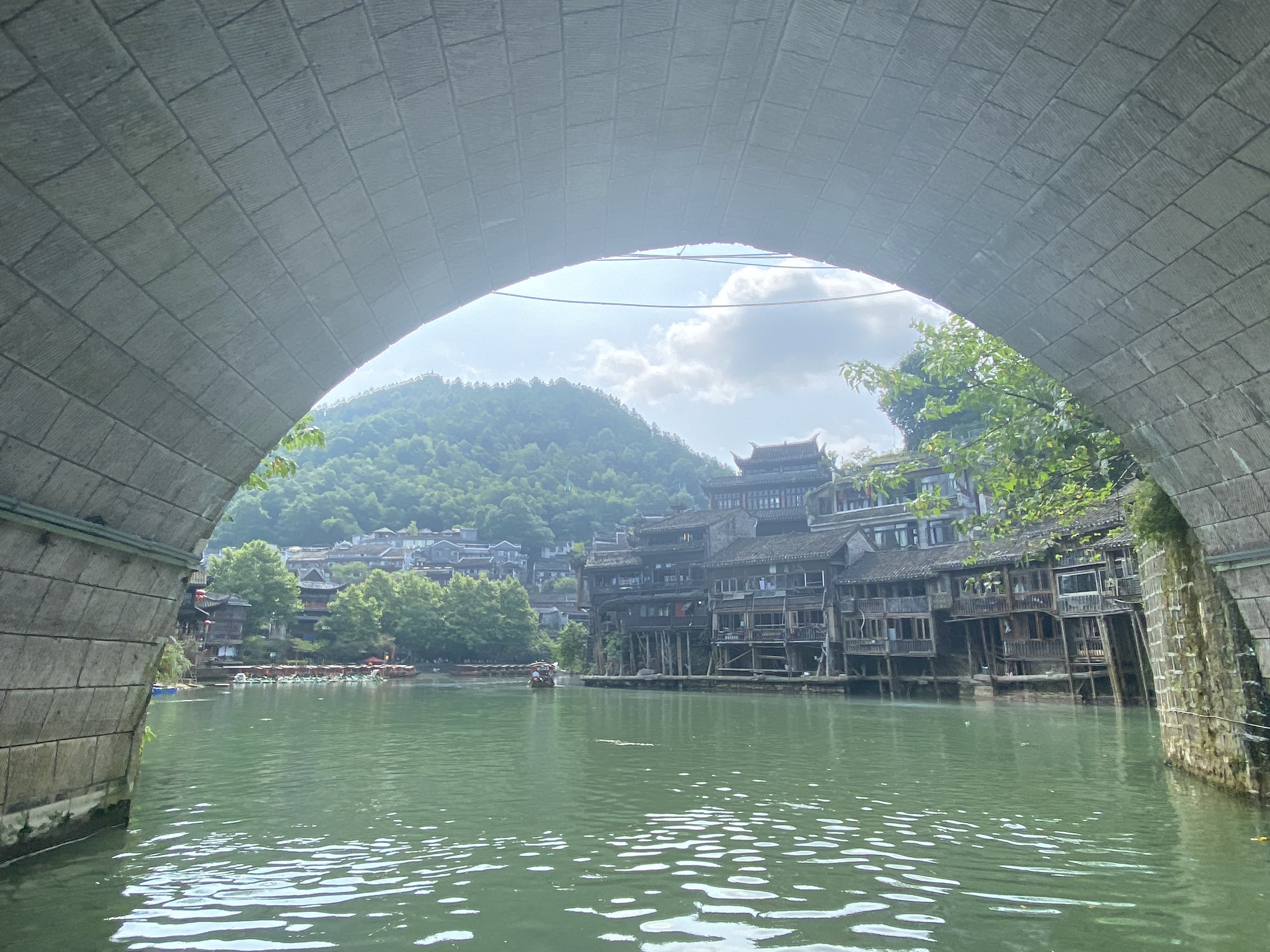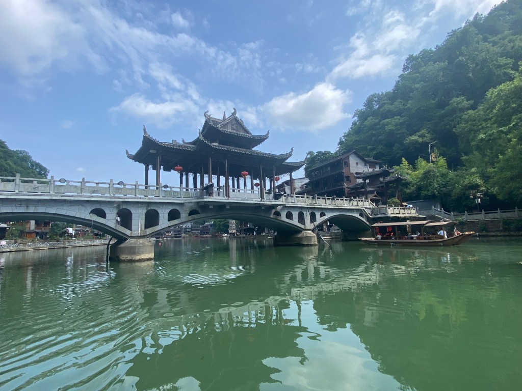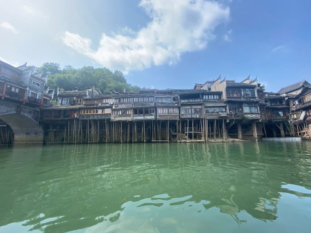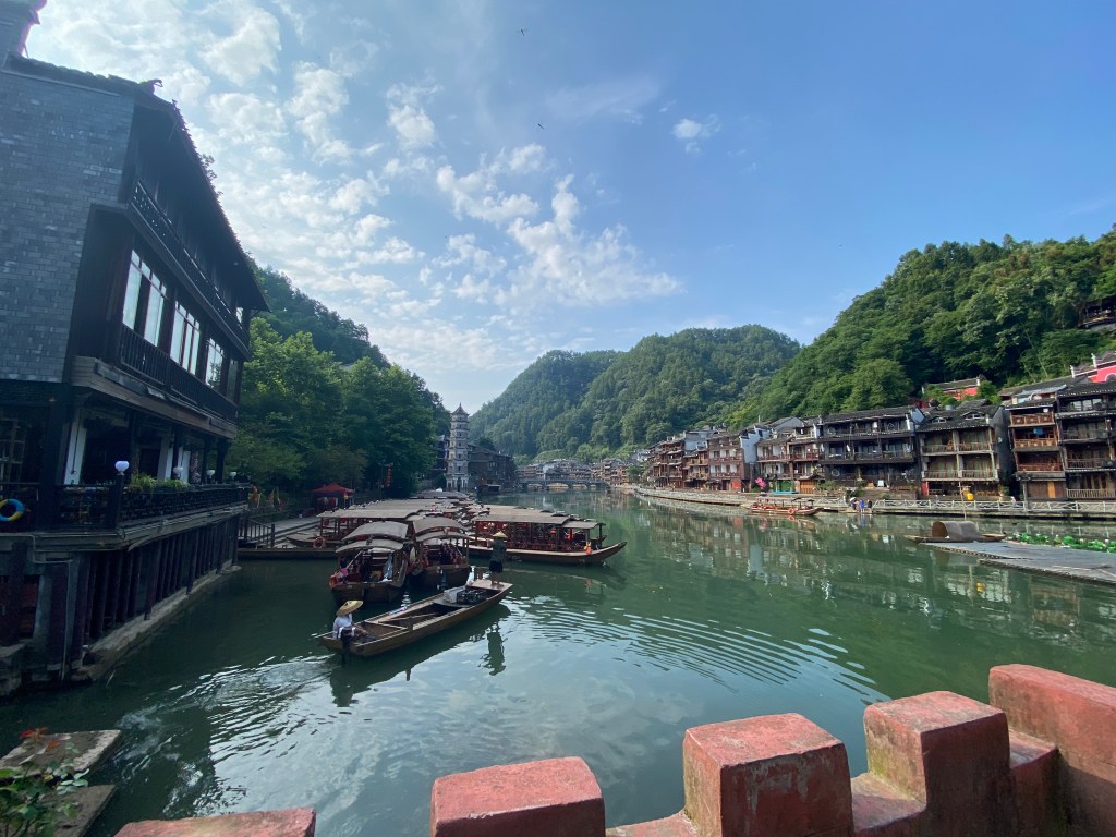 L’ancienne ville de Fenghuang (Phénix) est la dernière étape de notre voyage dans le Hunan, cette province du centre de la Chine. Bâtie en 1704, elle garde quelque chose de très authentique (dans ce pays qui modernise à tout va) et a d’ailleurs été proposée à l’UNESCO pour inscription au patrimoine en 2008. Ici les habitants se sont retirés de la partie ancienne pour aller habiter dans une nouvelle ville que nous ne verrons pas ; cela en fait une ville musée, nous le regretterions sous nos cieux, ici c’est une assurance de préservation du patrimoine appréciable, quand nous voyons comment les autochtones peuvent défigurer des villes entières pour les moderniser.