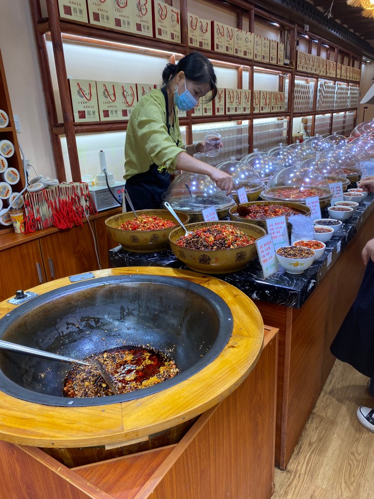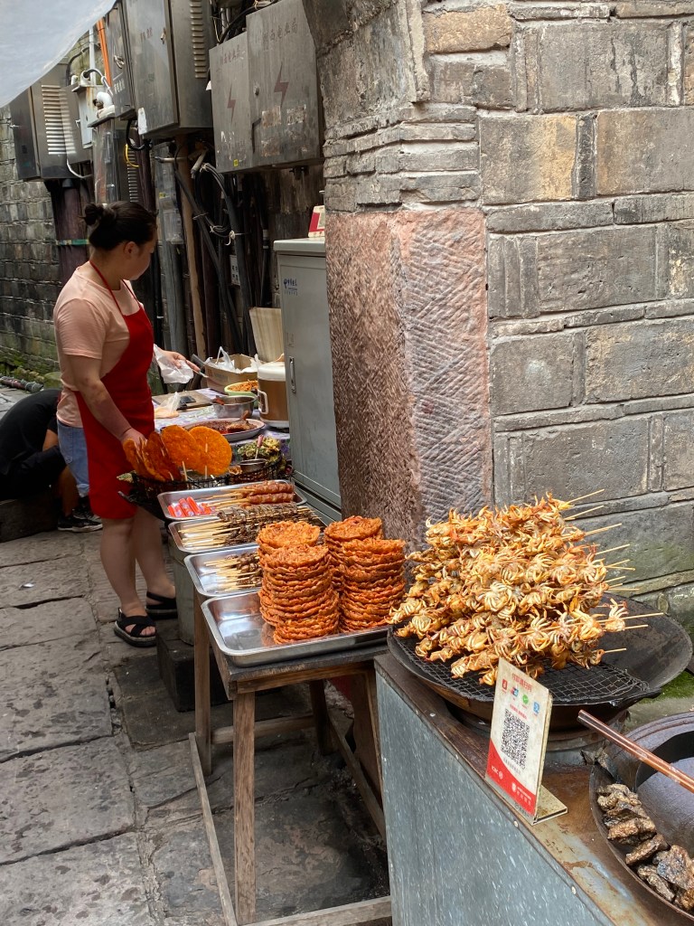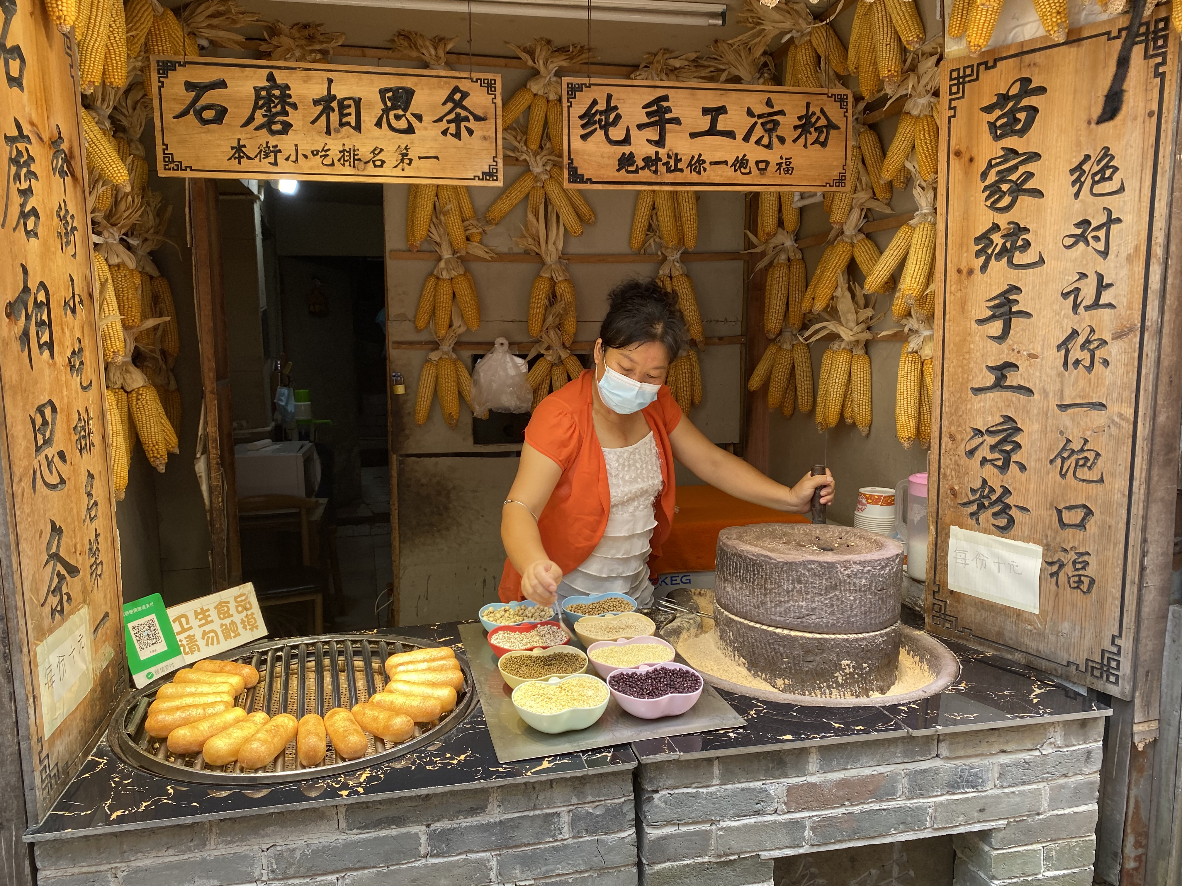 Déambuler dans ces rues anciennes nous amène un plaisir que nous ne connaissons plus à Pékin, celui de la cuisine de rue. C’est un plaisir que j’avais expérimenté en Asie, à Singapour ou à Kuala-Lumpur, toutes ces échoppes ouvertes qui vous vendent de la nourriture souvent excellente. En Chine, dès que nous sortons/pouvons sortir de Pékin, nous retrouvons cette simplicité des mets préparés avec des moyens limités, mais tellement savoureux.