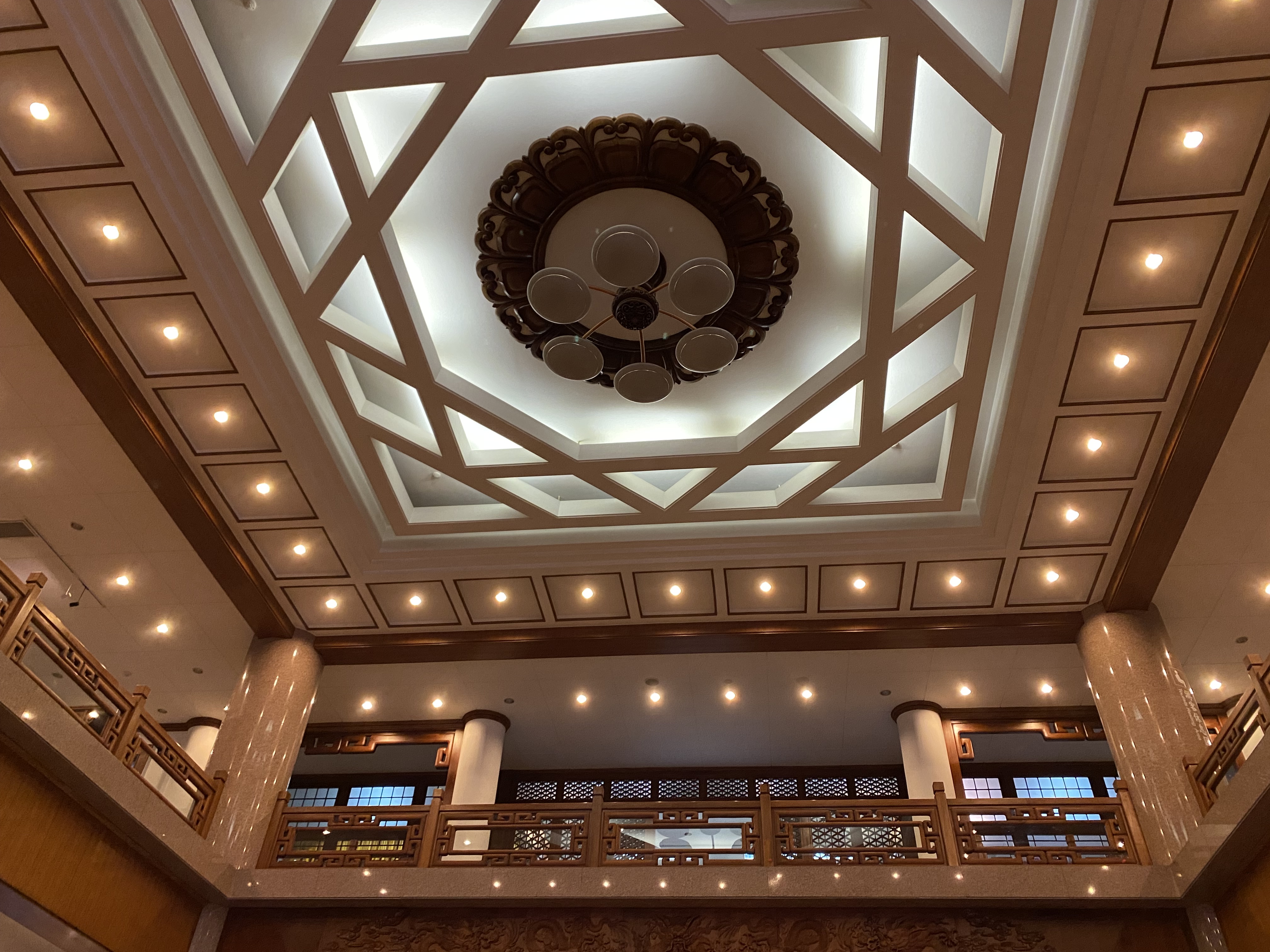 Le hall était déjà en lui-même une splendeur. Beauté des luminaires qui me surplombaient dans des entrelacs raffinés, et puis ce trône d’or tout à fait inédit et impressionnant (peut-être une reproduction, ici les cartons étaient rares…).