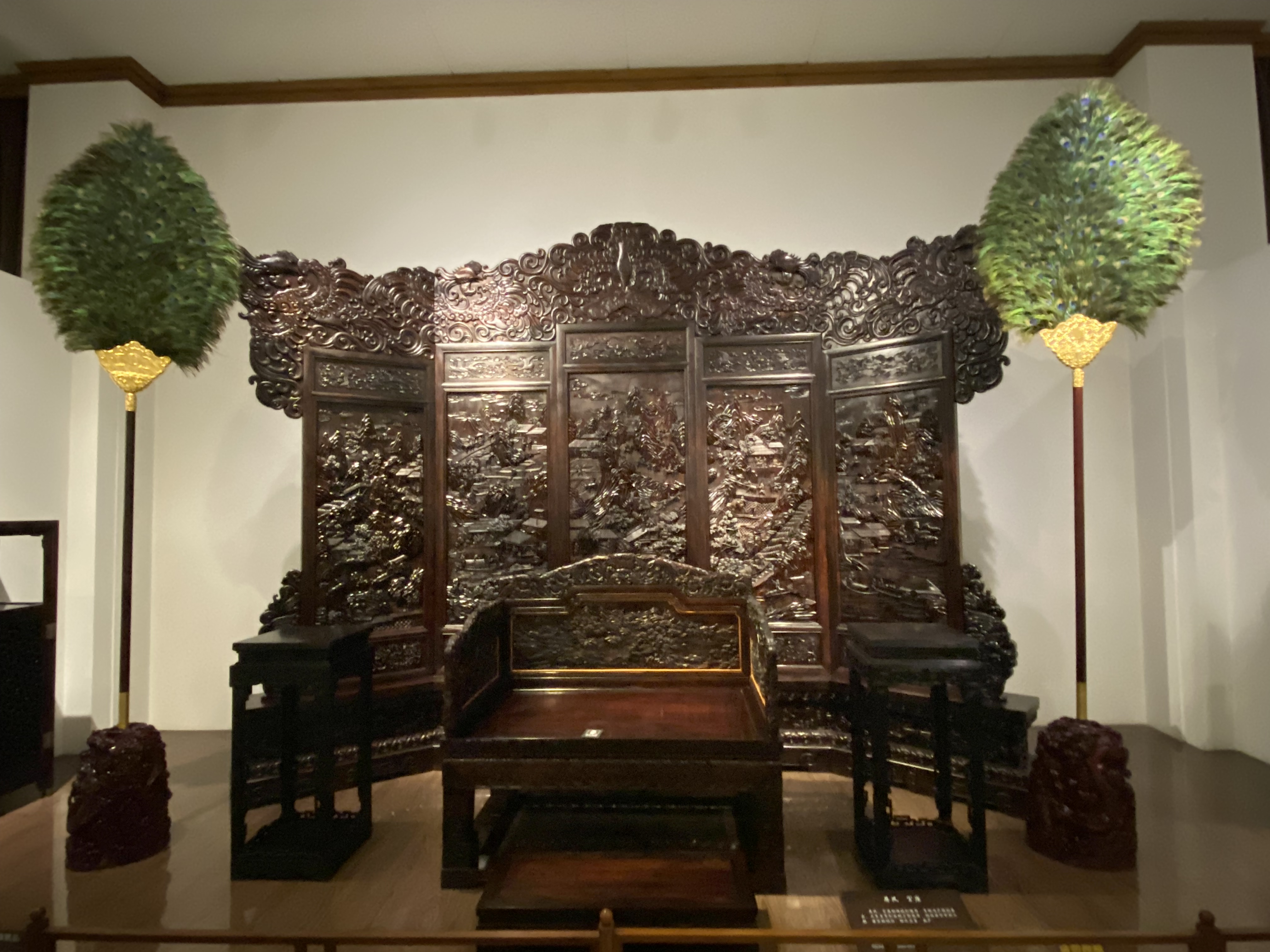 Encore plus formel et impressionnant, une salle de trône, avec ce panneau de bois entièrement gravé qui abrite le trône, lui-même très orné. Au passage, j’ai adoré les éventails en plumes de paon…