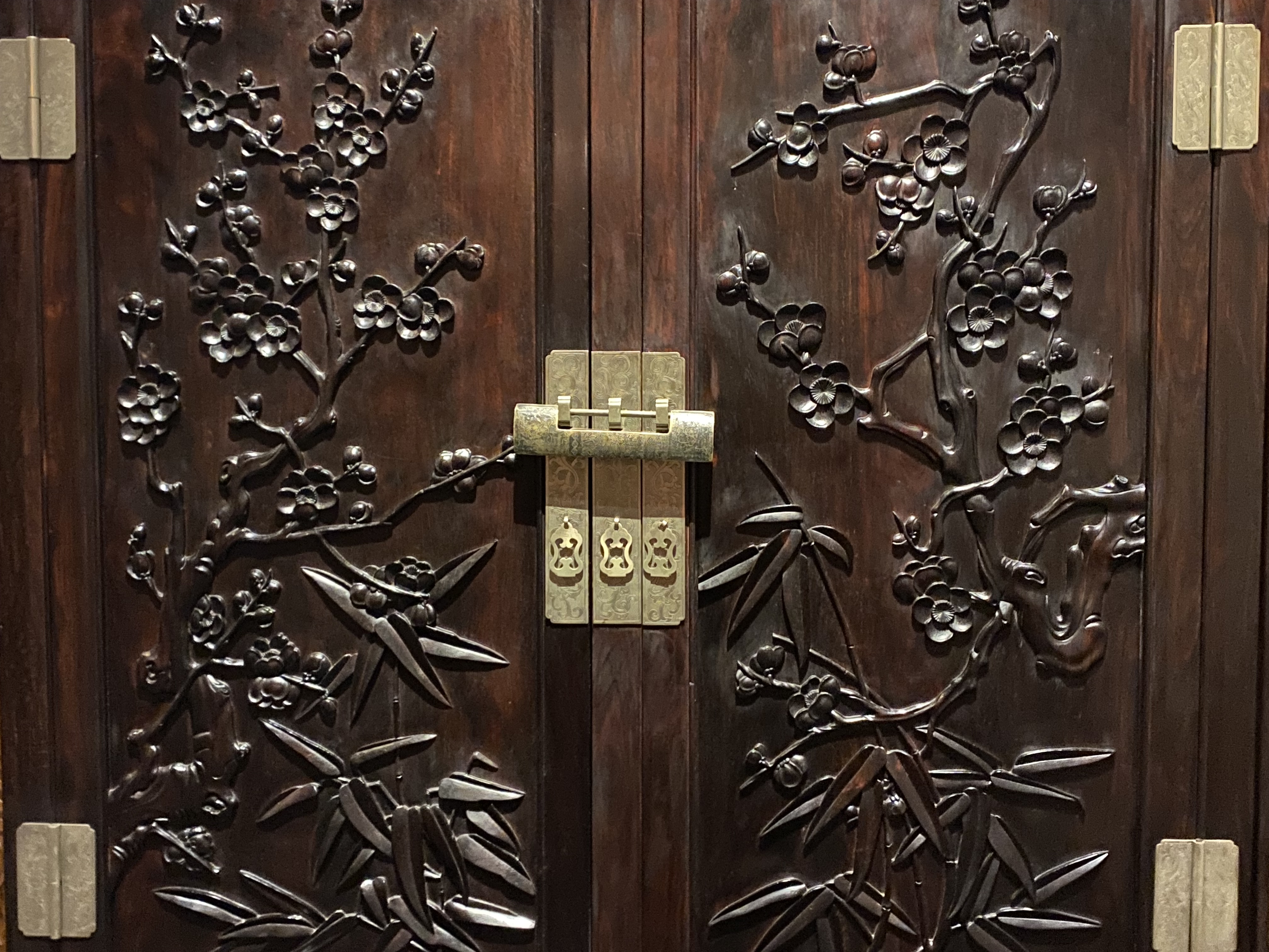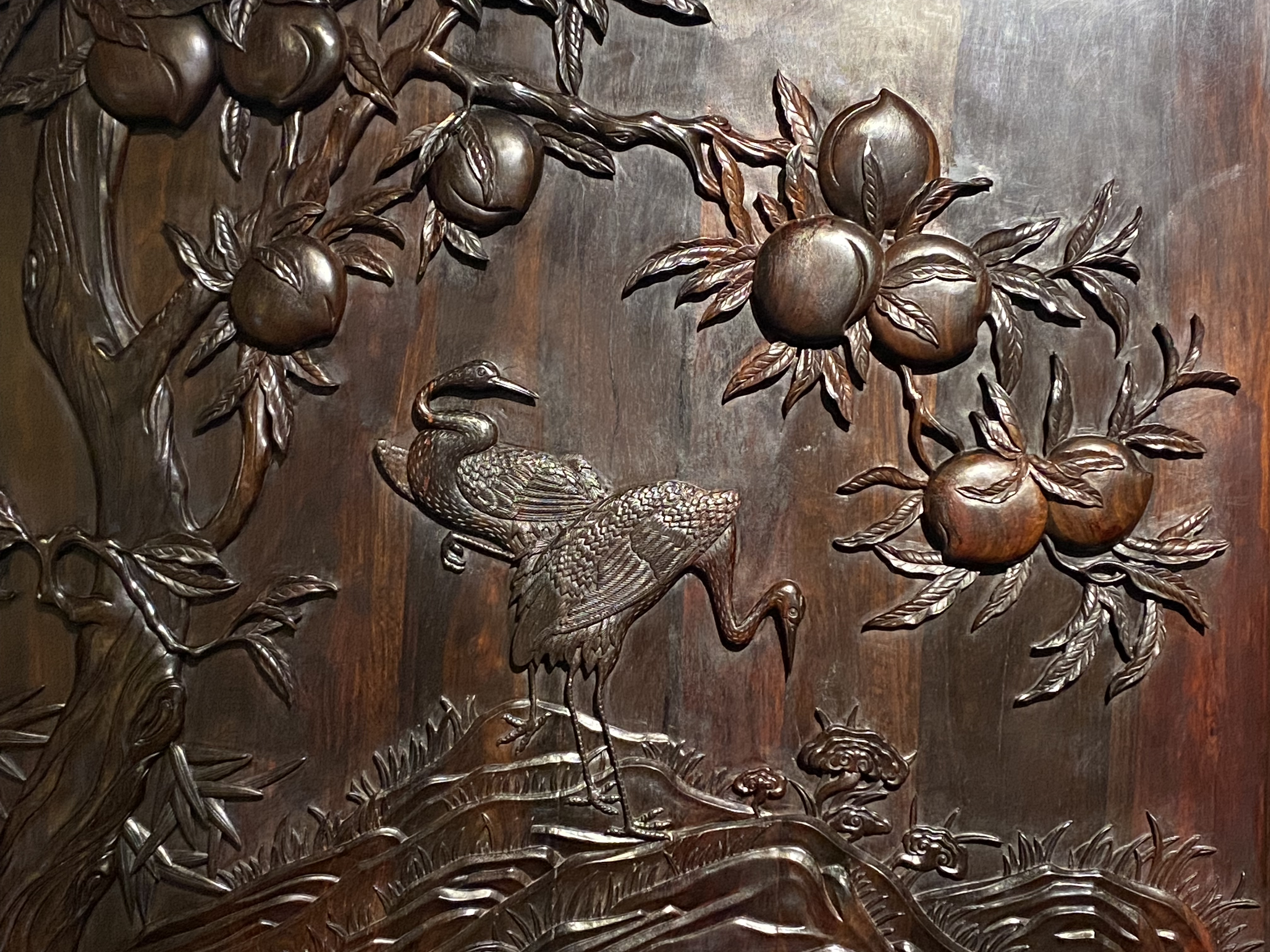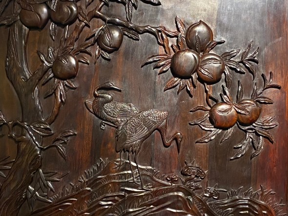 Commençons par ces armoires et ces paravents en bois de santal rouge. Gravés de motifs saillants, presque en forme de bas-relief, qui semblent sortir du corps du meuble pour exister en tant que tels et sont chargés de significations heureuses, longévité, bonheur, prospérité et richesse.