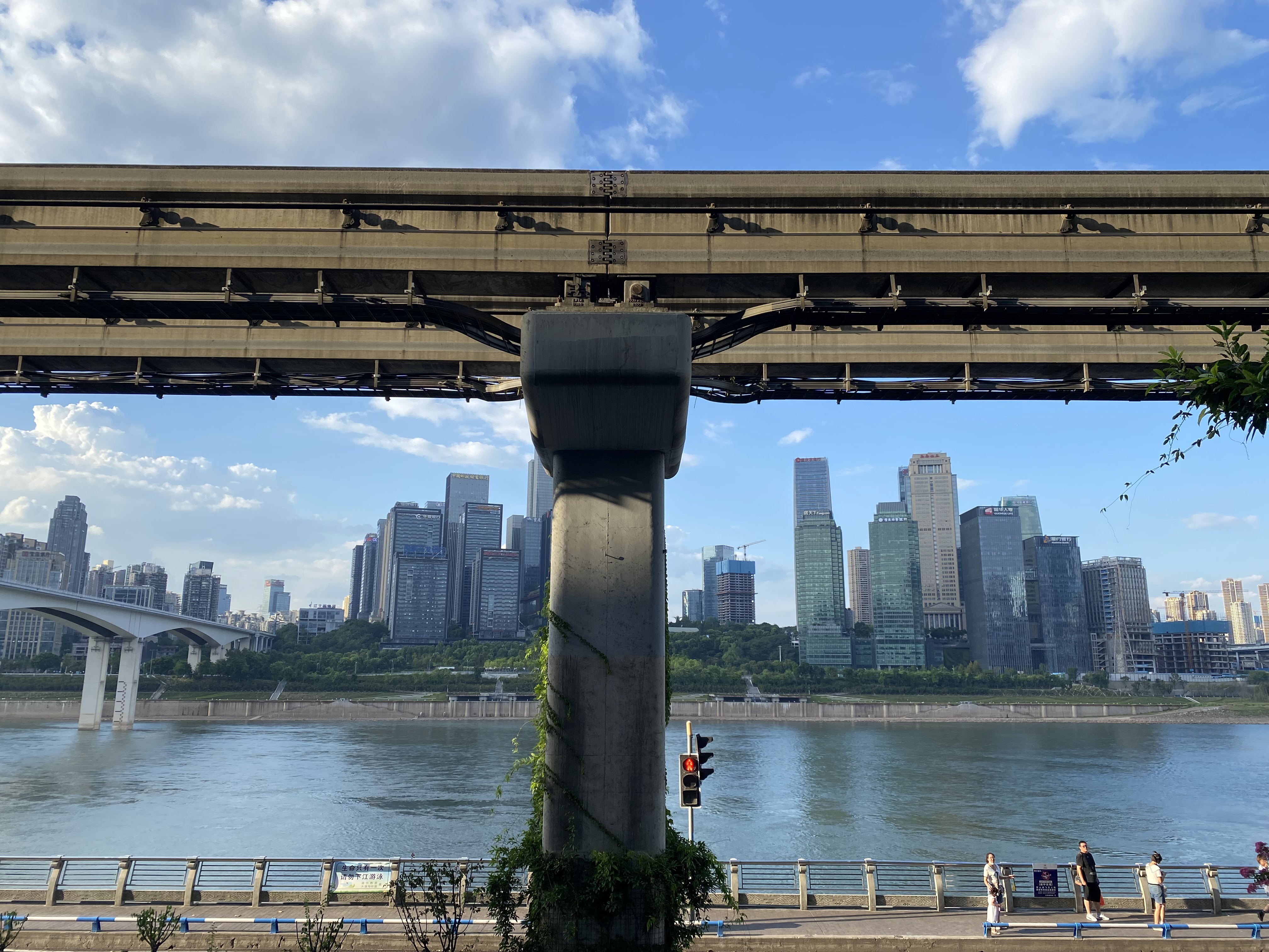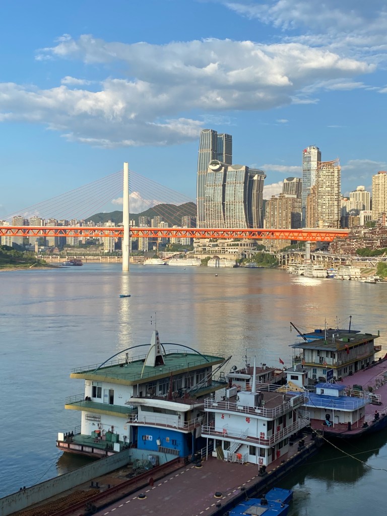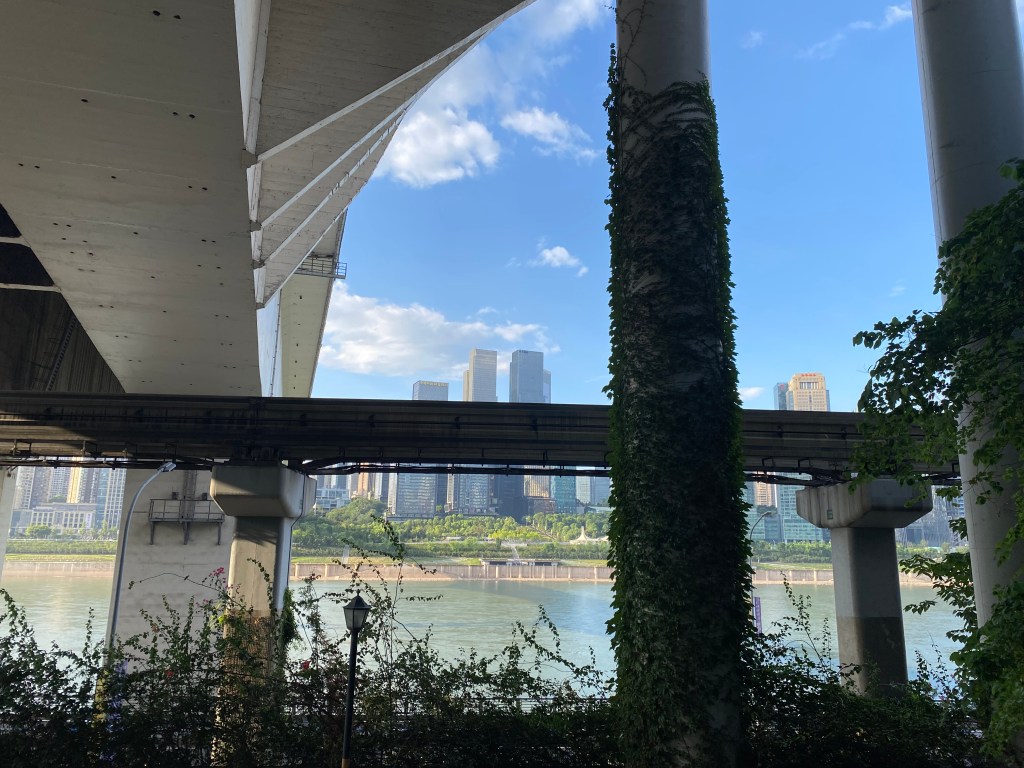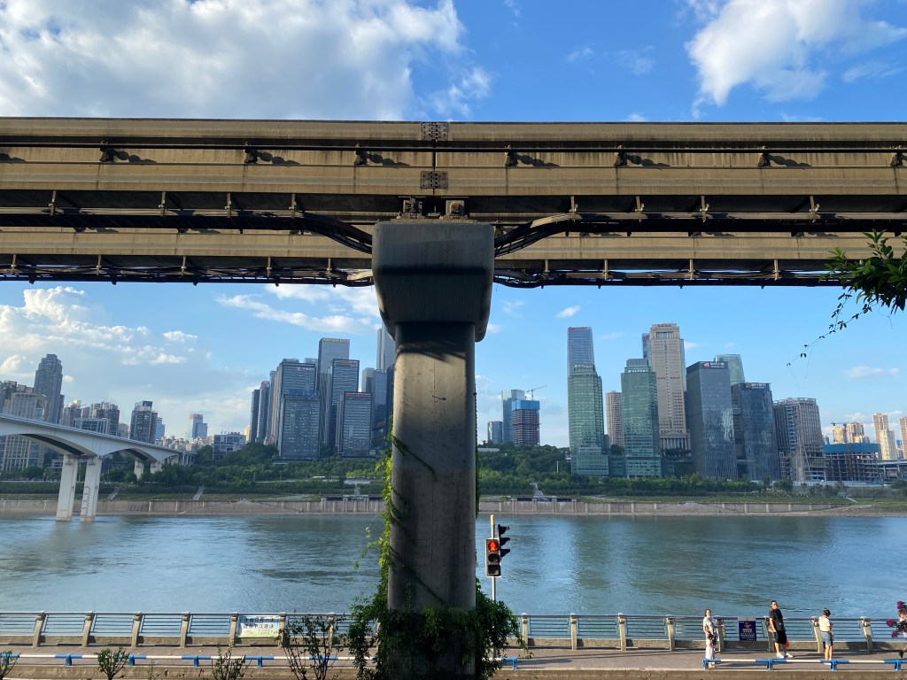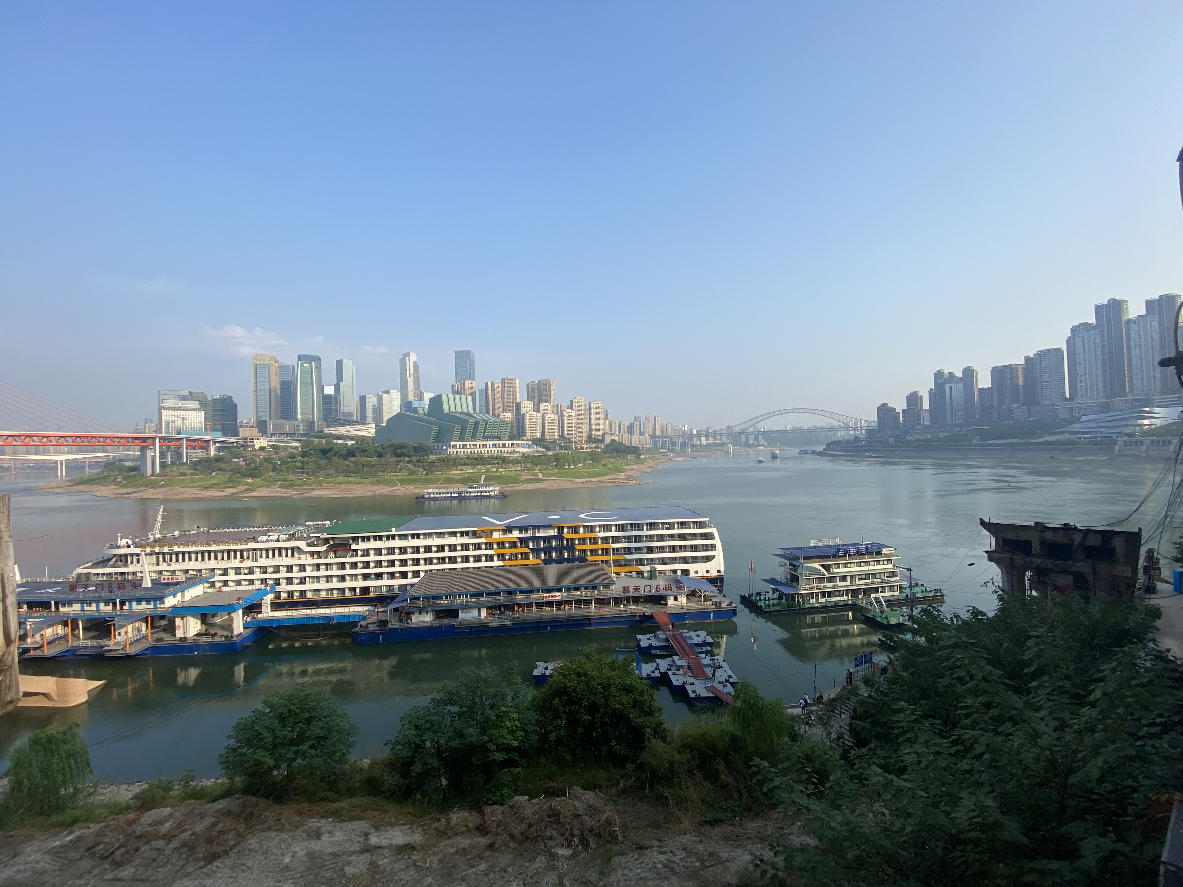 Tout d’abord ma première vision sur cet ensemble urbain immense, à l’arrivée au port, après cette croisière sur le Fleuve Bleu (Yang-Tsé Kiang, 长江, le Grand Fleuve en chinois). Il fait déjà 33° C à 8 heures du matin (et lors de mon court séjour, j’expérimenterai des 44 à 46°C ressentis au climax de la journée). Je croise le Yang-Tsé Kiang et le Jialing Jiang (嘉陵江) son affluent, qui se confondent ici, dans cette boucle qui abrite l’hypercentre de la ville, le quartier de Yuzhong (愉中, le « centre heureux »).