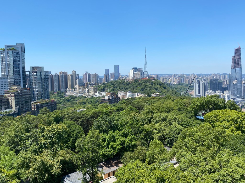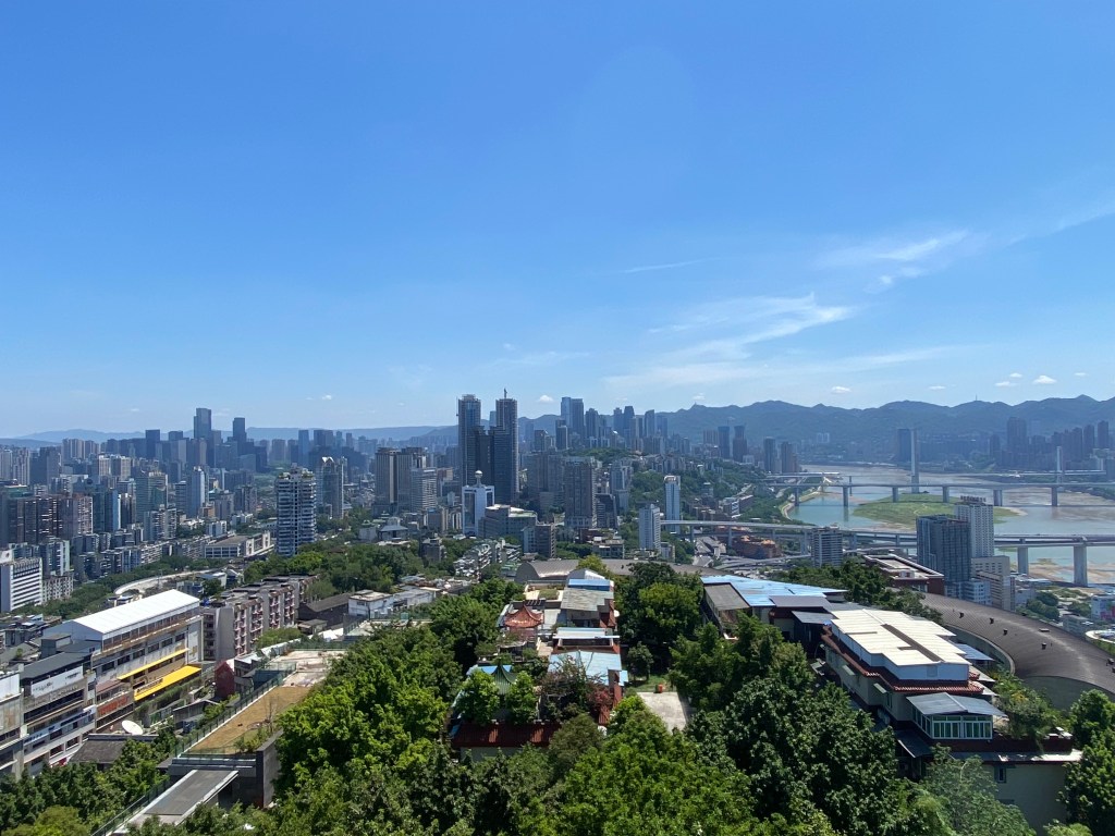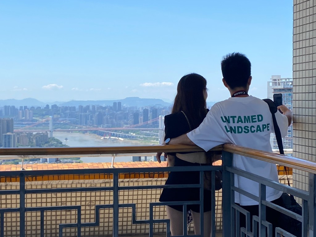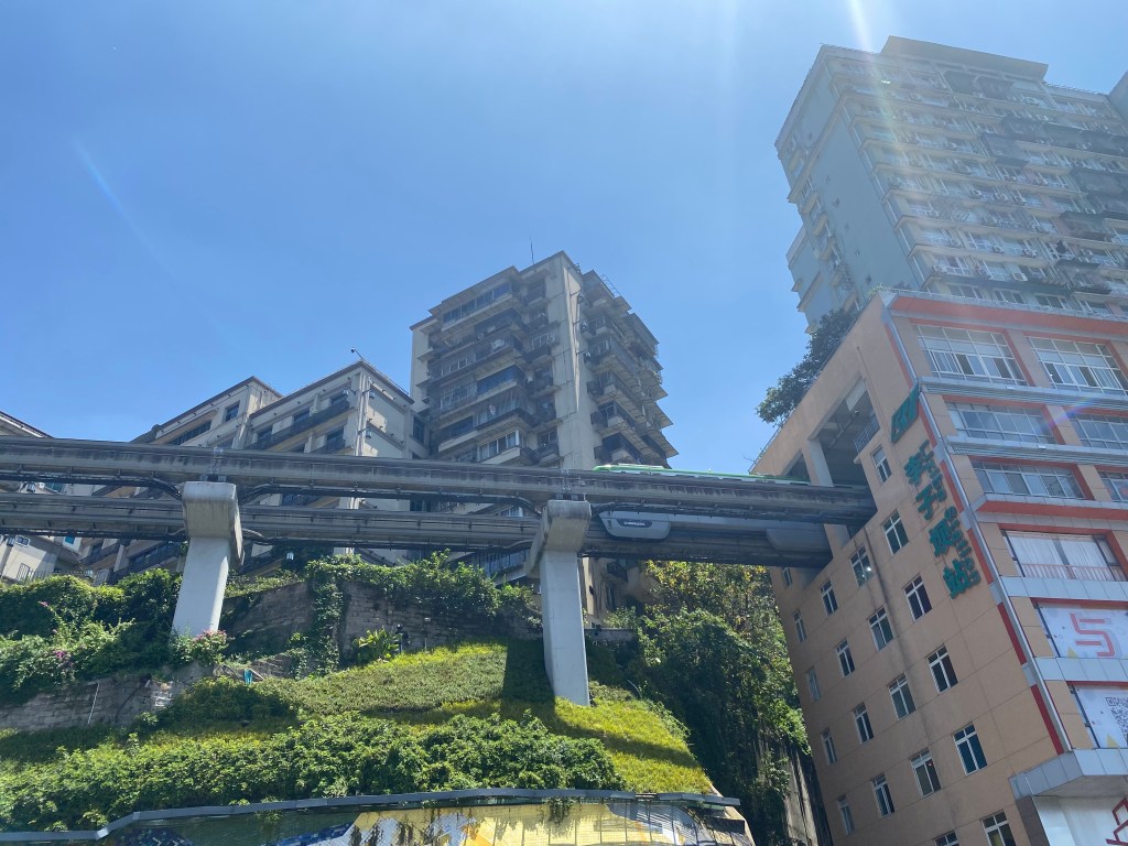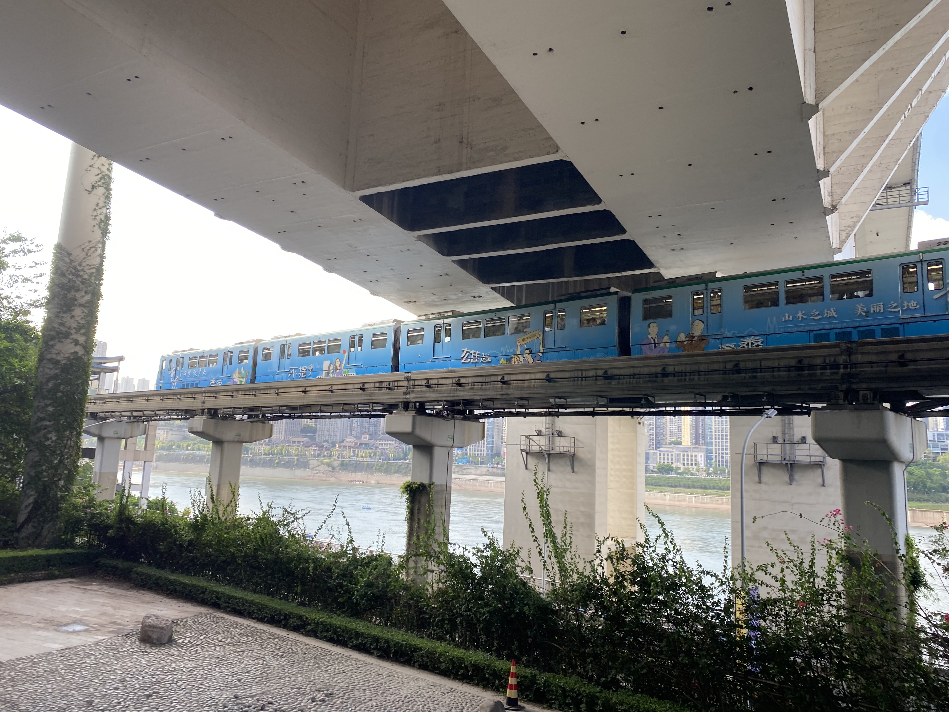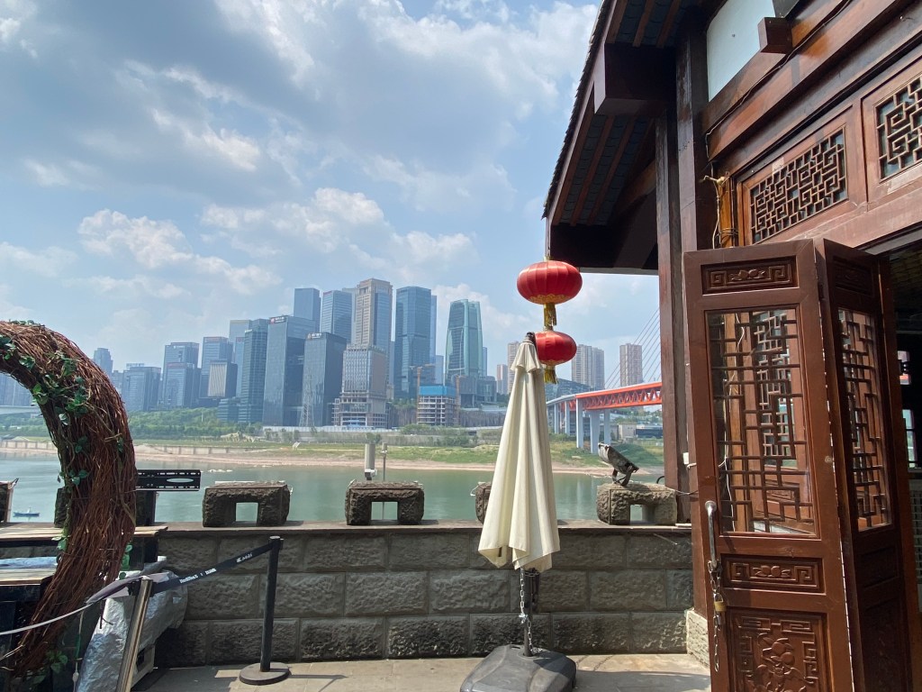 Tout d’abord ma première vision sur cet ensemble urbain immense, à l’arrivée au port, après cette croisière sur le Fleuve Bleu (Yang-Tsé Kiang, 长江, le Grand Fleuve en chinois). Il fait déjà 33° C à 8 heures du matin (et lors de mon court séjour, j’expérimenterai des 44 à 46°C ressentis au climax de la journée). Je croise le Yang-Tsé Kiang et le Jialing Jiang (嘉陵江) son affluent, qui se confondent ici, dans cette boucle qui abrite l’hypercentre de la ville, le quartier de Yuzhong (愉中, le « centre heureux »).