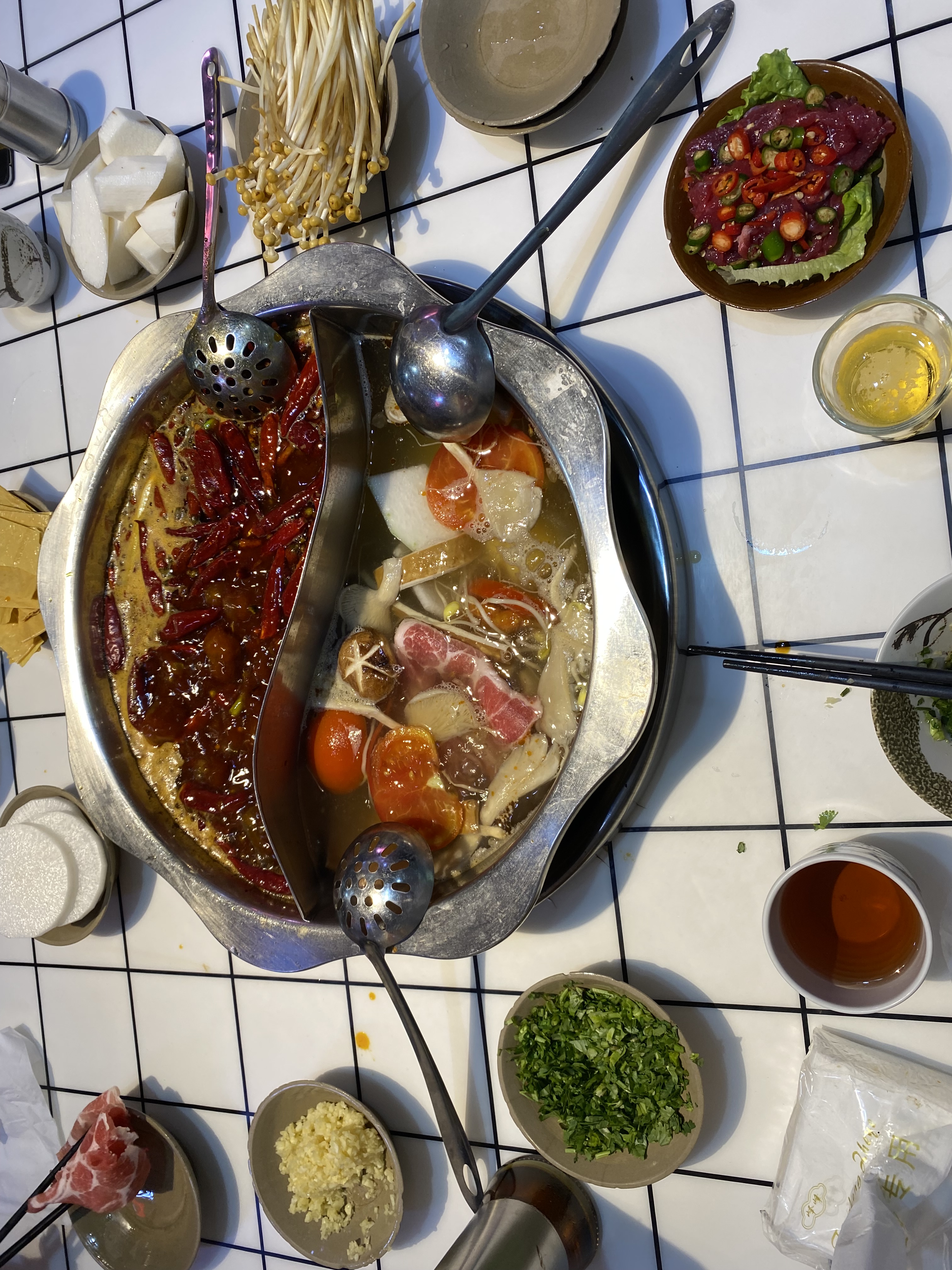 Si c’était un plat, la fondue (火锅). Ce plat, d’après les explications de mon guide, est né auprès de la population pauvre, qui recueillait les restes des riches habitants, avec beaucoup d’abats (et nous pouvons penser aussi, des aliments pas loin de la putréfaction) et qui a inventé cette manière de cuire les aliments dans un bouillon très épicé, ce qui permettait de détruire les bactéries et de donner un meilleur goût à tout. La tradition s’est perpétuée, ce plat est maintenant goûté par toutes les strates de la population (avec des denrées plus fraîches, je vous rassure), et il existe bien des restaurants spécialisés, tel celui où je suis allée.