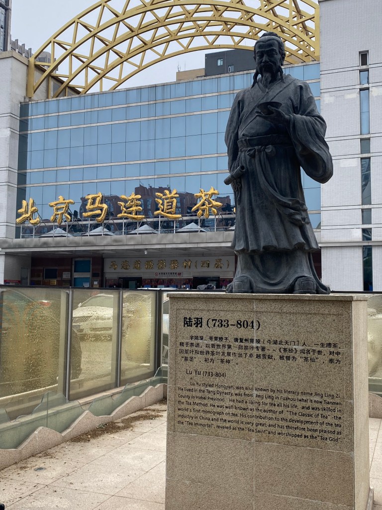 Pour en revenir aux centres commerciaux auxquels je faisais allusion, voici le plus connu, qui s’appelle, ô surprise évidente, « centre commercial du thé, Maliandao, Pékin ». Devant l’entrée s’élève la statue de Lu Yu, un lettré du VIIIe siècle, fin connaisseur de thé et surnommé « Dieu du thé », nous savons où nous sommes.