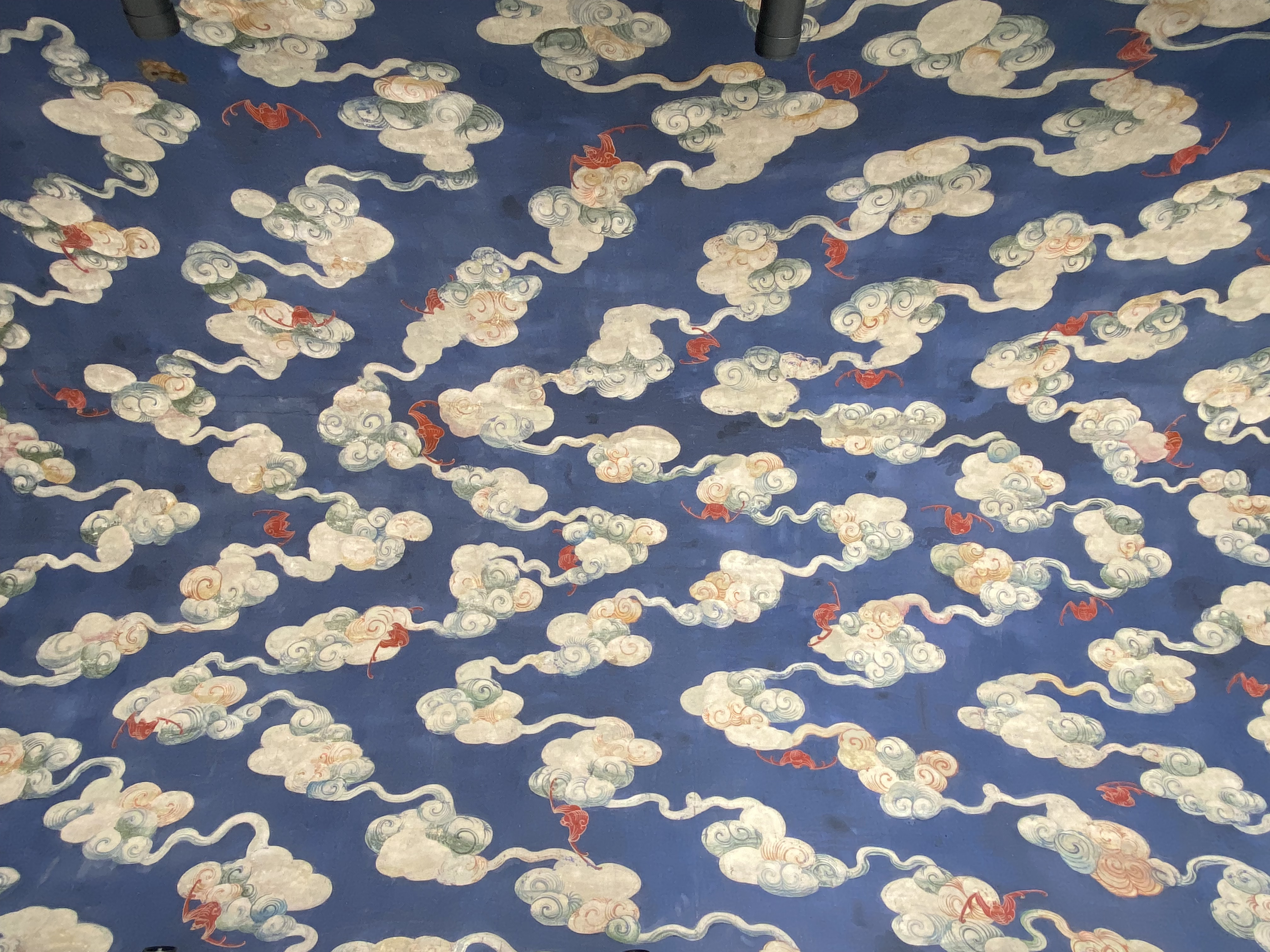 Le plafond de l’entrée me surprend cependant, un ciel arpenté de nuages en tissage serré, pareil à un tissu de l’ancien temps.