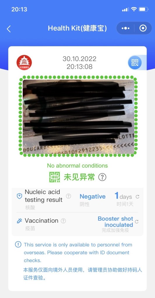 Mais cela atteint ici des proportions hors norme puisque des centaines de millions de citoyens de par le pays sont obligés de faire des tests PCR réguliers pour pouvoir se déplacer, aller au bureau, faire des courses ou accéder à des lieux culturels. Le rythme dépend des endroits, à Pékin nous sommes assez chanceux, depuis avril nous ne devons faire qu’un test tous les trois jours (j’en suis à peu près à 70), mais dans certaines villes, c’est un test par jour (à Shenzhen, par exemple mes collègues ont fait plus de 200 tests depuis le début de l’année).