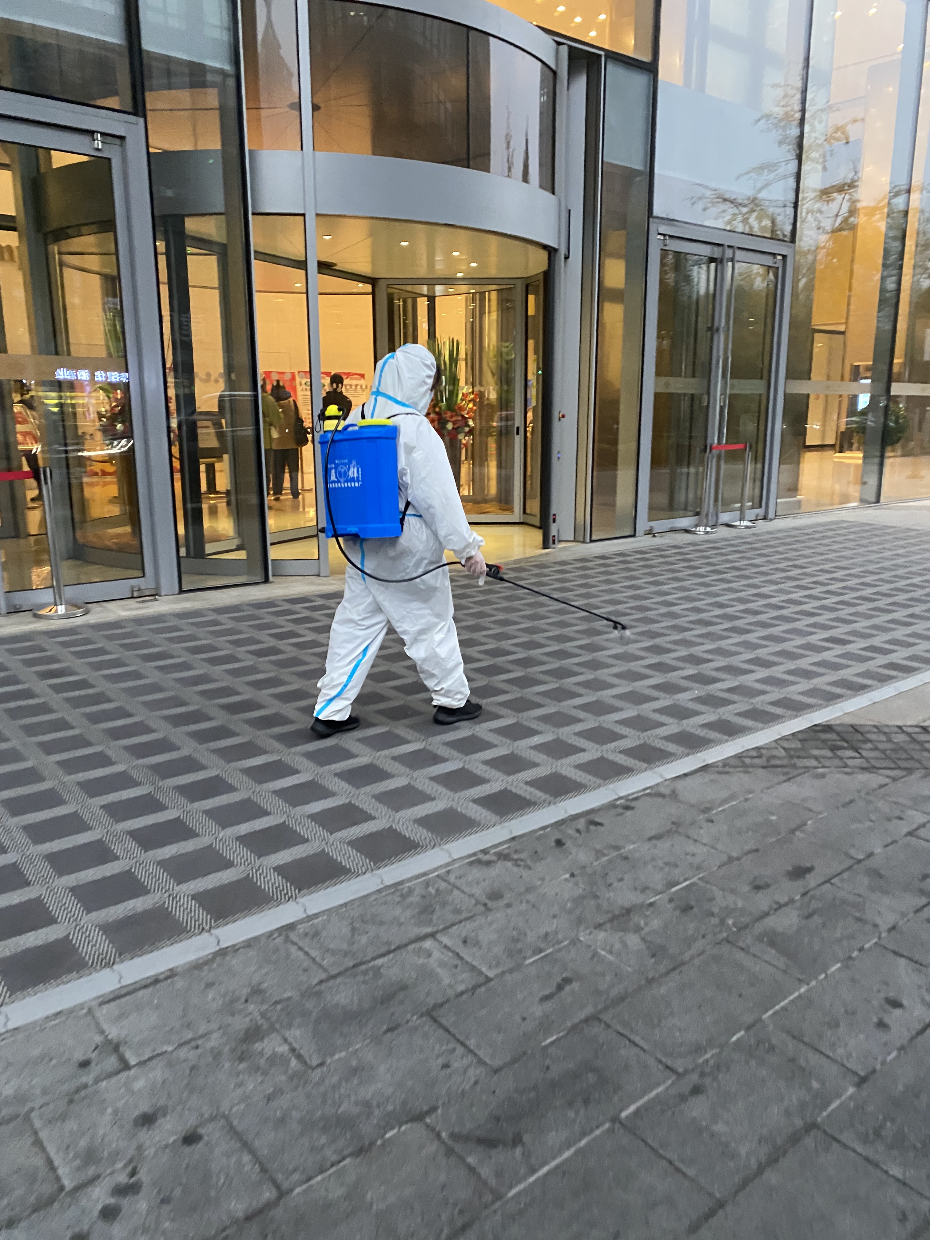 Dans sa tenue d’astronaute, comme revenue de bien d’autres planètes, harnachée d’un bidon de désinfectant (javel ? autre ? je ne sais pas), son devoir quotidien est d’asperger copieusement les espaces publics pour empêcher le virus d’entrer (ou, s’il est déjà là, on ne sait jamais, l’empêcher de sortir).