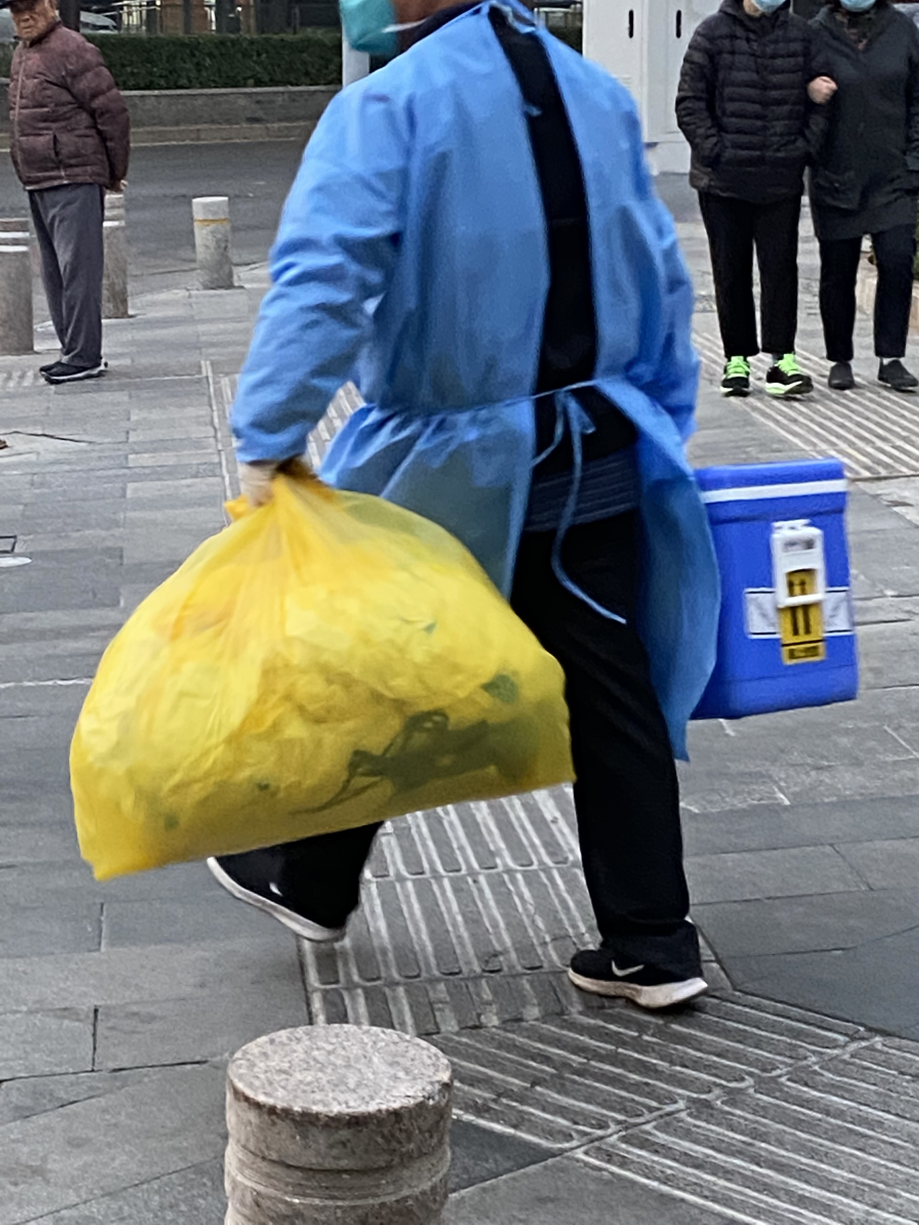Et bien non. Nous remarquons que le préposé aux déchets ne porte qu’une tenue en non-tissé bleu, qui d’ailleurs baille dans le dos. Les déchets eux-mêmes, à forte potentialité de contamination, qui transportent peut-être un virus tapi dans l’ombre d’un coton-tige ou à l’abri d’un tube de test, sont vaguement enfermés dans de fins sacs poubelle jaunes, ce qui ne nous rassure que moyennement sur la sécurité du convoyage.