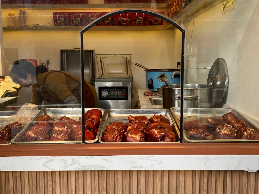 La nourriture est bien appétissante, elle nous présente des spécialités d’ici, en premier lieu les jarrets de porc Wansan, mijotés des heures avec beaucoup d’épices, anis étoilé , fenouil, cannelle, clou de girofle, gingembre. La ville embaumait… Je n’ai pas pu goûter ce plat, mais les nouilles au cou de canard que j’ai mangées étaient excellentes également.