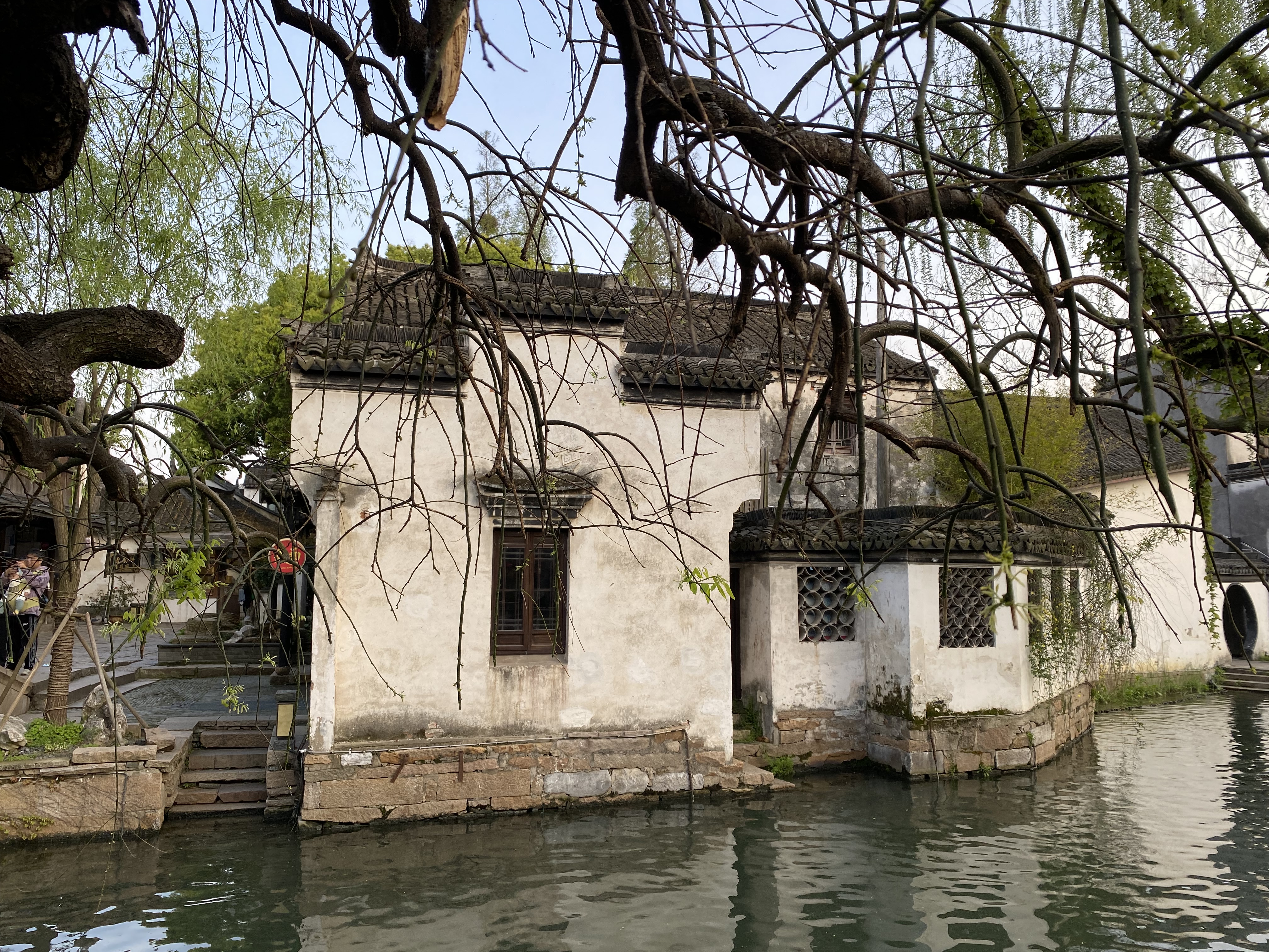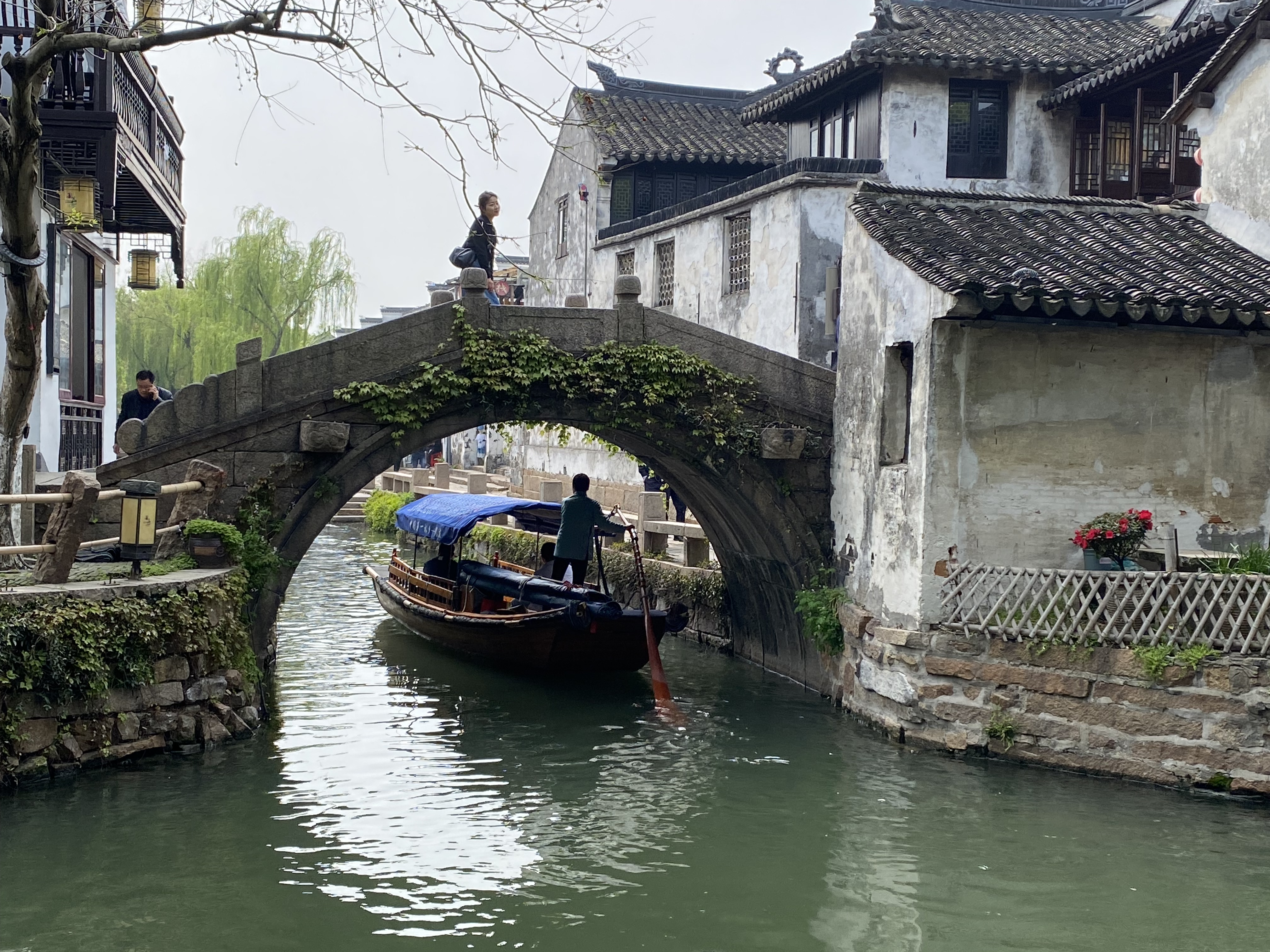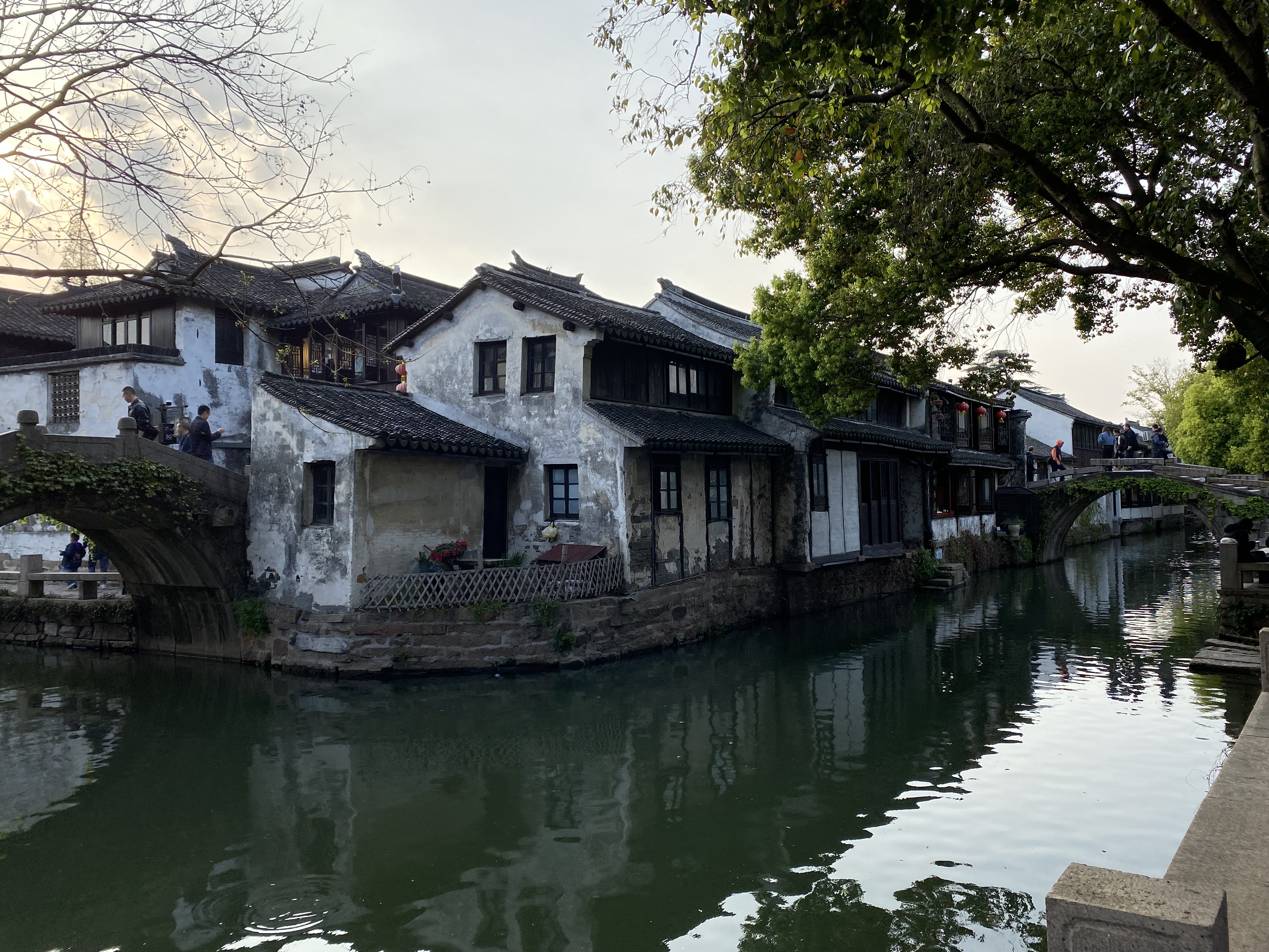 A 40 kilomètres au sud de Suzhou, dans cette région du Jiangsu, appelée Jiangnan 江南(littéralement : « au sud du fleuve », entendez le Yangtse ou Fleuve bleu) où les lacs et cours d’eau font des entrelacs qui défient la domination de la terre ferme, se trouve la bourgade de Zhouzhuang (littéralement : villa de M. Zhou), en l’honneur de Zhou Di qui édifia au XIe siècle un temple bouddhiste dans ce lieu. La ville s’est ensuite développée autour de canaux, la majorité des édifices datent des époques Ming et Qing (XIVe au XIXe siècle) et je dois dire qu’elle constitue une petite enclave miraculeuse, protégée de ce mouvement d’urbanisation, accompagné de destructions, qui parcourt le pays depuis les années 1950. Même si vous pouvez voir aux alentours, dans les perspectives offertes par quelques ponts, une ville moderne bien envahissante, et que le fait d’acquitter un prix d’entrée global pour entrer dans l’endroit fait penser à une réserve urbanistique et bien rodée au tourisme, ne boudons pas notre plaisir (à noter, pour faire écho aux récentes controverses en France sur le sujet, que la clé pour pénétrer dans tous les sites de cette ville est la reconnaissance faciale : votre visage est scanné à l’entrée du site et sera votre passeport pour les différentes visites).