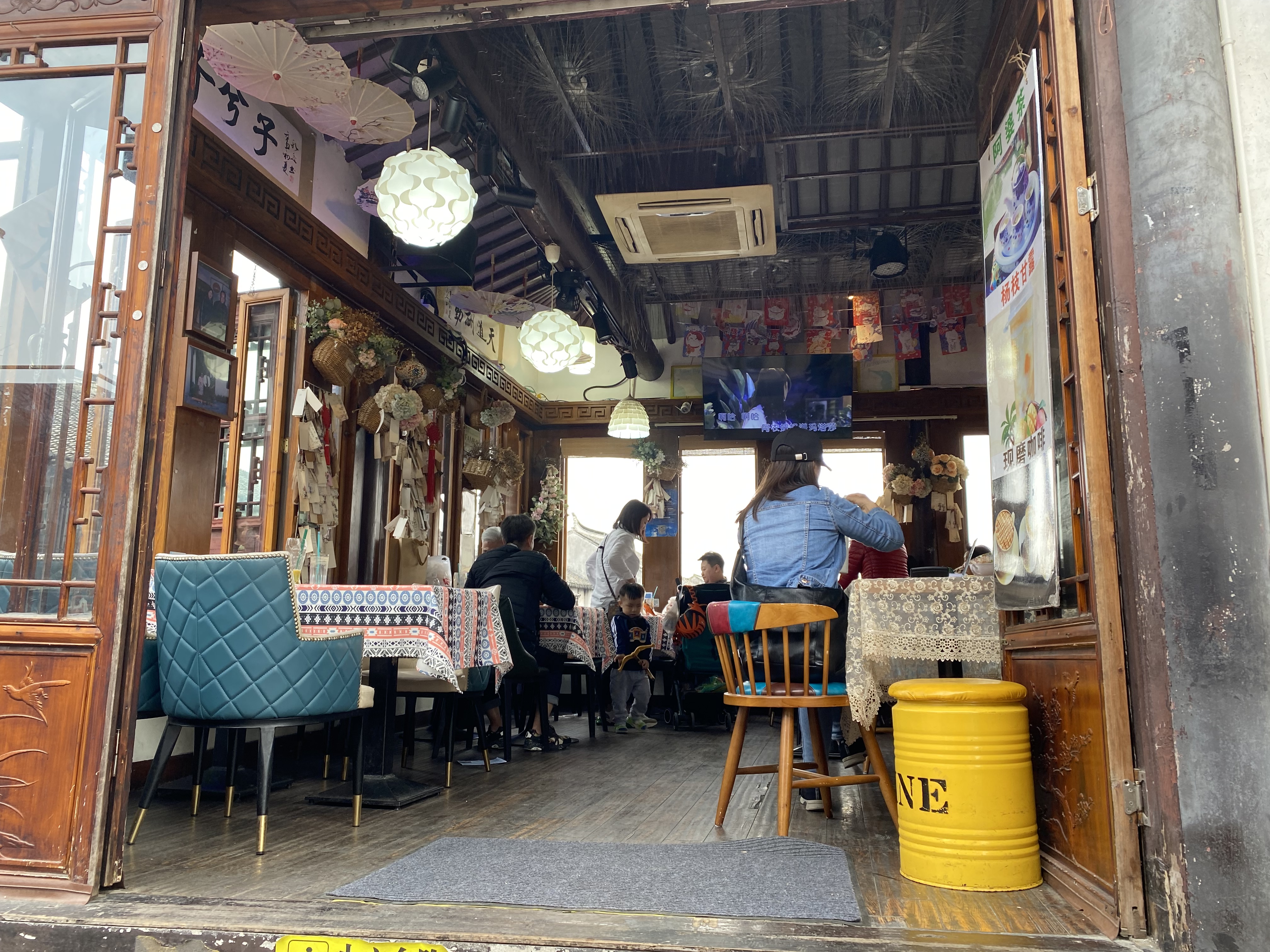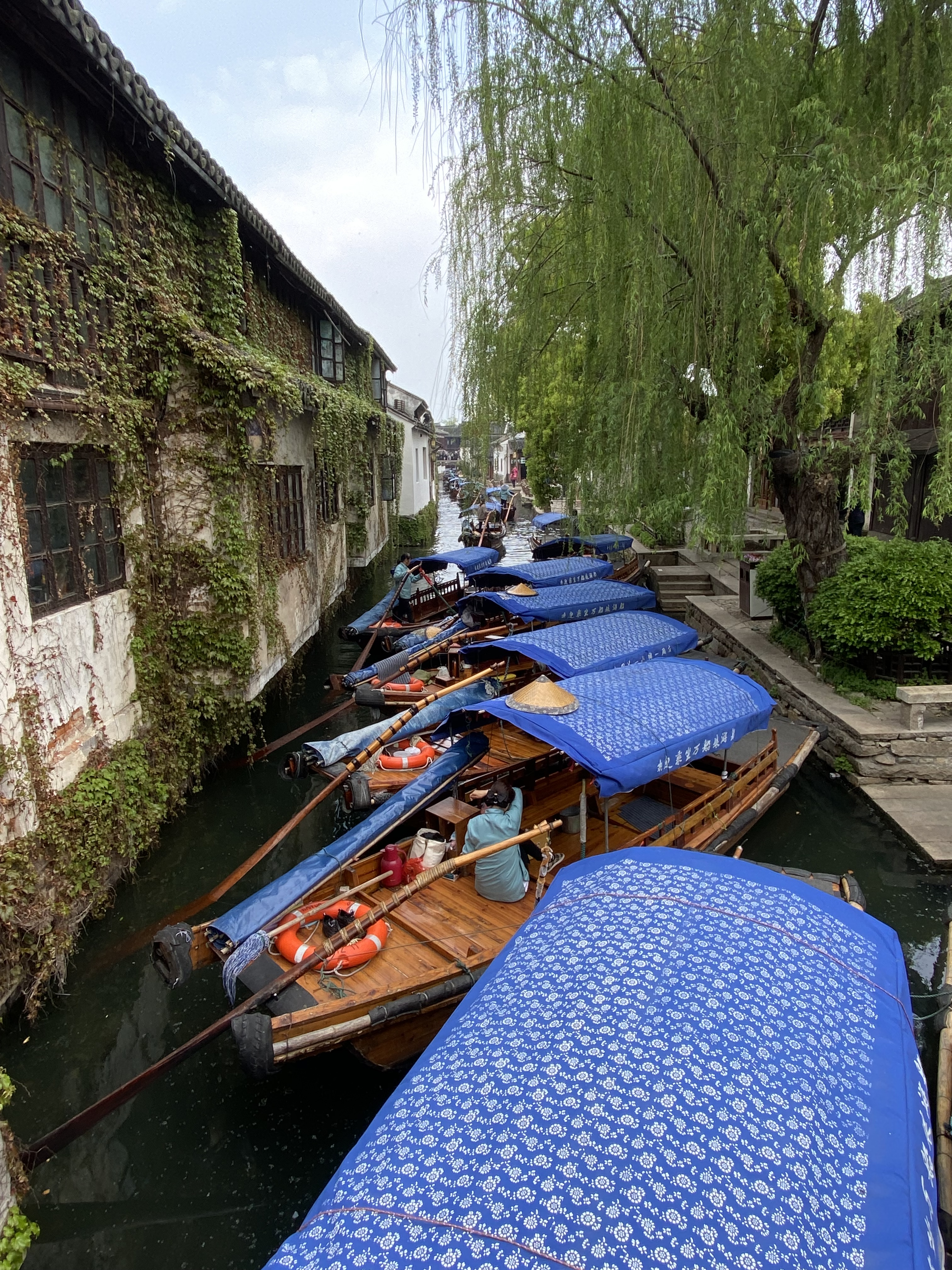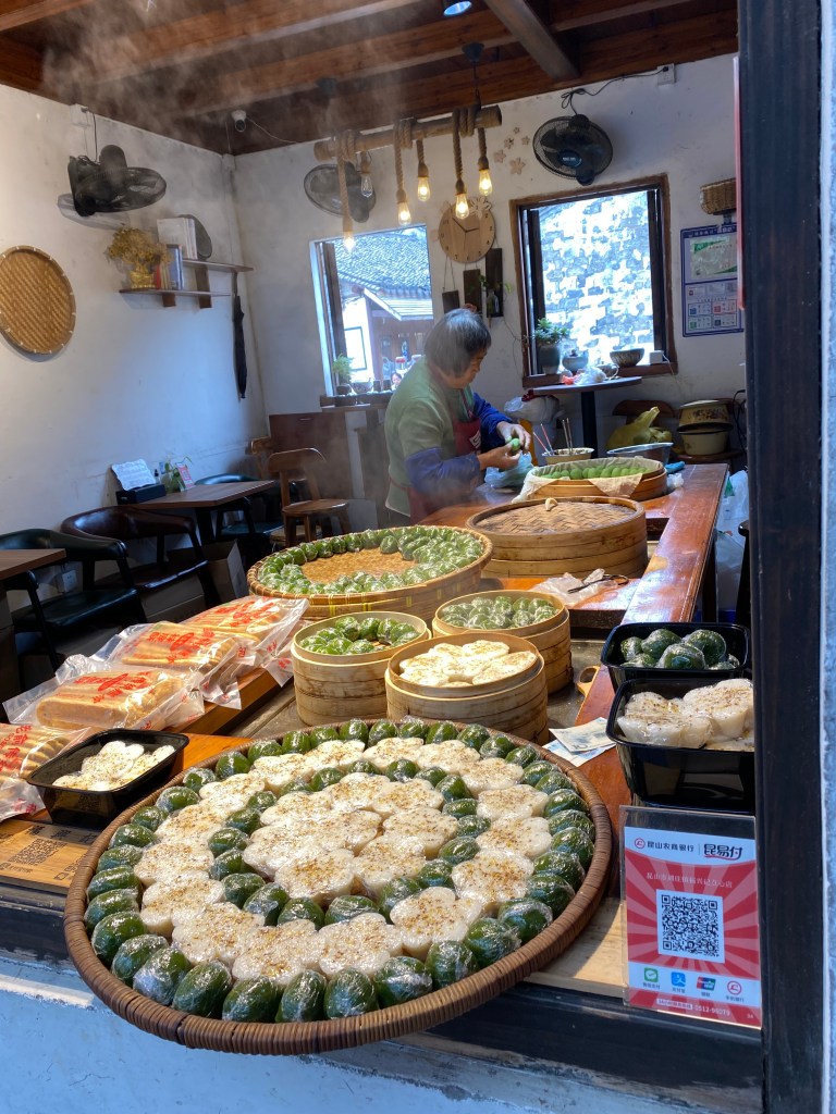 A 40 kilomètres au sud de Suzhou, dans cette région du Jiangsu, appelée Jiangnan 江南(littéralement : « au sud du fleuve », entendez le Yangtse ou Fleuve bleu) où les lacs et cours d’eau font des entrelacs qui défient la domination de la terre ferme, se trouve la bourgade de Zhouzhuang (littéralement : villa de M. Zhou), en l’honneur de Zhou Di qui édifia au XIe siècle un temple bouddhiste dans ce lieu. La ville s’est ensuite développée autour de canaux, la majorité des édifices datent des époques Ming et Qing (XIVe au XIXe siècle) et je dois dire qu’elle constitue une petite enclave miraculeuse, protégée de ce mouvement d’urbanisation, accompagné de destructions, qui parcourt le pays depuis les années 1950. Même si vous pouvez voir aux alentours, dans les perspectives offertes par quelques ponts, une ville moderne bien envahissante, et que le fait d’acquitter un prix d’entrée global pour entrer dans l’endroit fait penser à une réserve urbanistique et bien rodée au tourisme, ne boudons pas notre plaisir (à noter, pour faire écho aux récentes controverses en France sur le sujet, que la clé pour pénétrer dans tous les sites de cette ville est la reconnaissance faciale : votre visage est scanné à l’entrée du site et sera votre passeport pour les différentes visites).