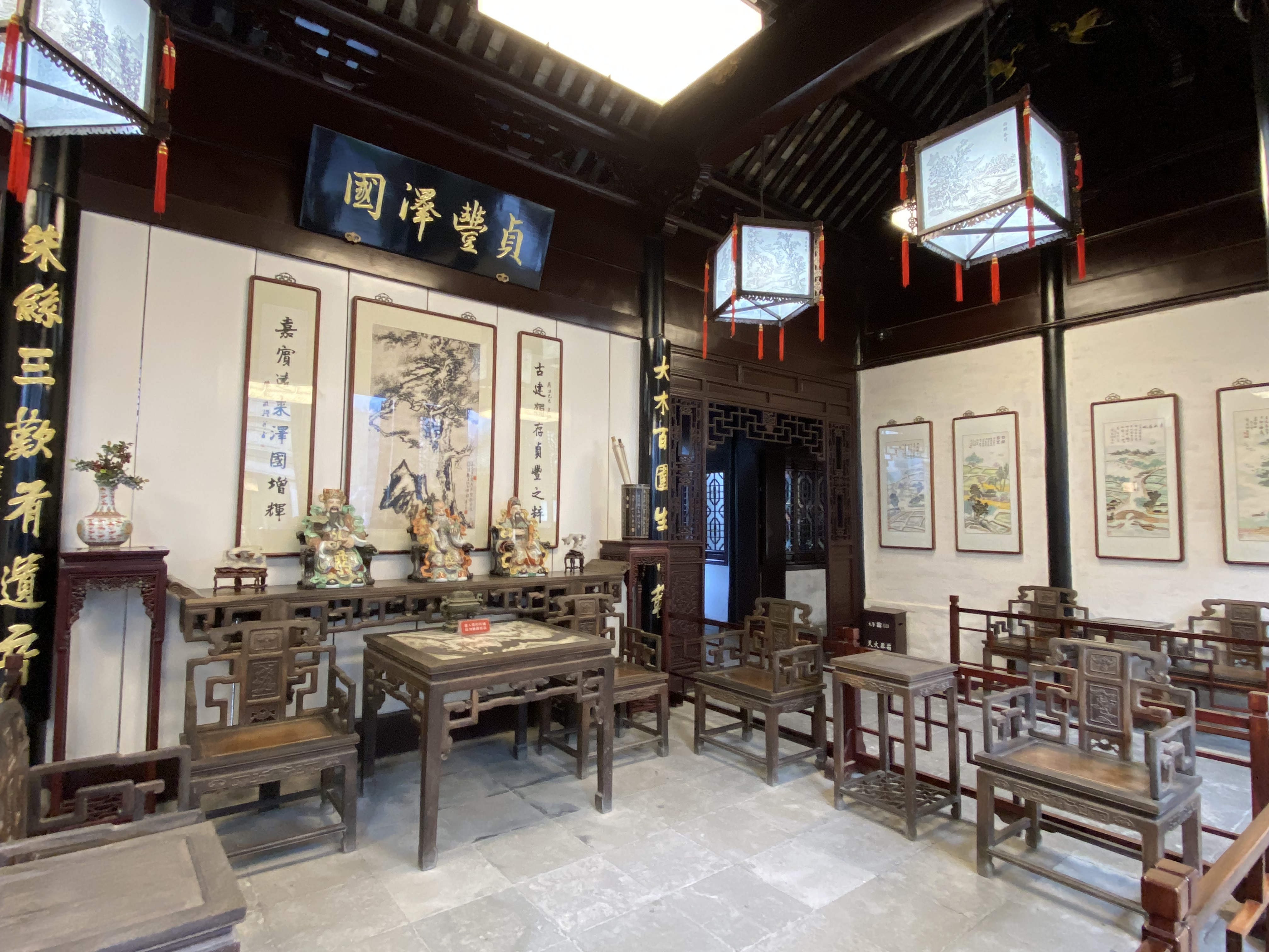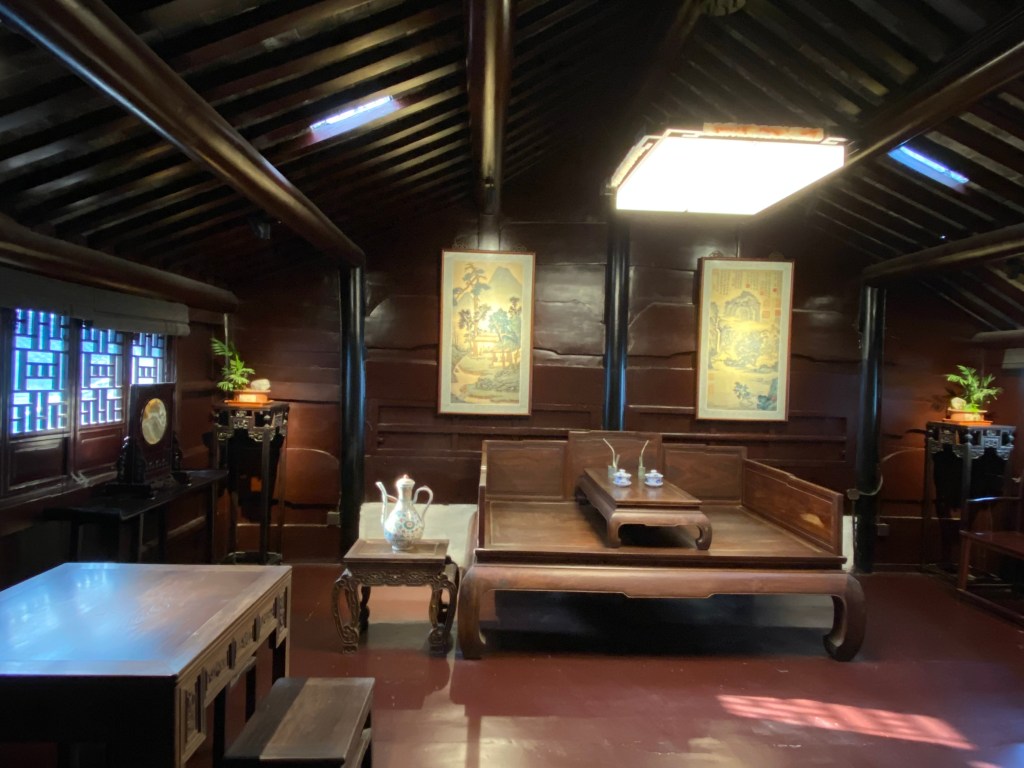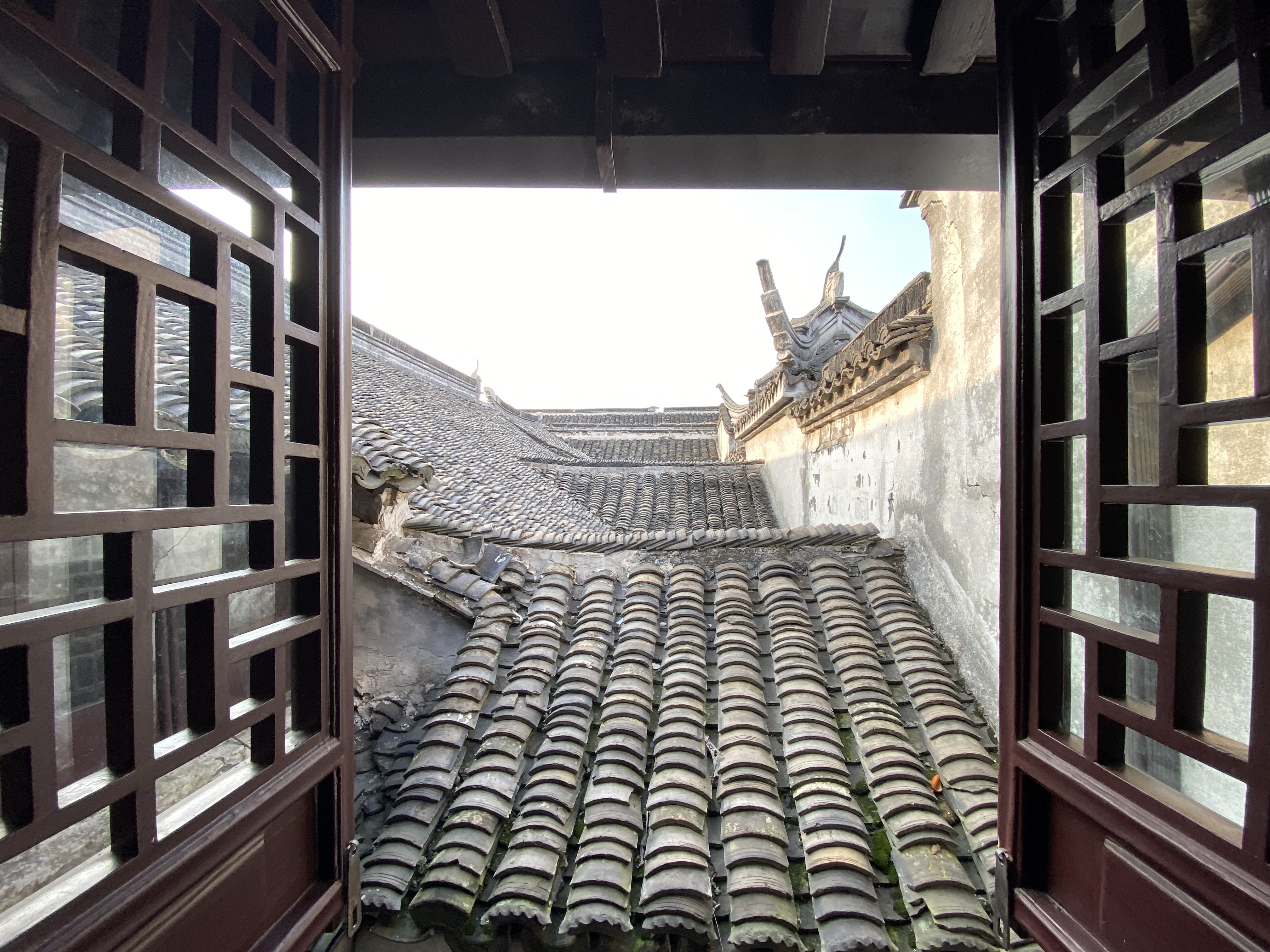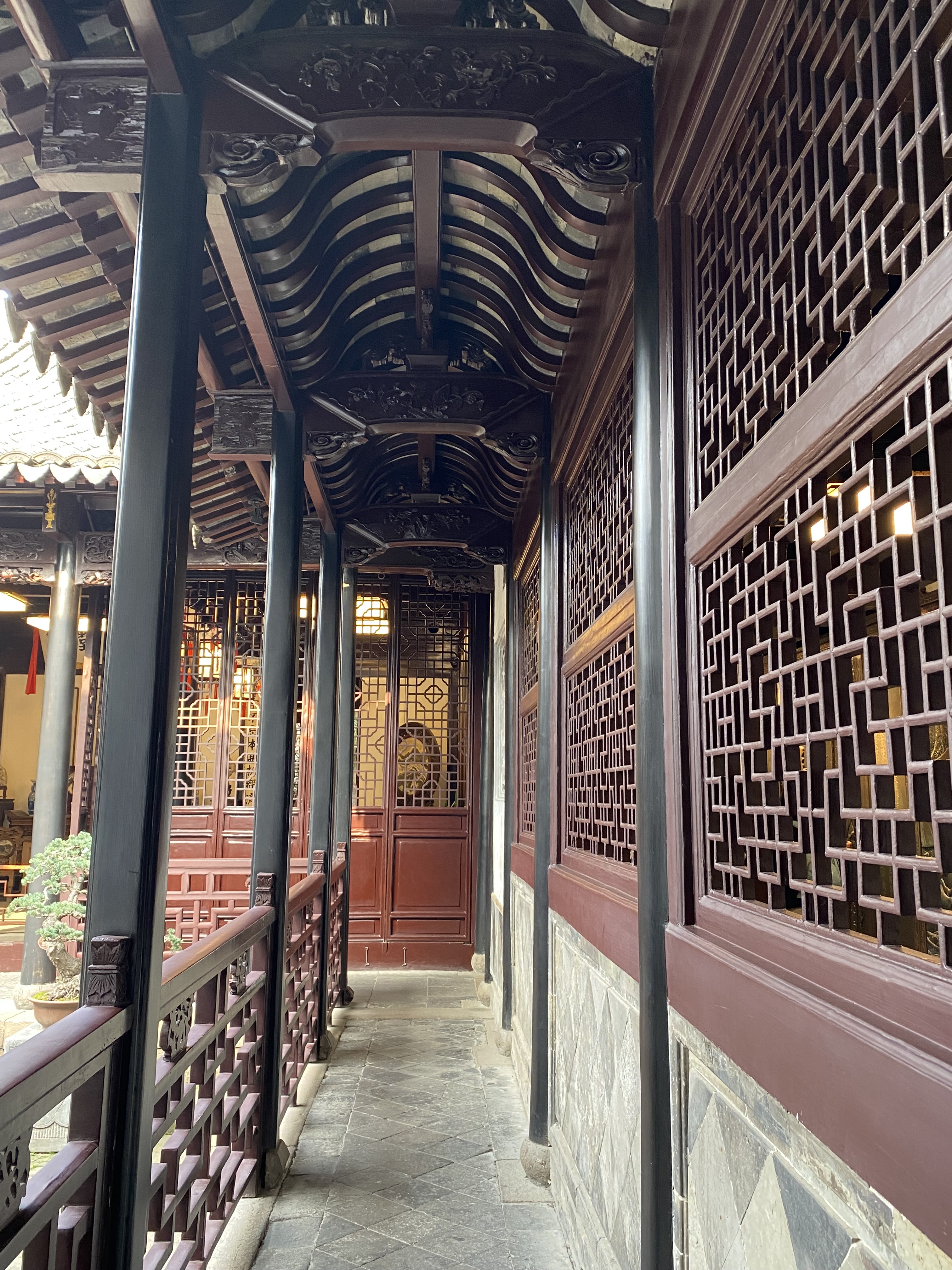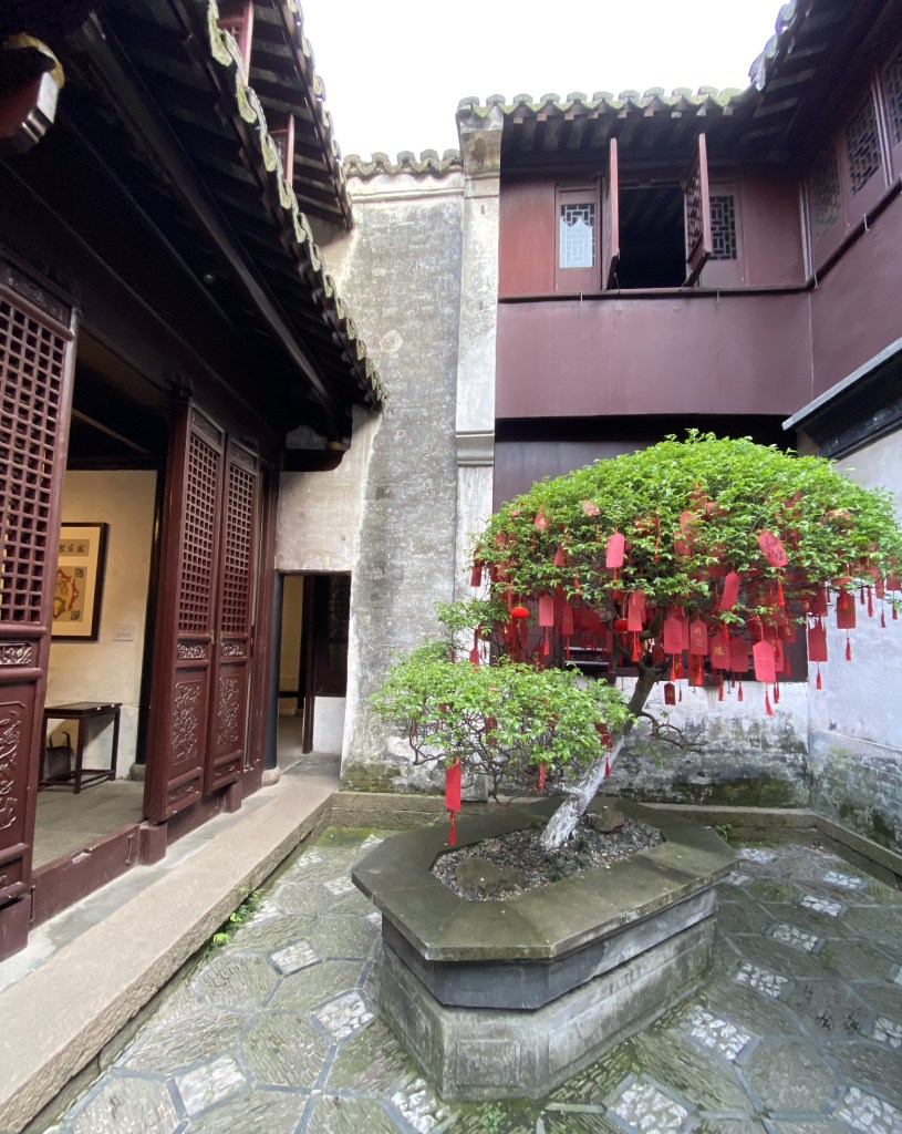 Le clou de votre visite doit être la Maison Shen (une autre maison mérite votre attention, la Maison des Zhang, magnifique aussi – Mais je dois faire des choix). Construite au milieu du XVIIIe siècle par les héritiers d’un très riche marchand, Shen Wanshan, elle compte plus de cent pièces (dont on ne peut voir qu’un dixième, c’est déjà impressionnant) autour de sept cours, sans compter les petites cours intermédiaires entre les bâtiments, plantées çà et là d’un arbre bien poétique.