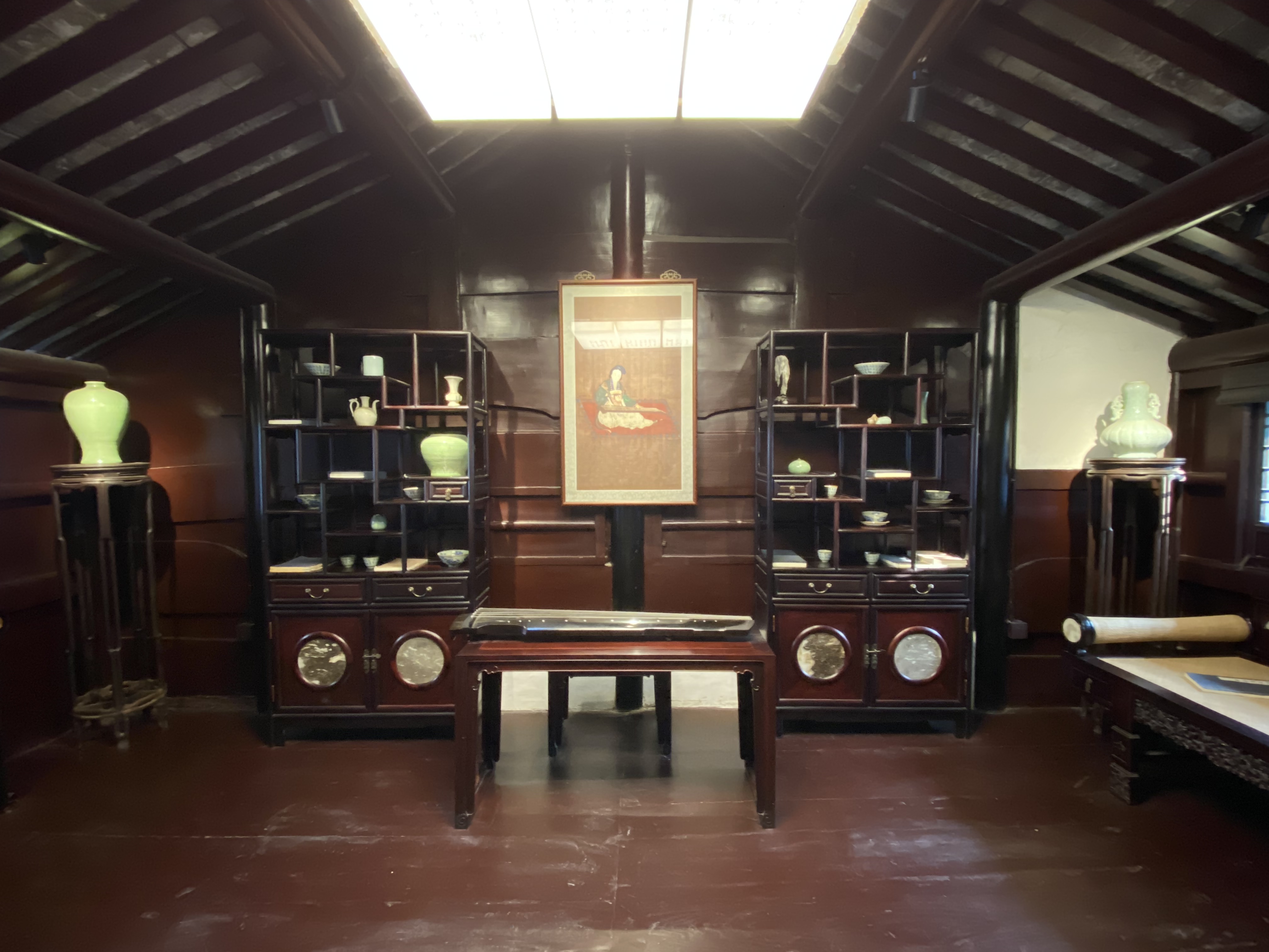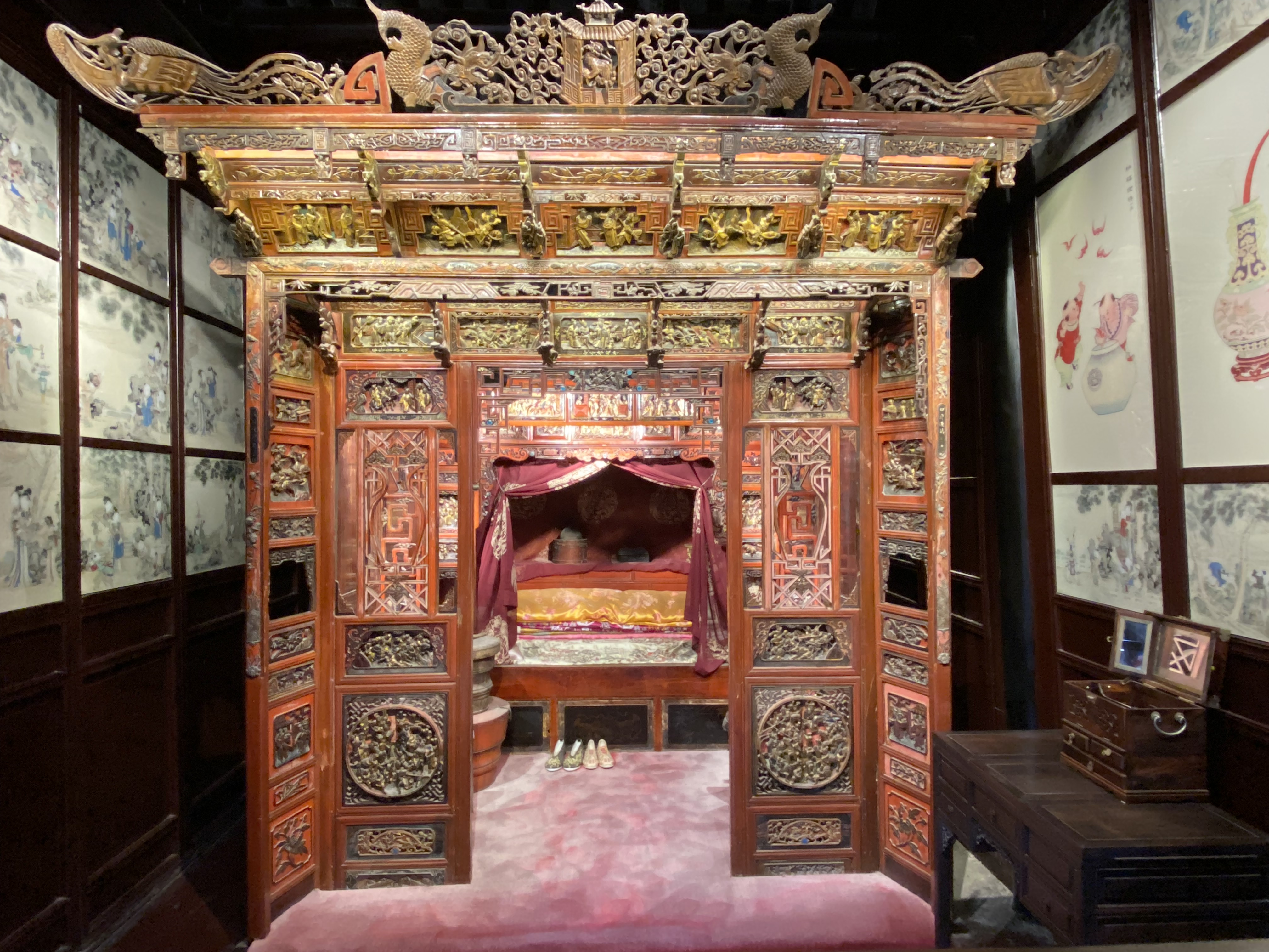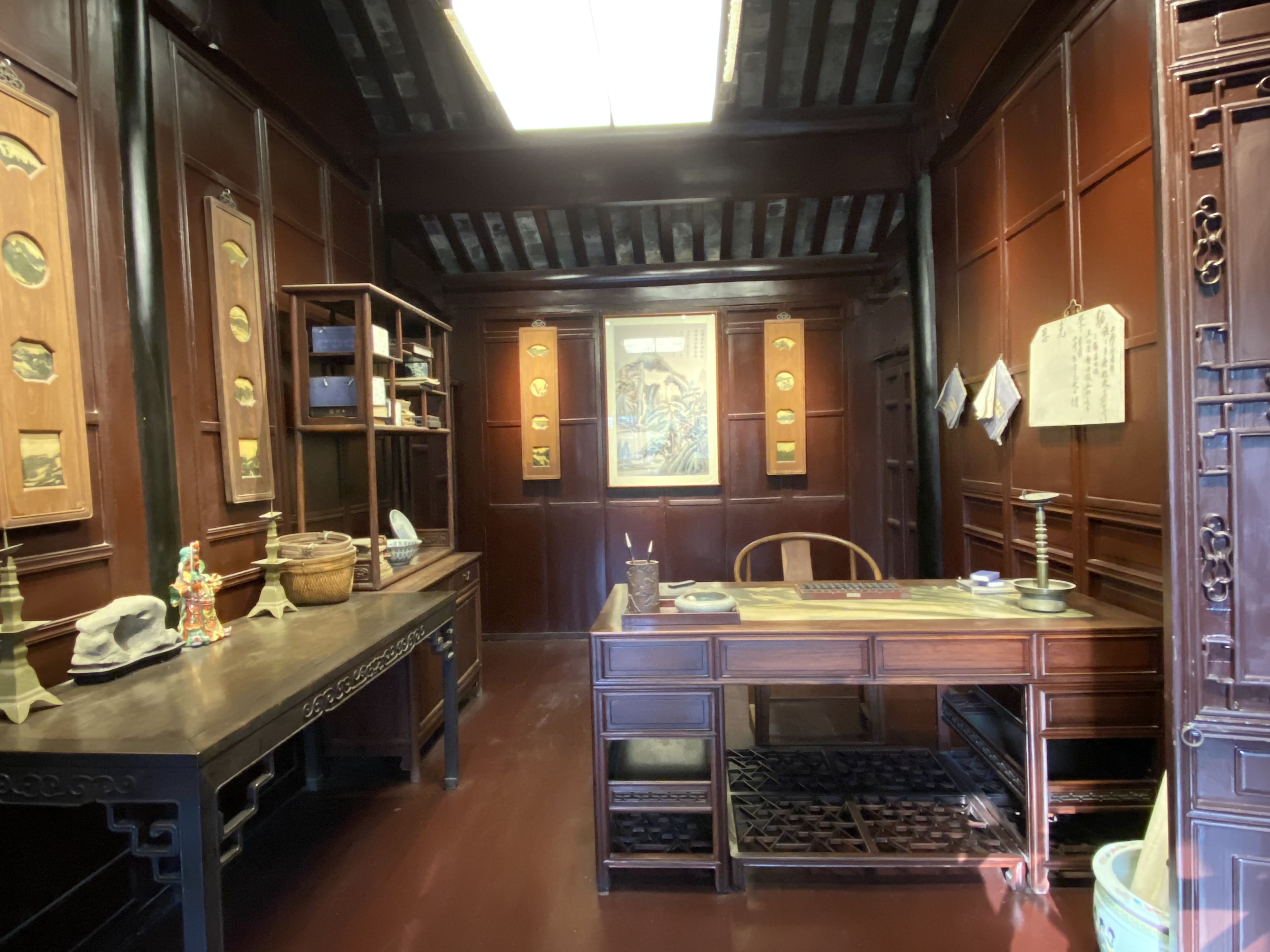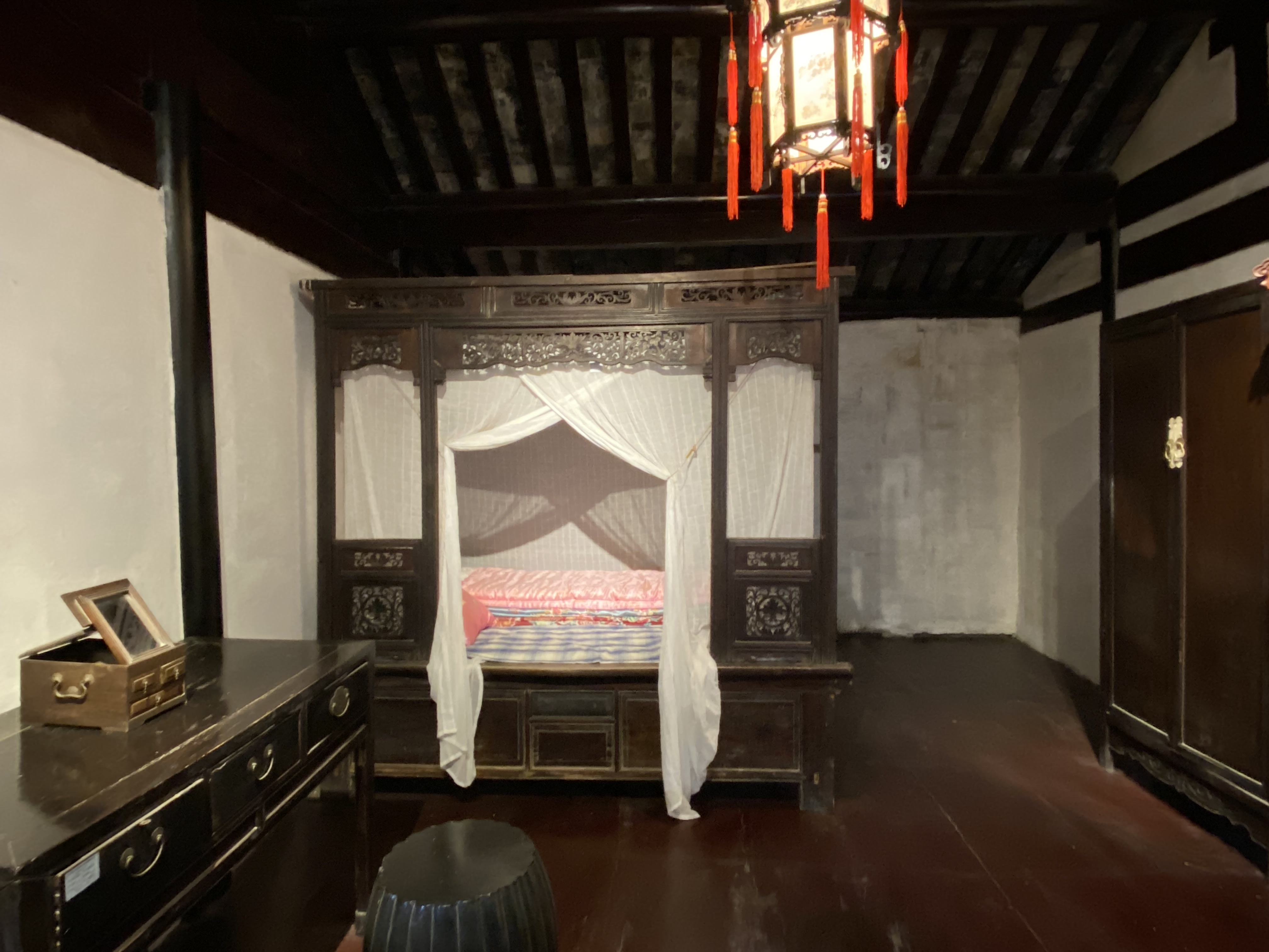 Le clou de votre visite doit être la Maison Shen (une autre maison mérite votre attention, la Maison des Zhang, magnifique aussi – Mais je dois faire des choix). Construite au milieu du XVIIIe siècle par les héritiers d’un très riche marchand, Shen Wanshan, elle compte plus de cent pièces (dont on ne peut voir qu’un dixième, c’est déjà impressionnant) autour de sept cours, sans compter les petites cours intermédiaires entre les bâtiments, plantées çà et là d’un arbre bien poétique.