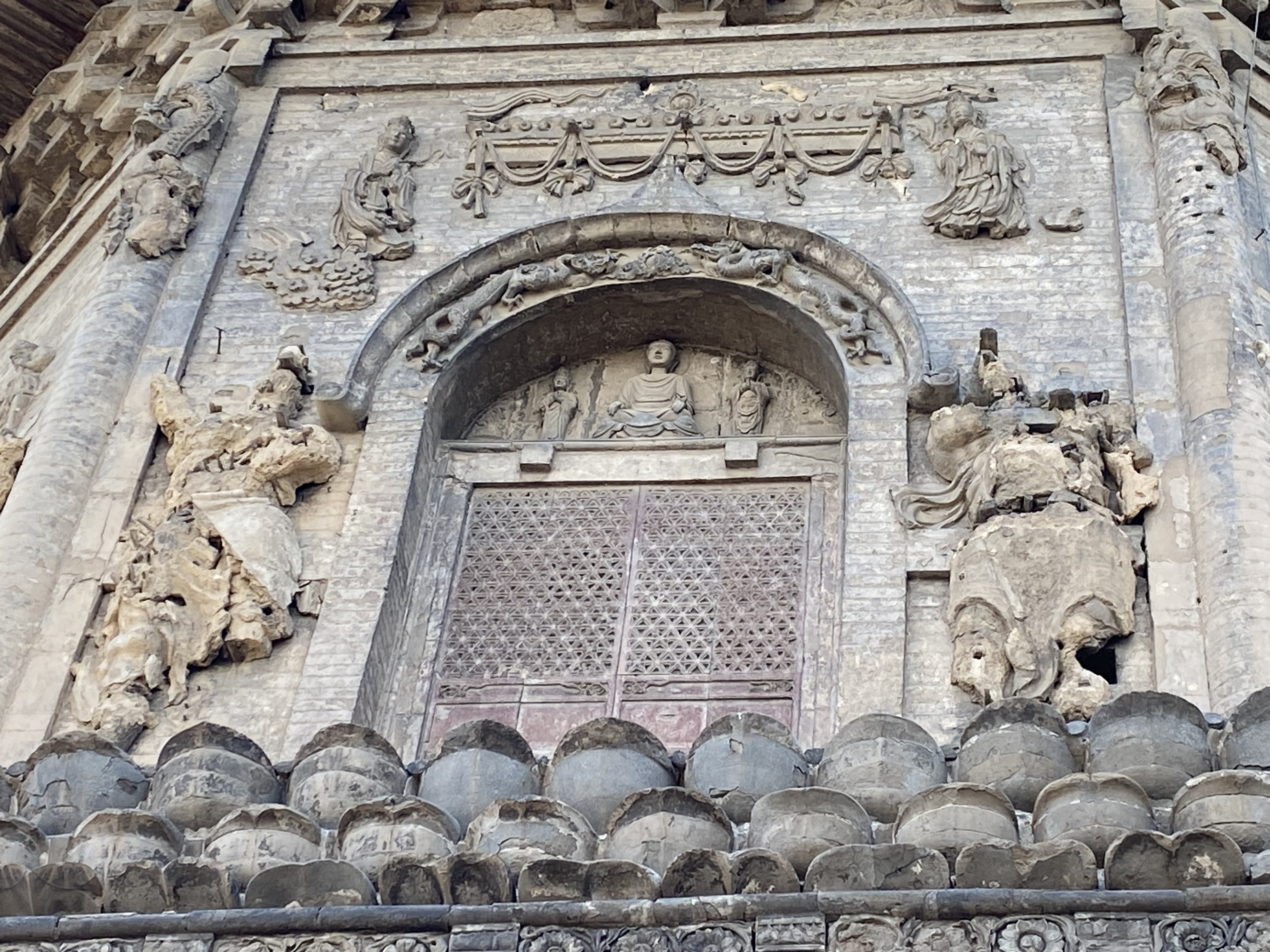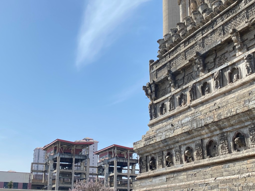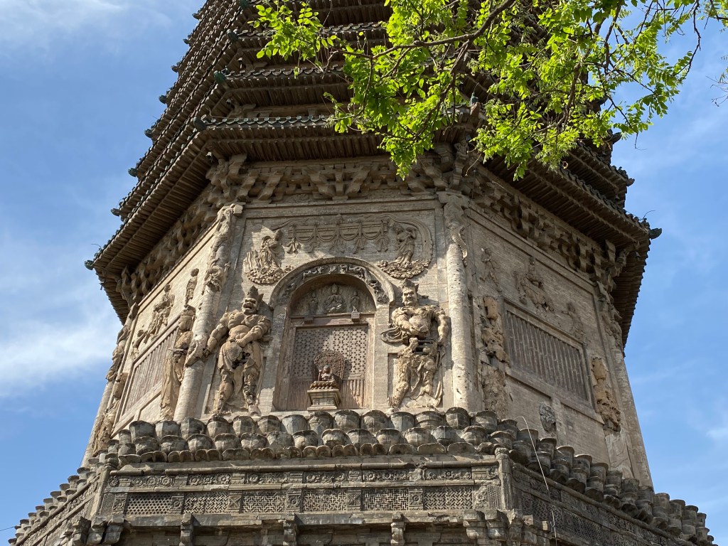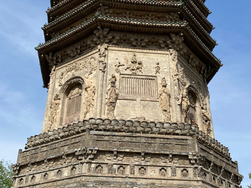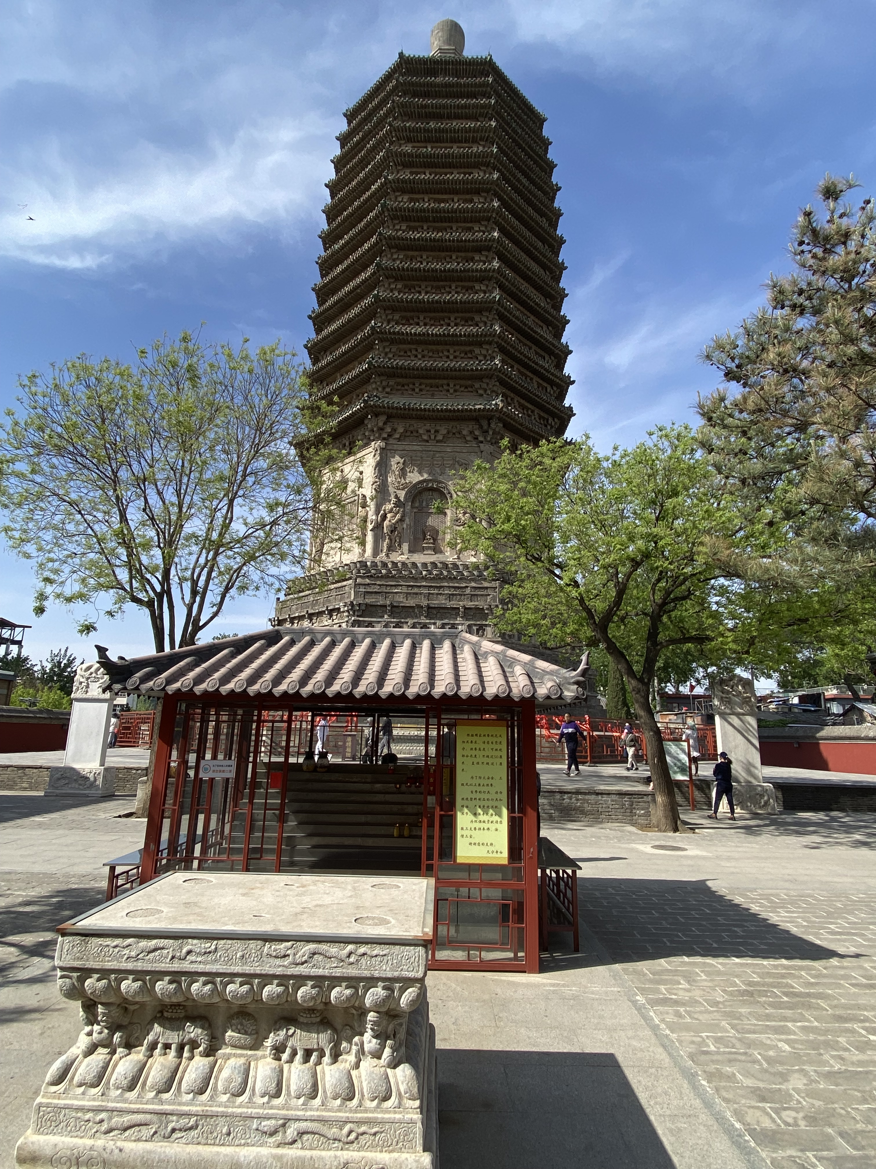 C’est un édifice octogonal, de treize étages, qui a été modifié sous les Empereurs Ming et Qing, sans toucher à la structure (pour citer ces modifications, par exemple la frise de lotus qui parcourt l’édifice horizontalement, initialement en métal, pour pouvoir recevoir de l’huile qui éclairent les lampes, a été reconstruite en briques). C’est un lieu spécial, où les Empereurs se rendaient lors de la fête du printemps, pour allumer des lampes en l’honneur de Bouddha, afin qu’il garantisse un temps clément et la richesse à la Chine pour la nouvelle année.