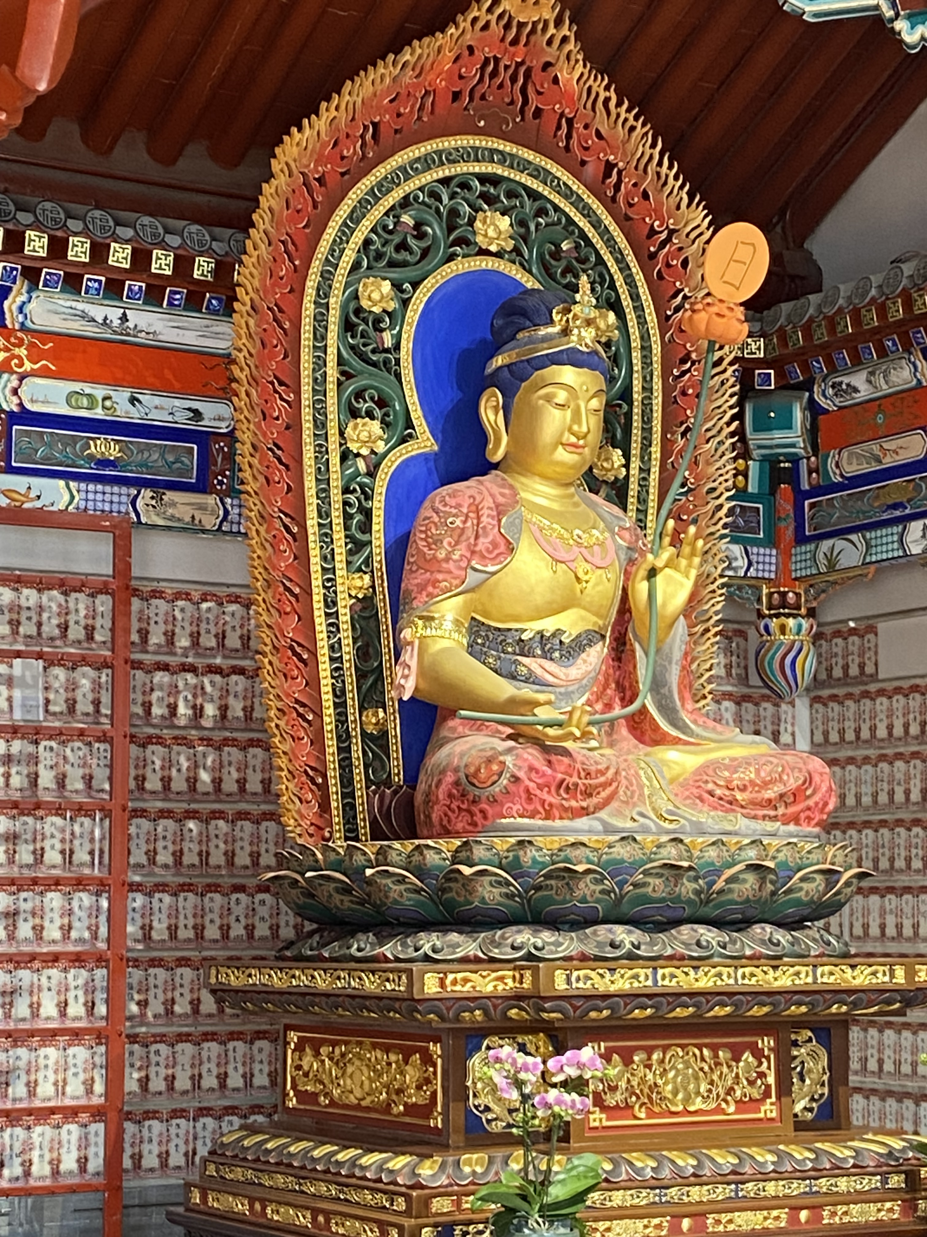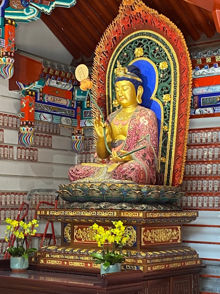 Au passage, je vois ce hall dédié à Bouddha, encadré par les divinités de la lune et du jour. Dans ce printemps qui ne cesse de nous rappeler à la nature, cela me semble bien approprié.