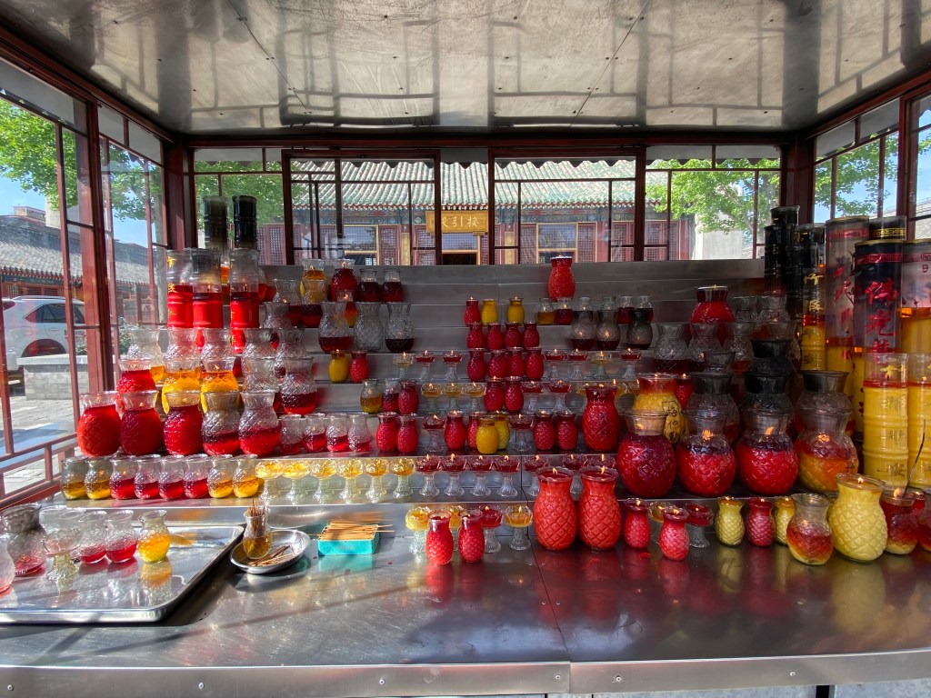 Comme tous les temples à Pékin, peut-être encore plus que dans nos églises, le culte est vivace. Bien des gens (et de plus en plus de jeunes, paraît-il) vont prier les divinités et leur faire des offrandes.