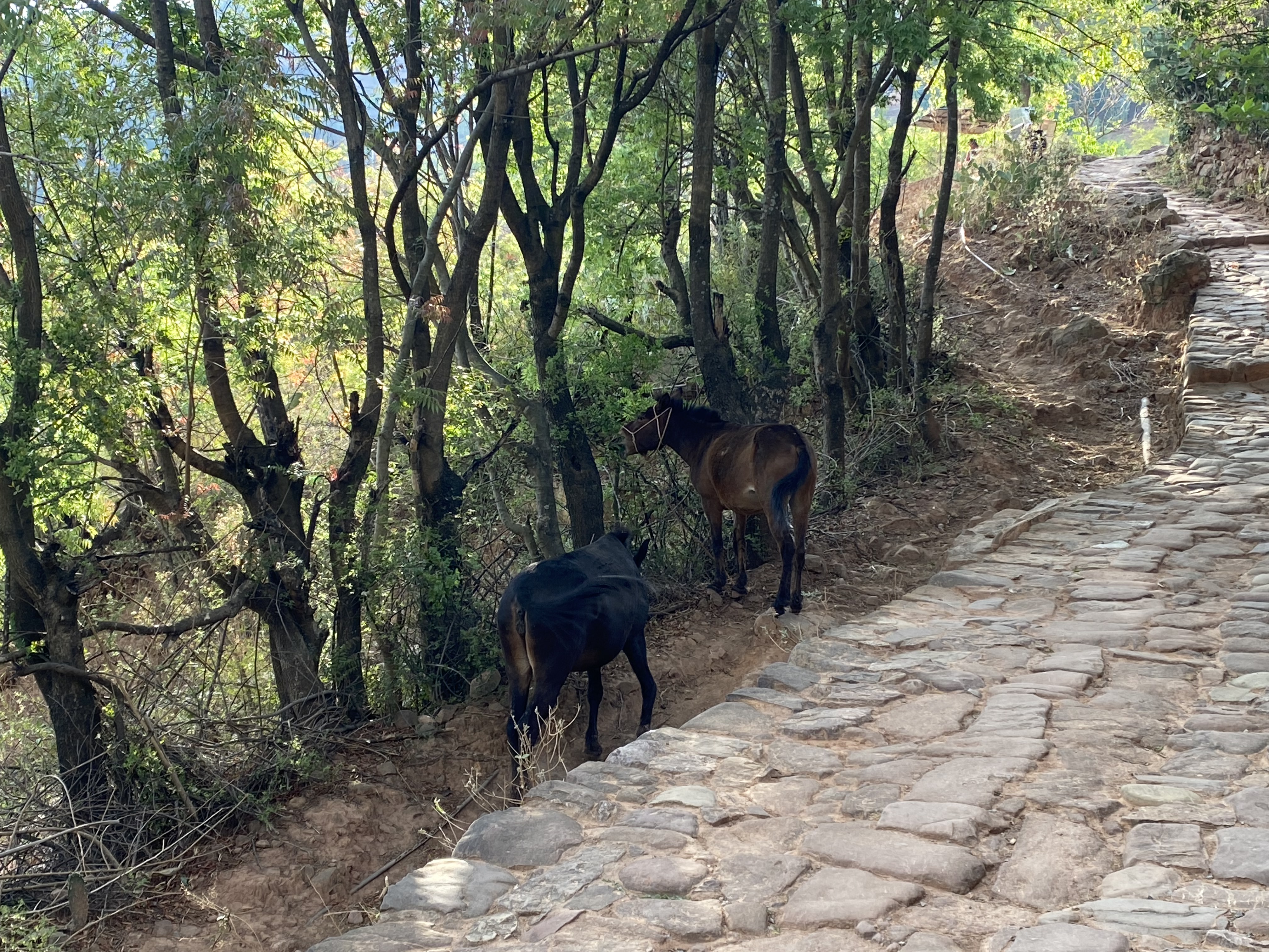 Après ce dîner, je suis repartie à l’assaut des hauteurs, pour voir le temple du village. Lors de mon ascension, j’ai croisé ces ânes en liberté, qui, avec les poules, font la population animale du lieu.