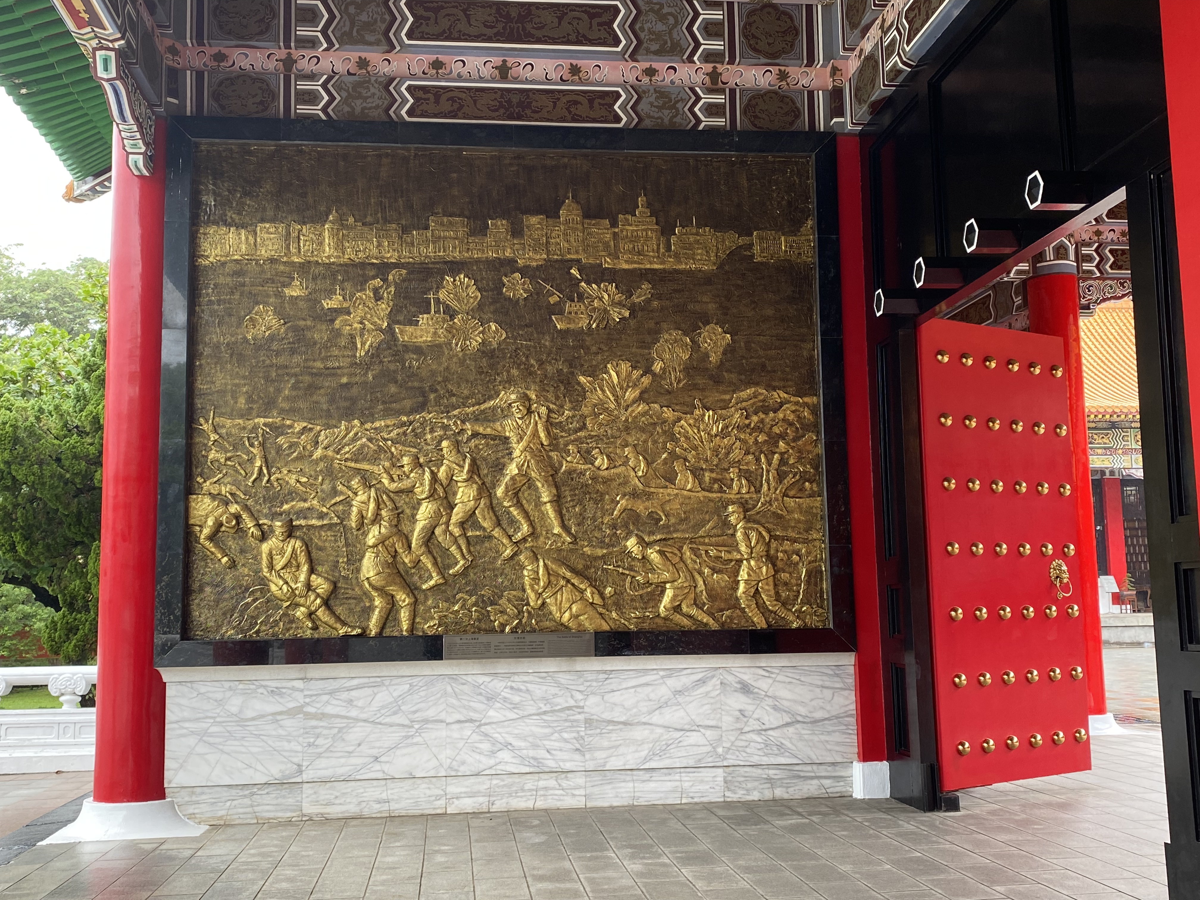Dans tout cet environnement de palais et jardin bien chinois, sont « incrustées » des plaques commémoratives, rappelant l’horreur des combats, ainsi qu’une litanie d’hommages aux victimes (non photographié). De nombreux combattants sont tombés lors de la bataille de Guningtou (ou Kinmen), du nom d’une île au large de la Province du Fujian en Chine, qui opposa les forces de la République de Chine aux Communistes entre le 25 et le 27 octobre 1948 et vit la défaite de ces derniers, mais au prix de très importantes pertes du côté de la République de Chine.