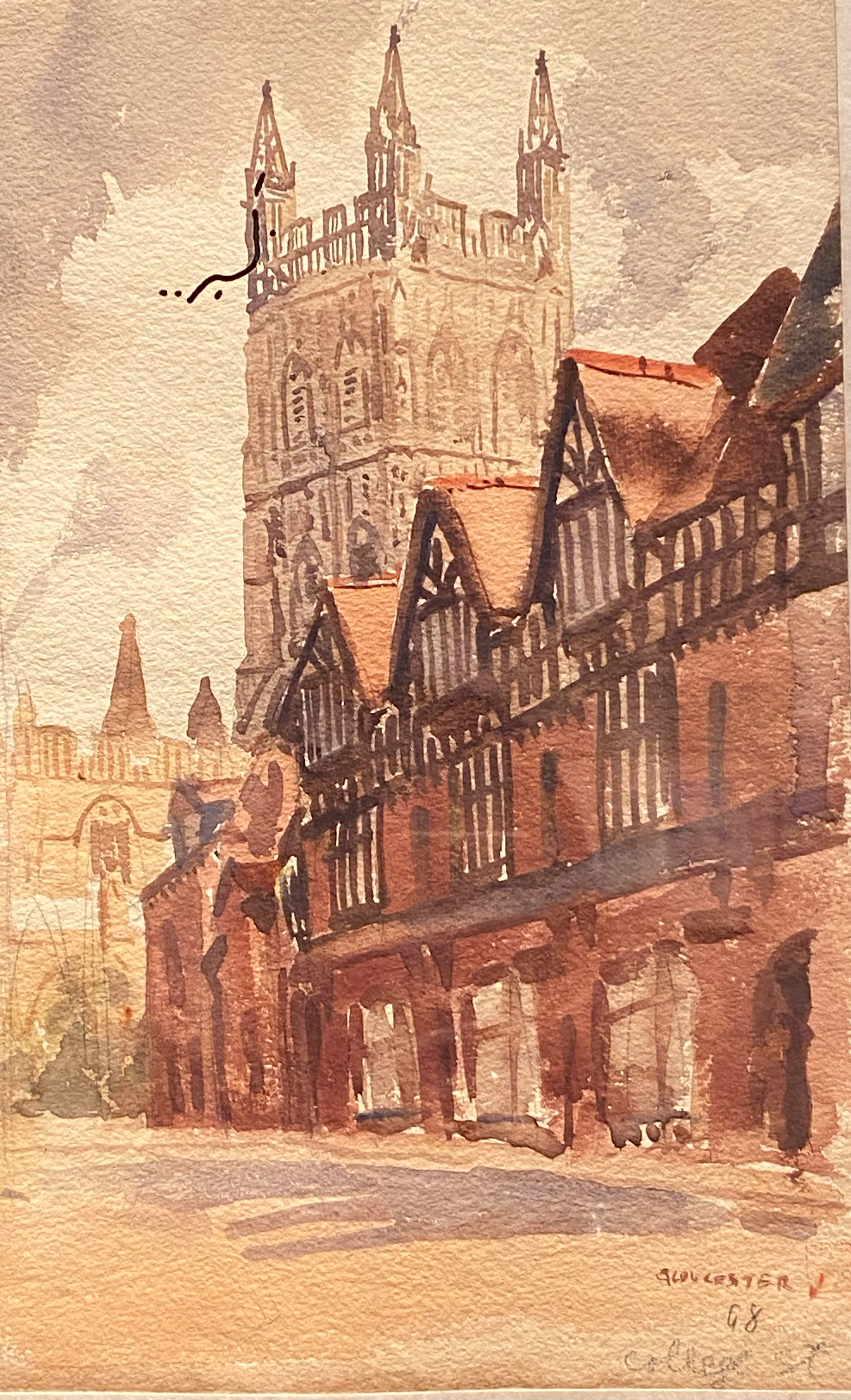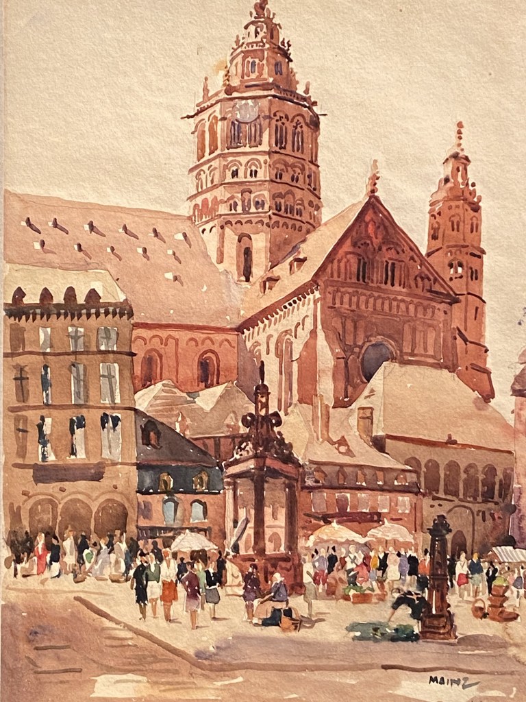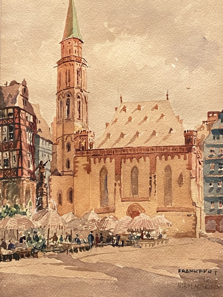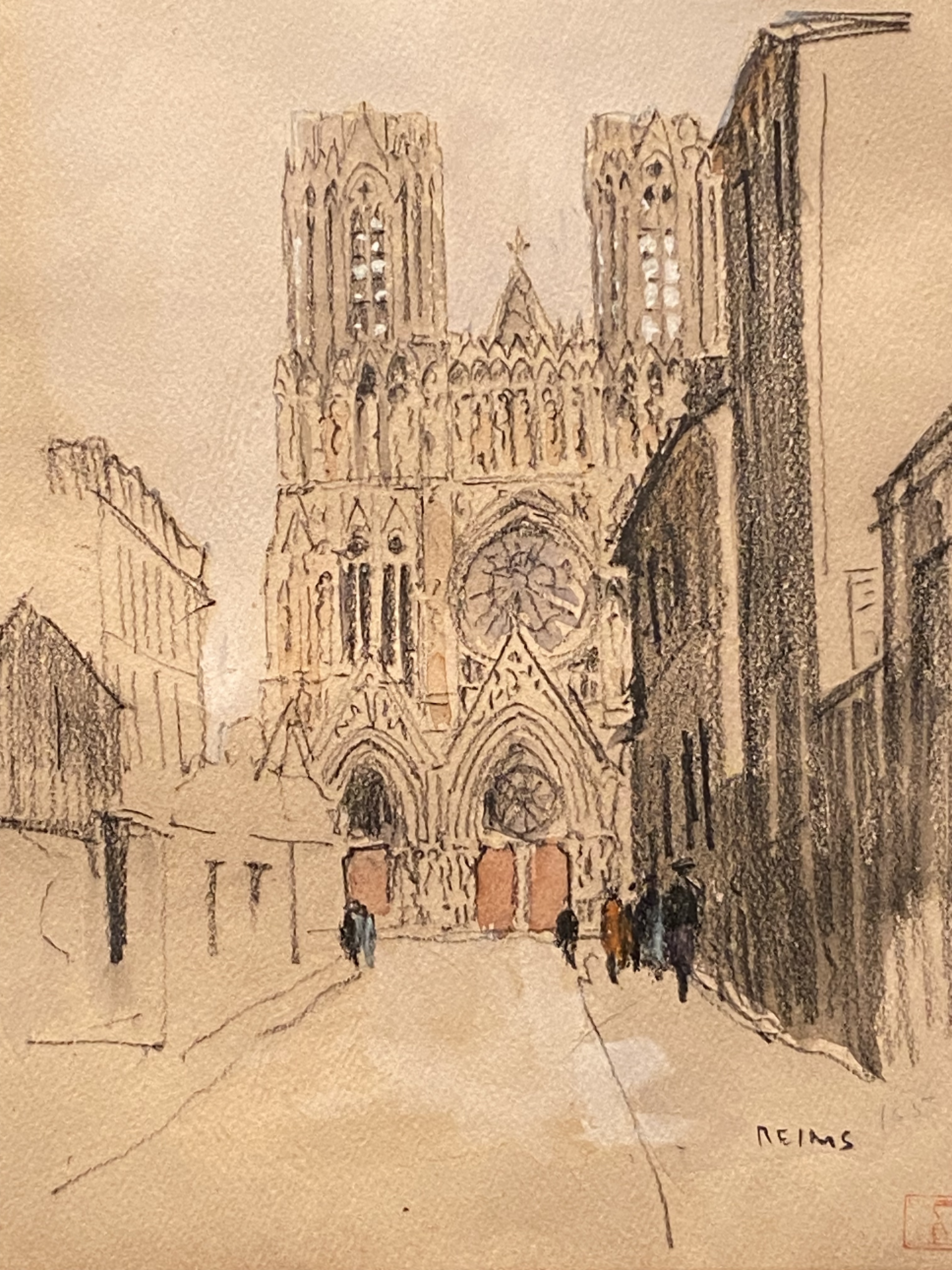 Notre voyageur a été apparemment fasciné par les joyaux de l’architecture gothique que sont les cathédrales. Au fil de son pinceau, il en restitue les lignes de force dans des teintes grèges et noires qui accentuent leur apparence sculpturale.