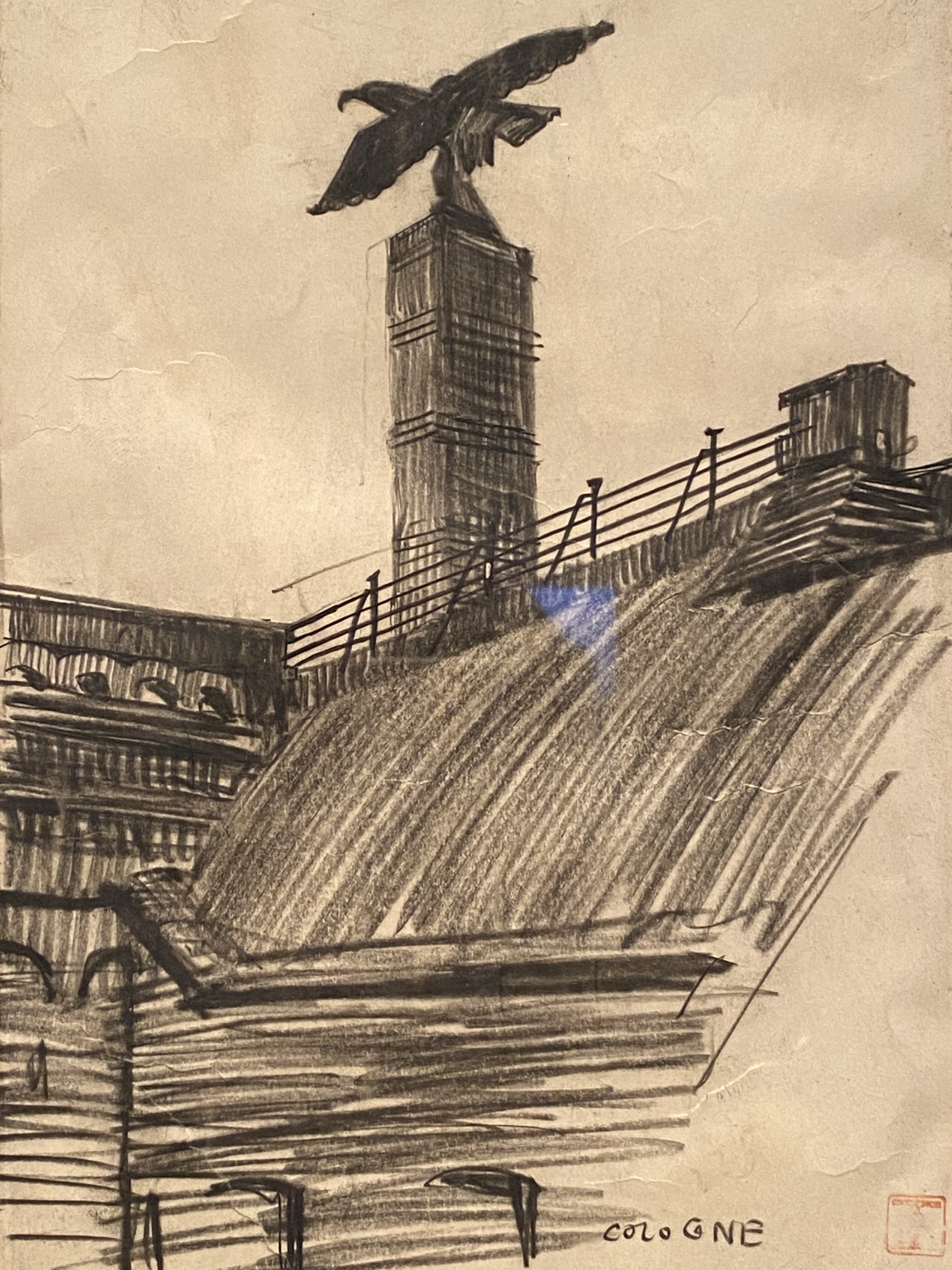 En Allemagne, il croque également d’autres bâtiments, tel cet aigle surmontant un bâtiment de Cologne, rendu à grands traits de fusain, tout en noirceur, comme une prémonition de l’avenir proche.