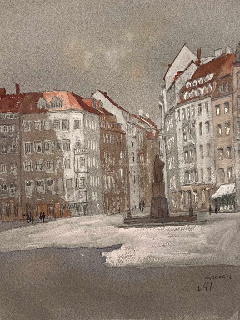 J’ai particulièrement aimé cette aquarelle de Dresde, où la ville, cernée par la neige dans le ciel comme sur le sol, prend une teinte d’un gris métallique à peine réchauffée par les tuiles des toits.