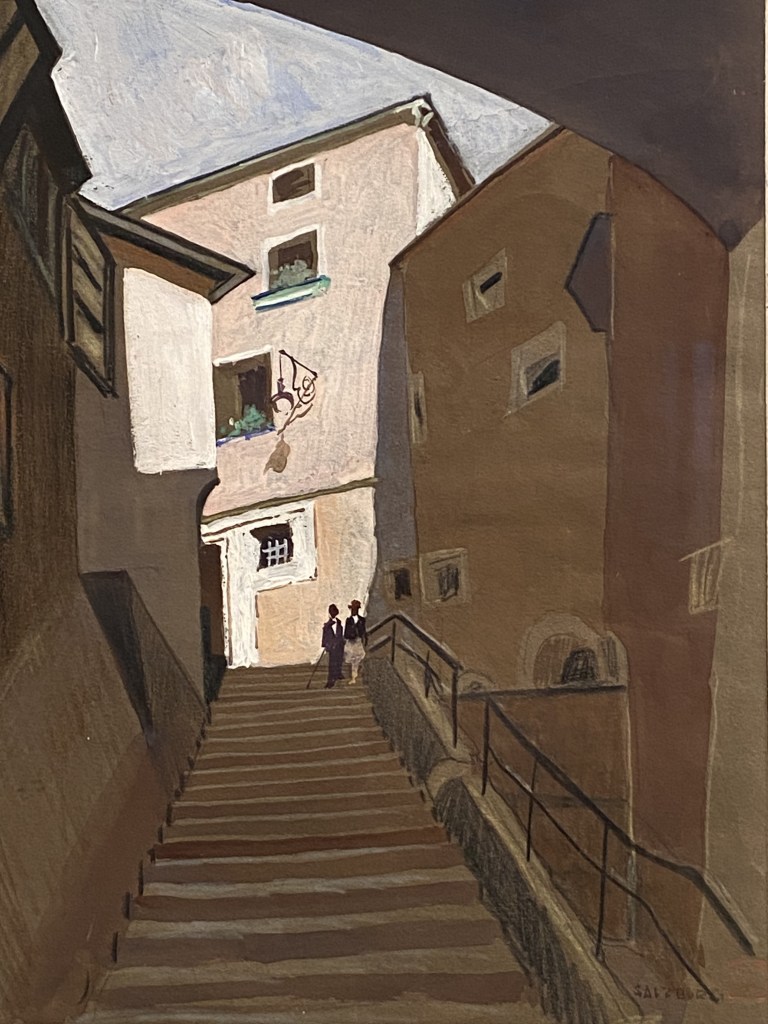 Cette peinture – pour une fois l’artiste a délaissé son aquarelle de prédilection- est sculpturale, nous y sommes, dans ces ruelles où le soleil rare dessine de franches démarcations entre ombre et lumière. Magnifique.