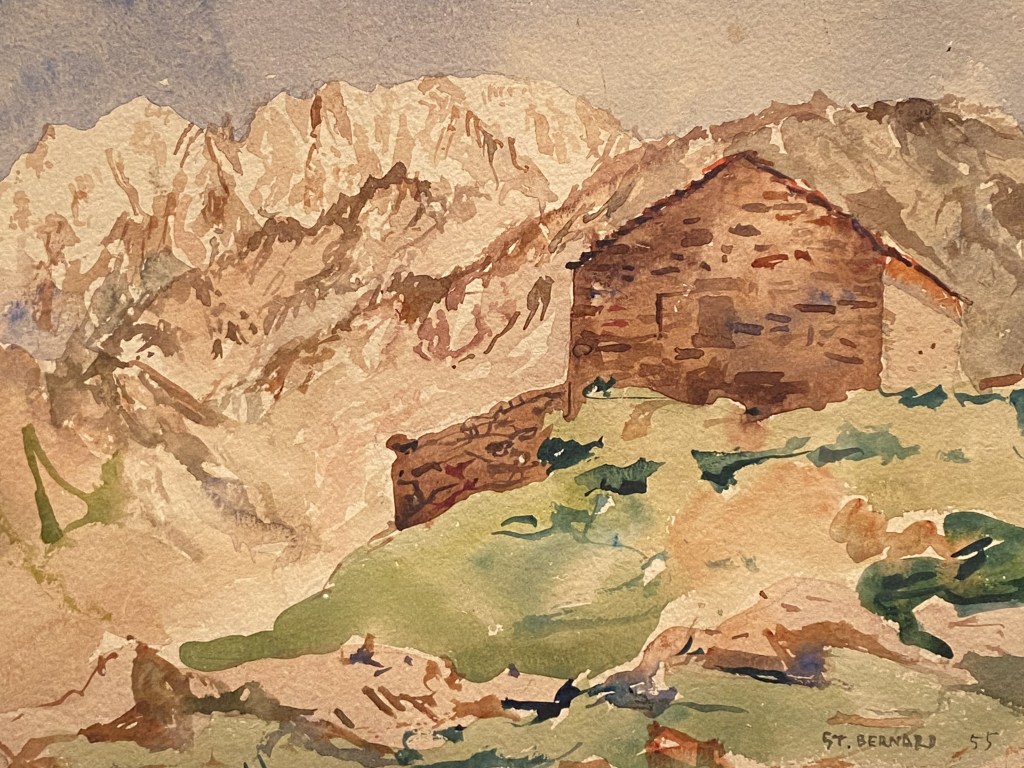 Passage obligé depuis plusieurs siècles pour les riches voyageurs qui pouvaient faire un périple en Europe, le Col du Saint-Bernard est ici rendu dans toute la rudesse de sa nature, où la neige des montagnes environnantes s’affronte au renouveau de la nature dans cet été 1930.