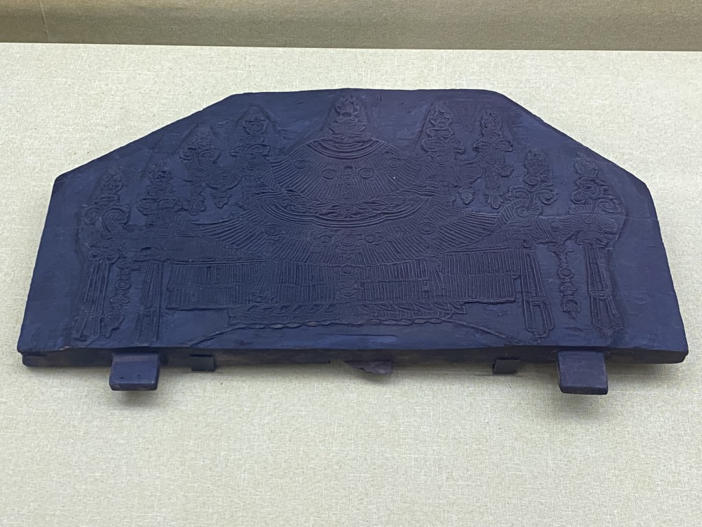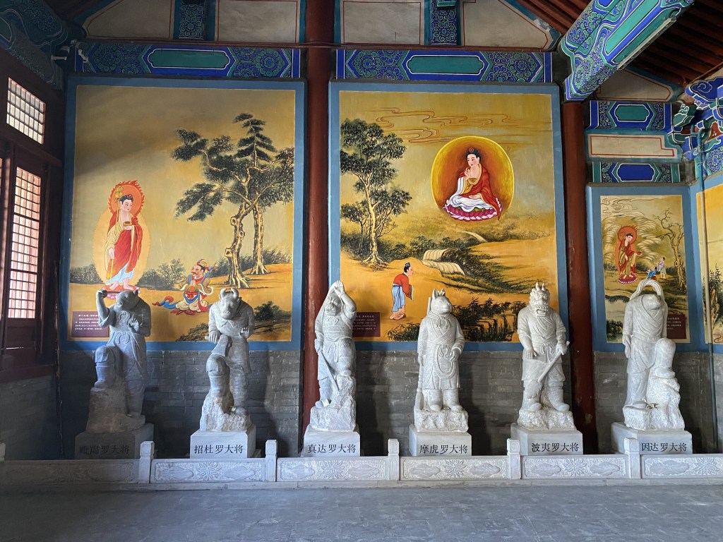 Le temple déploie ses 7 hectares le long de la montagne, il faut gravir la pente (douce) marche après marche, comme une allégorie de l’ascension spirituelle du croyant bouddhiste. Sa construction date des VIe/VIIe siècle, il comprend cinq cours et six halls majeurs qui s’échelonnent d’est en ouest, mêlant des bâtiments destinés aux moines et d’autres aux dynasties impériales, puisqu’il a longtemps bénéficié de la protection de différentes dynasties. Il était très connu pour la rédaction de sutras sur bois 木, pierre 石 et papier 纸, dont l’on peut admirer de magnifiques (et très rares) collections dans des pavillons adjacents aux cours (les plus anciens datent de la fin du VIIe siècle, les plus récents du XVIIe siècle).