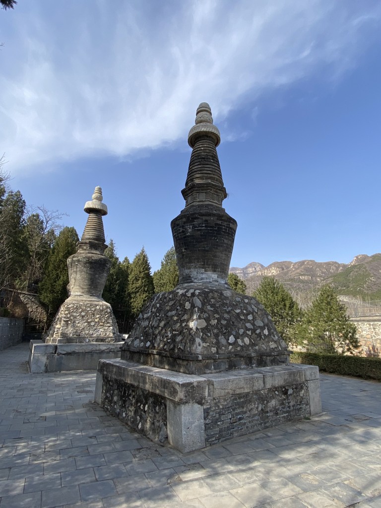 Elle donne sur un promontoire où trois tombes en forme de stupa abritent les restes de trois prestigieux abbés de l’époque Qing.