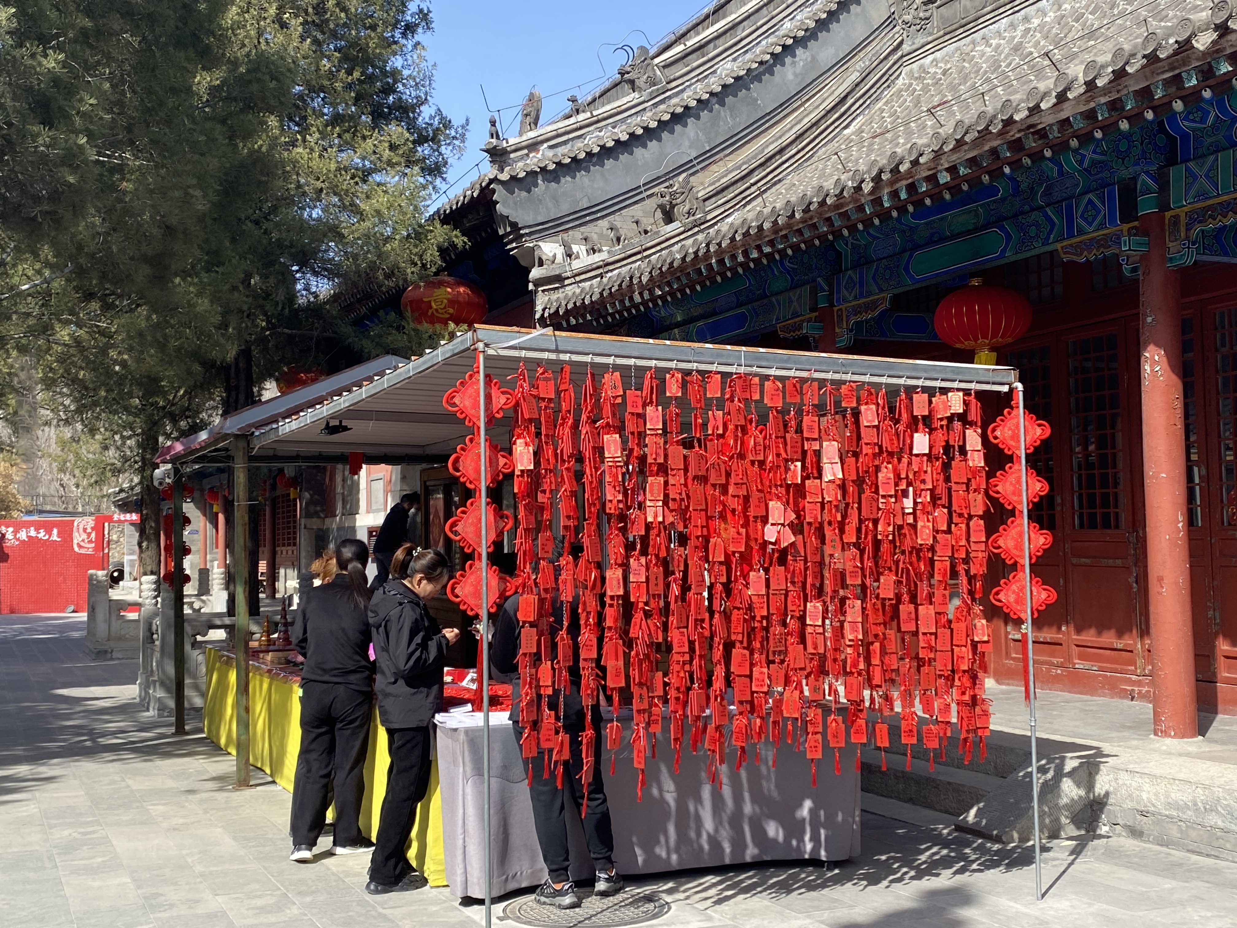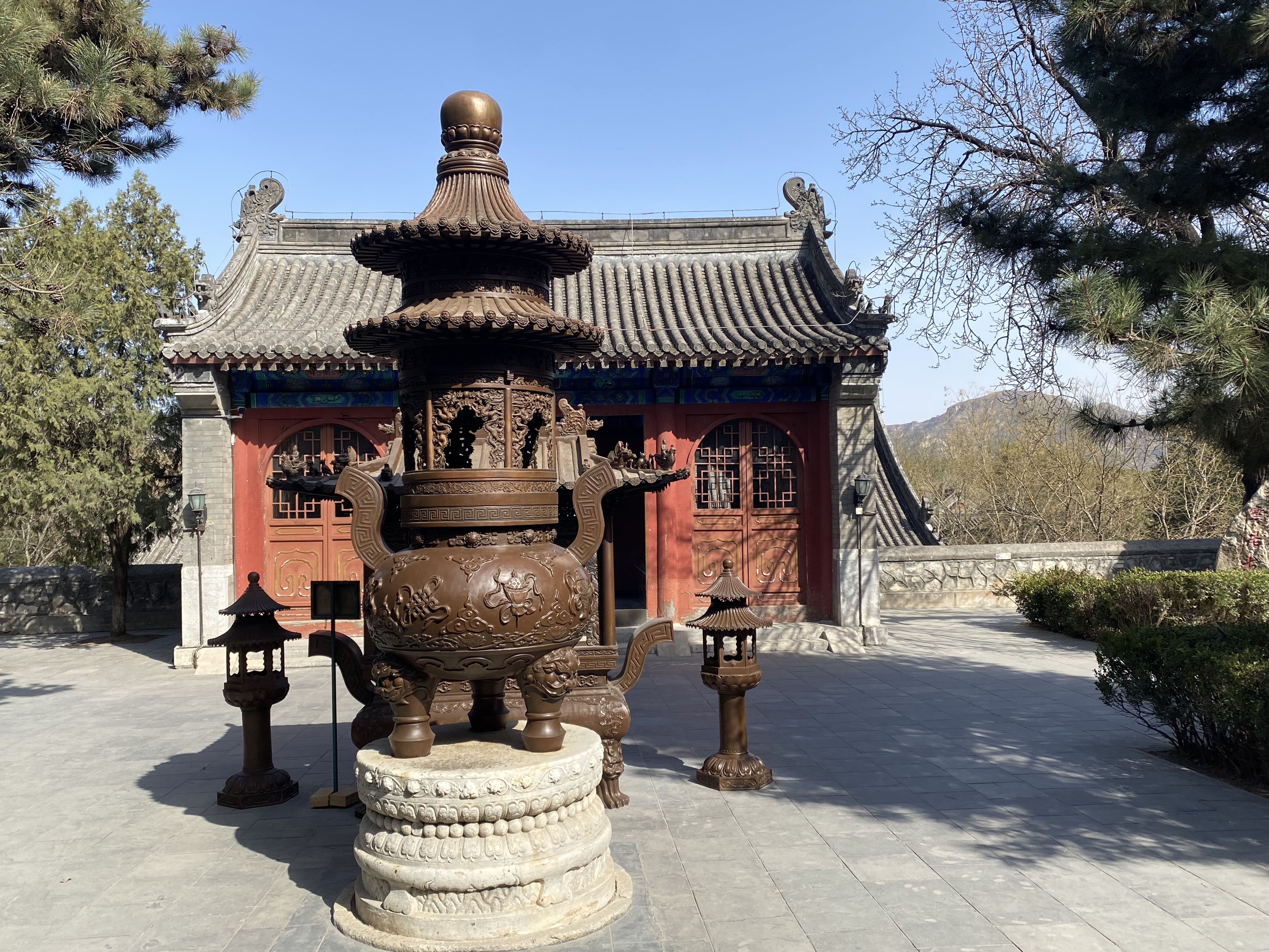 J’ai ressenti ici une paix hors du temps. Très peu de visiteurs, la plupart étant des fidèles qui faisaient des offrandes aux divinités bouddhistes, j’ai été régénérée par la beauté religieuse du lieu, la chaleur du soleil de printemps et l’air pur des montagnes alentour (d’aucuns m’ont expliqué que Pékin était très pollué ce jour-là, a priori pas partout).