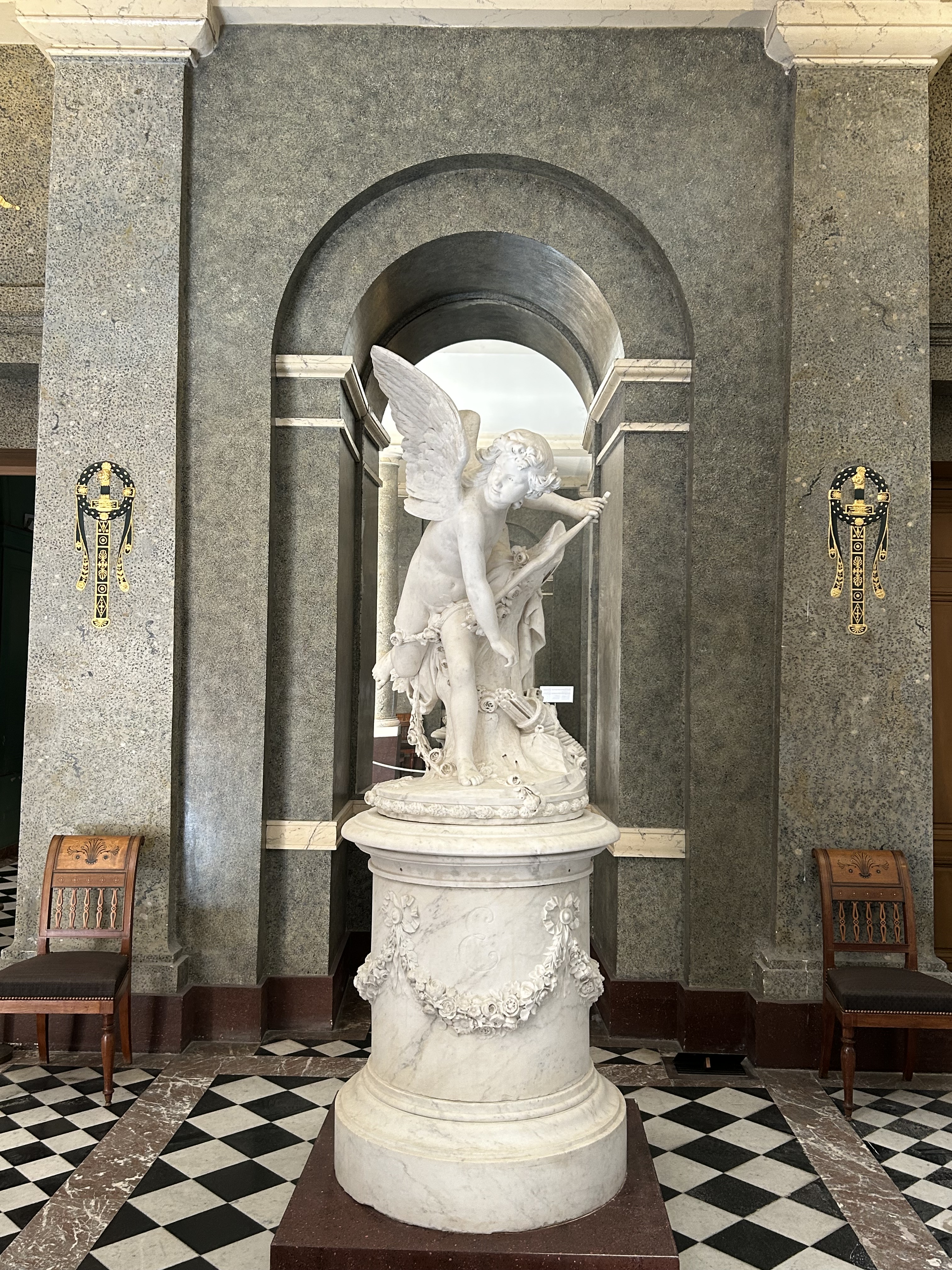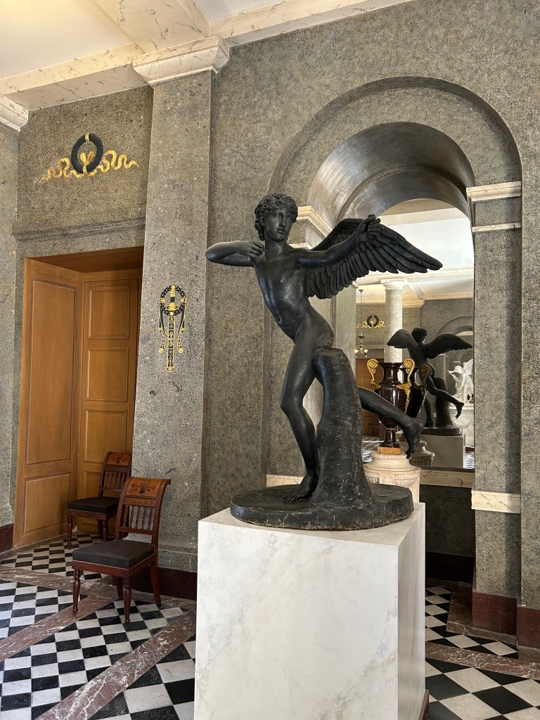 Dès que nous pénétrons dans le lieu, le hall donne le la. Marbre et statues issues de l’Antique dessinent un vestibule romain.