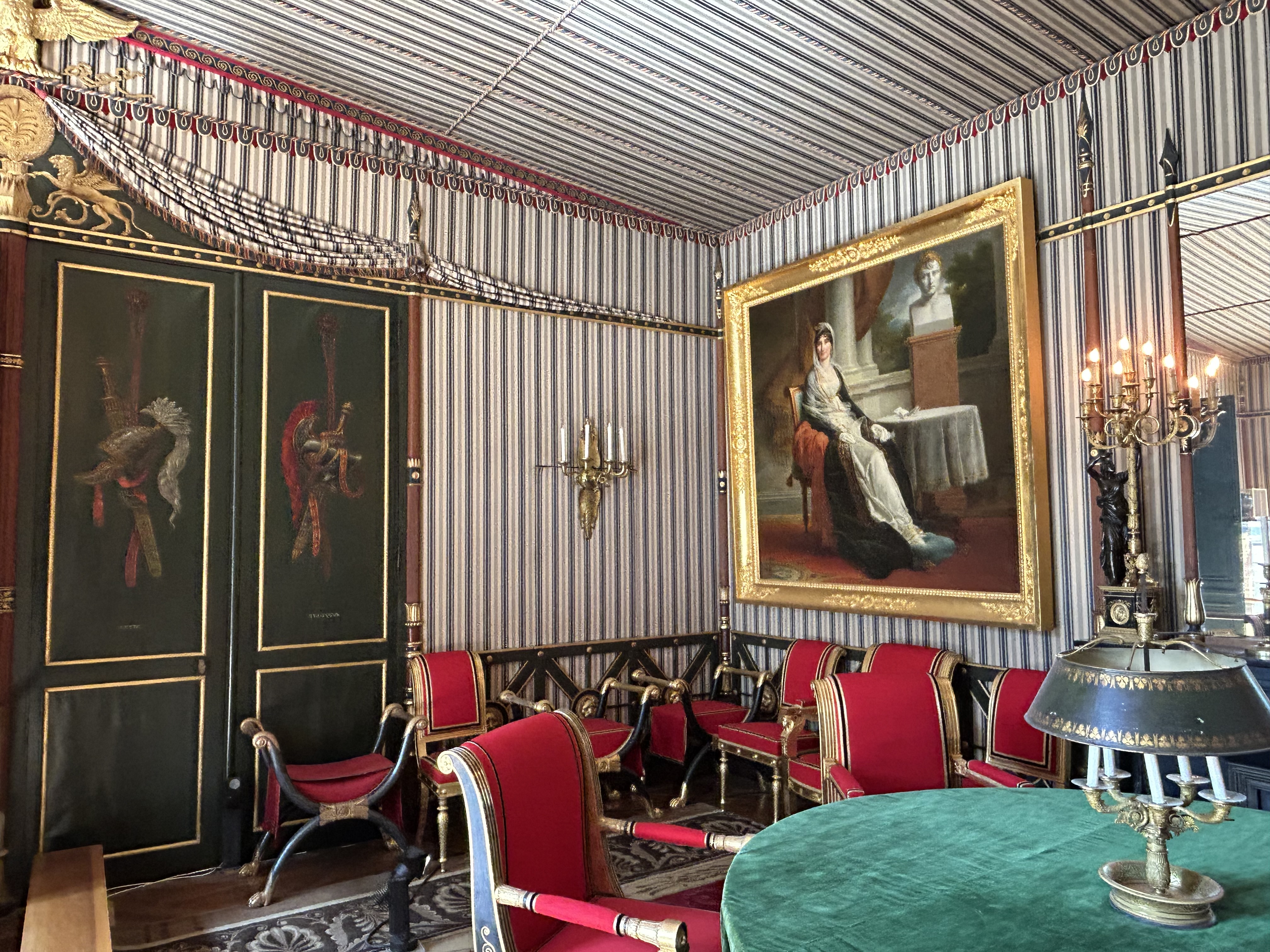 Napoléon s’étant installé à Malmaison, certaines pièces ont été spécialement aménagées pour lui, comme cette salle du conseil, revêtue de panneaux à l’inspiration romaine et aux murs façonnés en forme de tente (rappelant sans doute les grands généraux itinérants du monde antique, tel Alexandre le Grand).