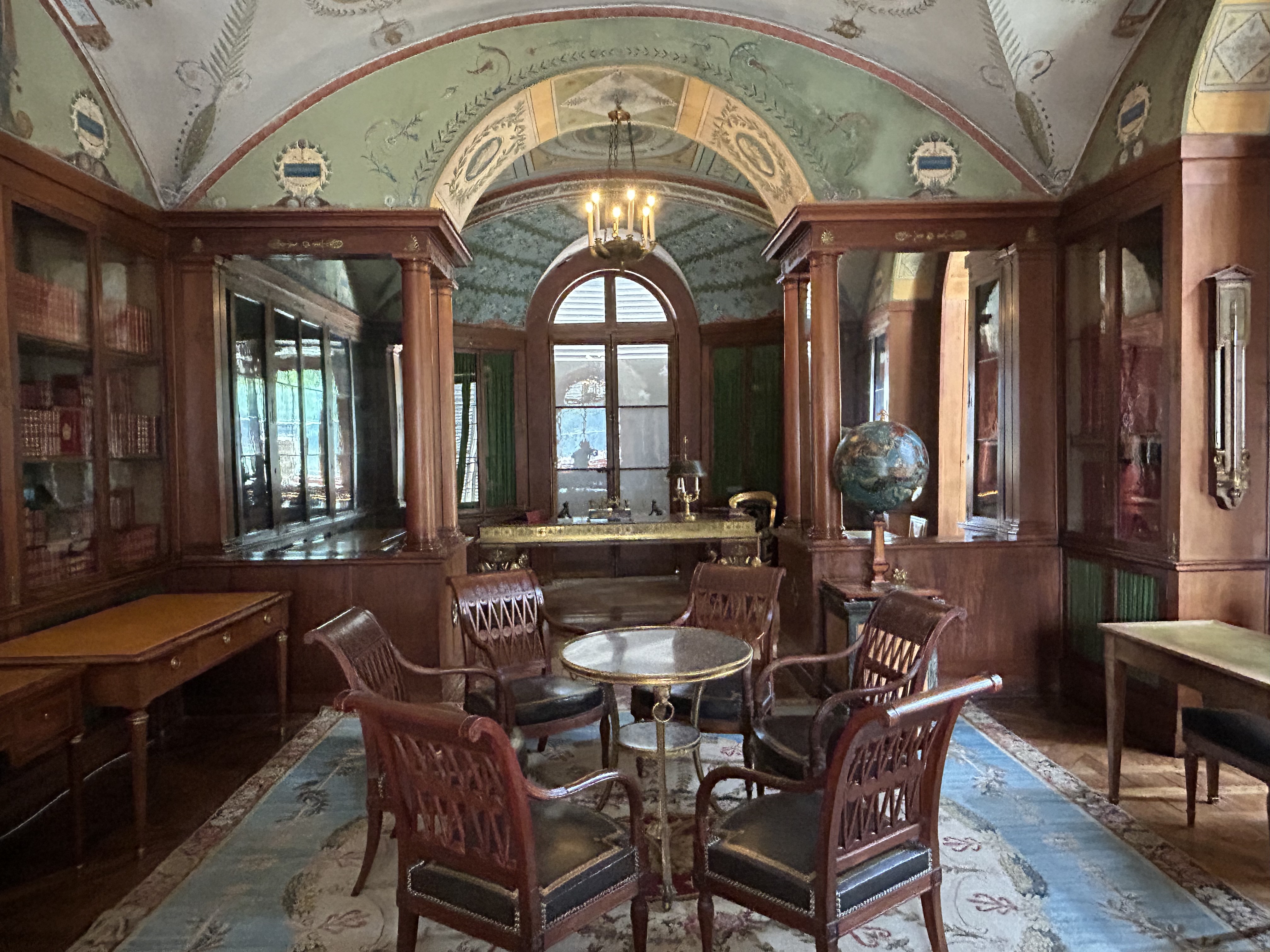 A l’extrémité du rez-de-chaussée se trouve le bureau de l’Empereur, aux plafonds décorés dans le style de Pompéi, pendant que les murs s’ornent de belles bibliothèques de bois rehaussées de miroirs. L’Empereur y avait faire un escalier dérobé qui lui permettait de passer directement à l’étage supérieur, celui des appartements privés dont nous allons avoir un aperçu bientôt (cela fait très guide des monuments de France, non ? 😉).