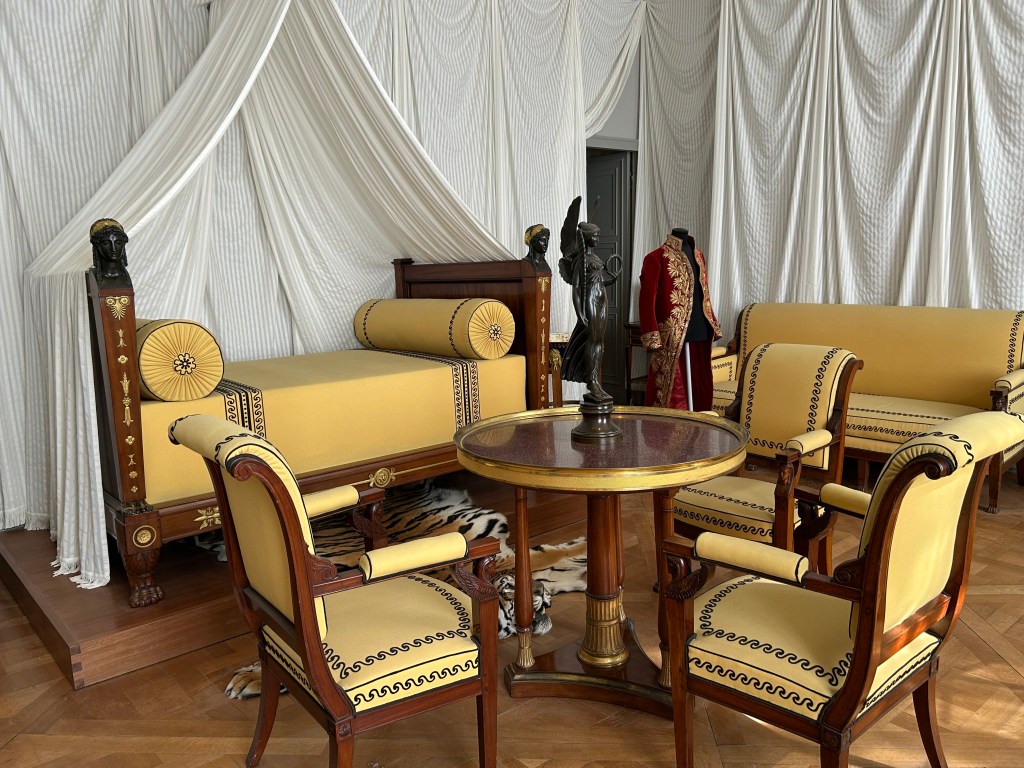 A l’étage supérieur se trouve la chambre de l’Empereur, toujours en forme de tente pour rappeler qu’il est avant tout un chef de guerre, toujours en mouvement sur le terrain. Les meubles raffinés sont tout en réminiscence d’Egypte. M’est venu à l’esprit que la couleur jaune était celle des empereurs en Chine ; mais je ne sais pas s’il y a un rapport quelconque ici.