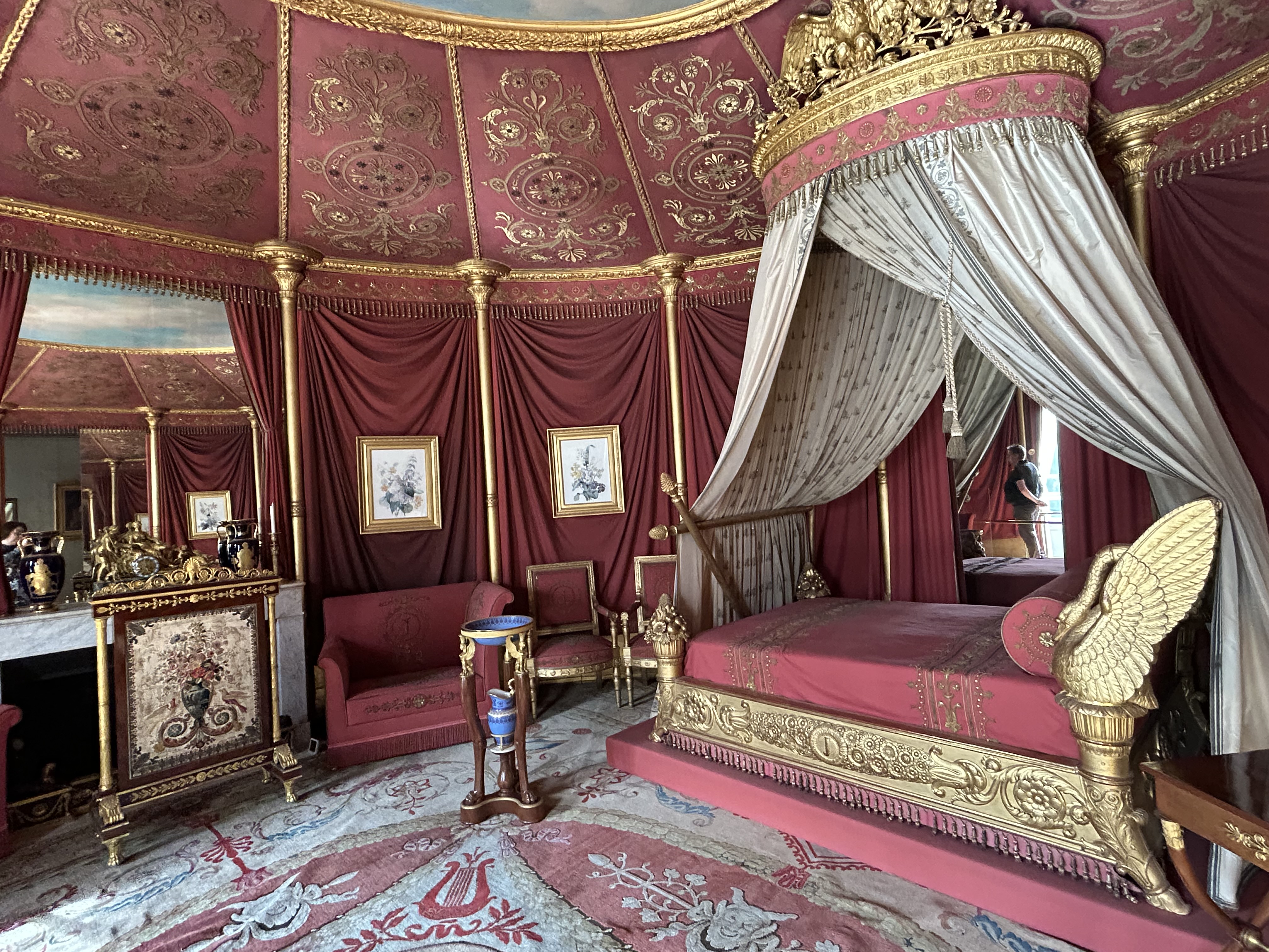 La chambre de l’Impératrice est elle aussi magnifique, avec ce lit somptueux adossé à des cygnes. Ce fut également son lit de mort, une émotion nous saisit devant ce lieu chargé d’histoire.