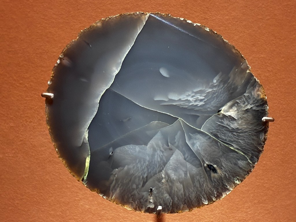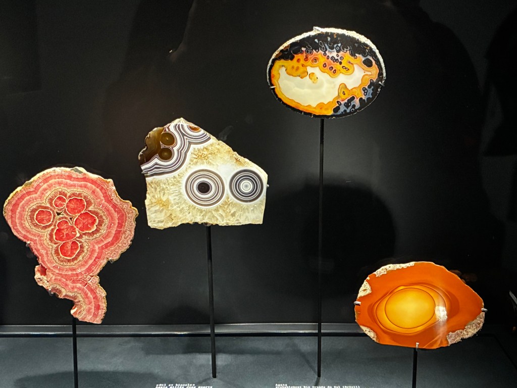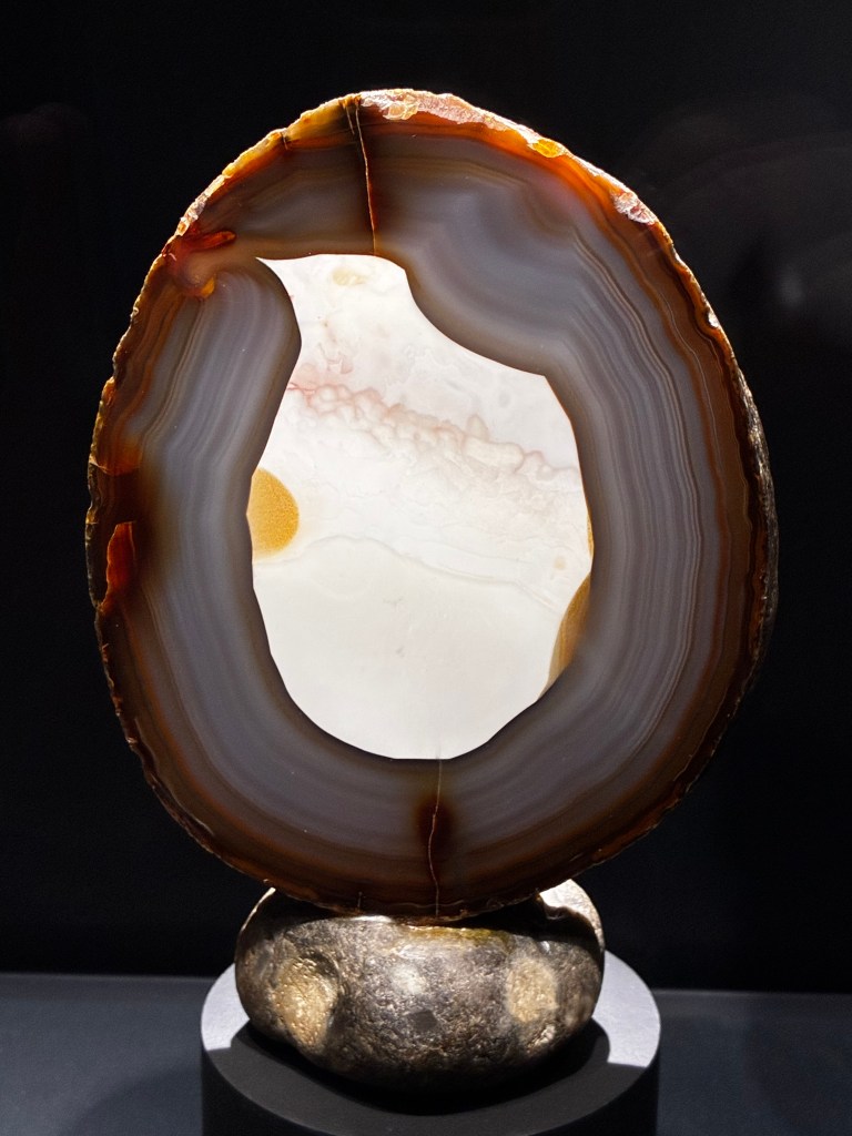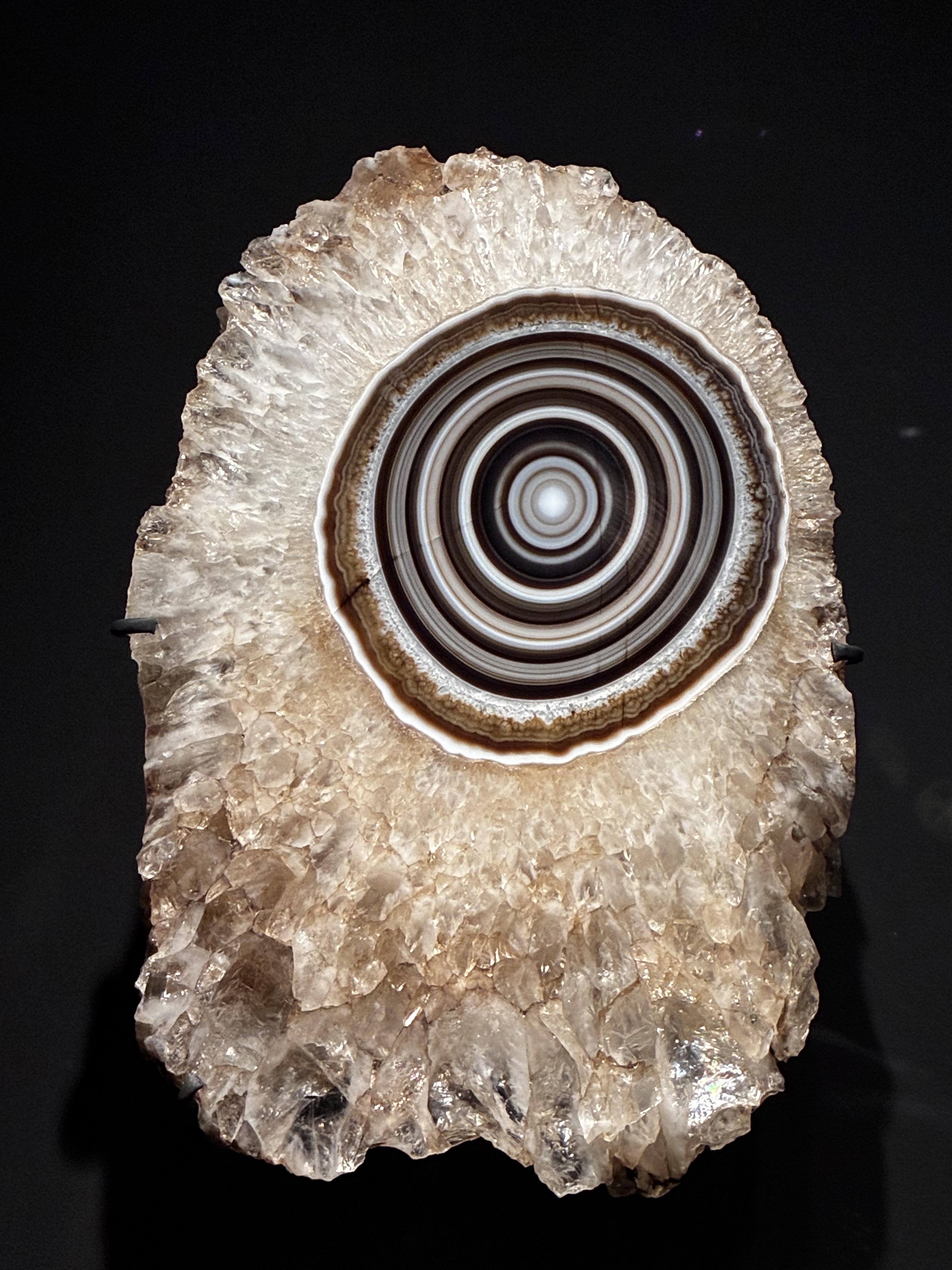 Il y a aussi ces merveilleuses concrétions, où les pierres s’entremêlent pour faire des créations inédites, où un œil fait d’onyx ou d’agate, à la courbure presque parfaite, surgit d’une gangue de quartz. Nous aurions presque envie de nous perdre dans ces regards scrutateurs et immobiles.