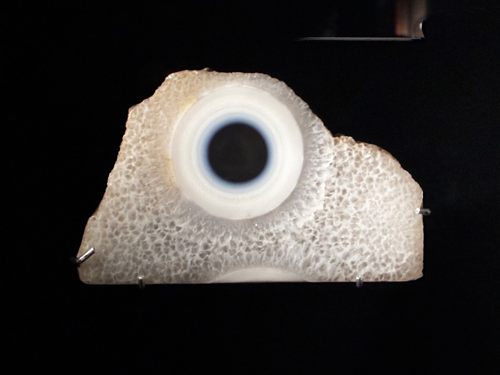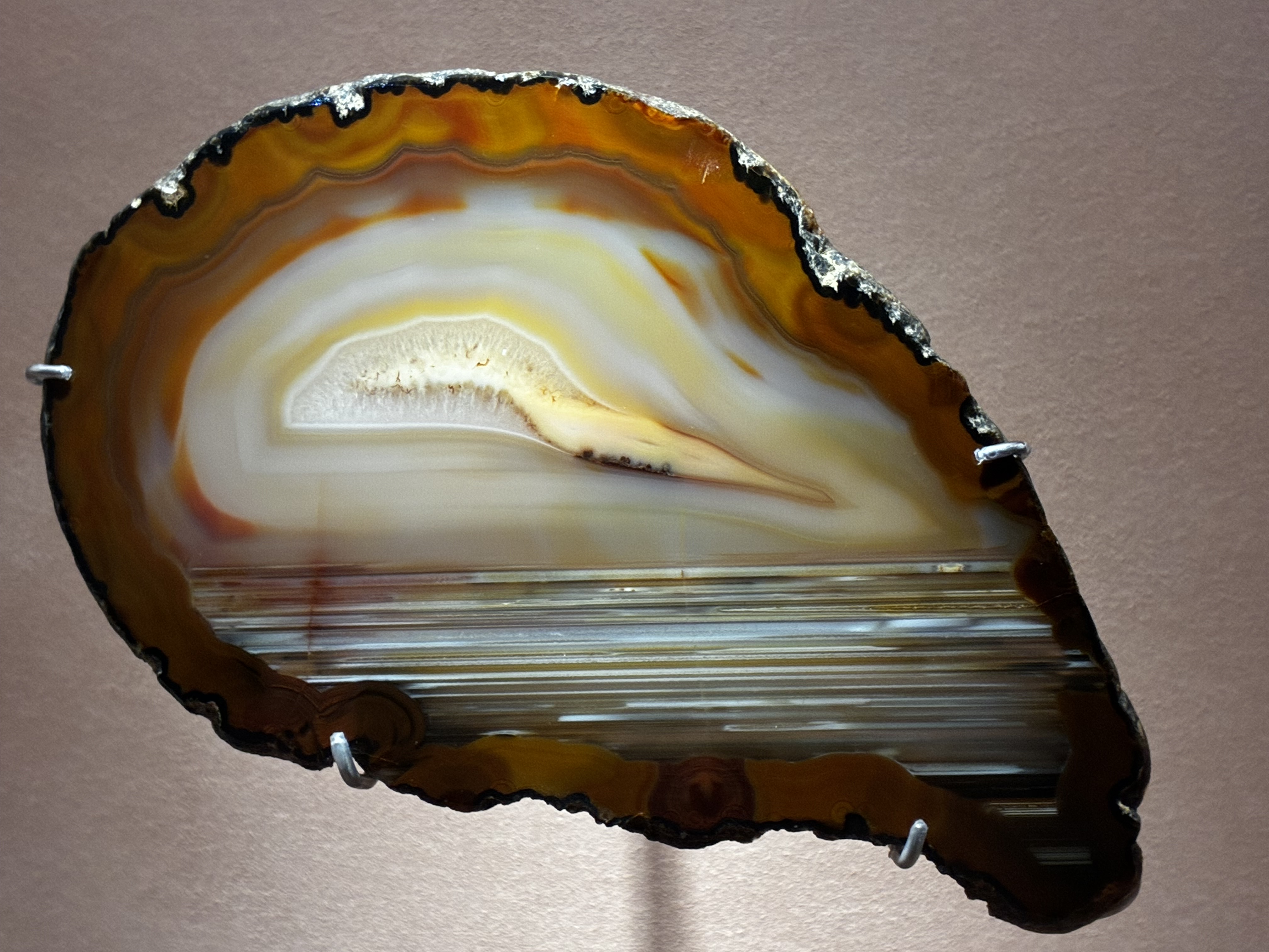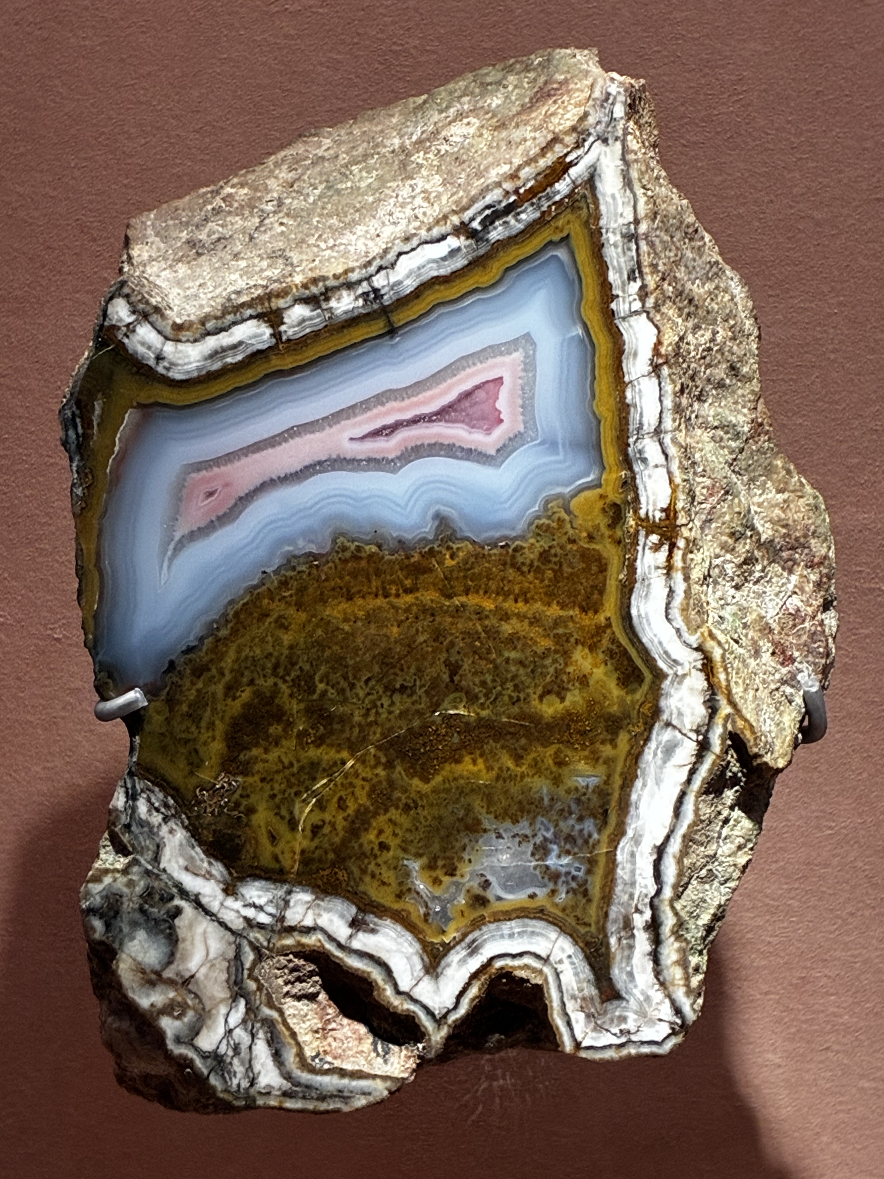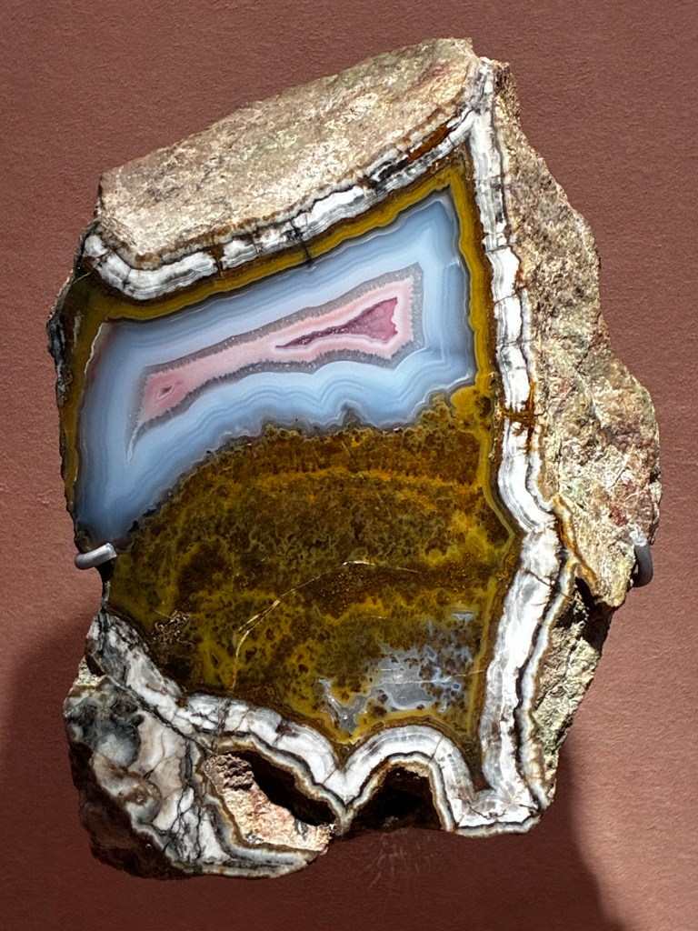 Il y a aussi ces merveilleuses concrétions, où les pierres s’entremêlent pour faire des créations inédites, où un œil fait d’onyx ou d’agate, à la courbure presque parfaite, surgit d’une gangue de quartz. Nous aurions presque envie de nous perdre dans ces regards scrutateurs et immobiles.